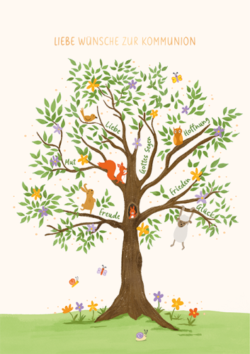 Diese besondere Doppelkarte zur Kommunion vereint liebevolle Gestaltung mit einer tiefen symbolischen Bedeutung. Der detailreiche Lebensbaum steht für Wachstum, Stärke und Geborgenheit – passend zu diesem wichtigen Schritt im Leben eines Kindes.