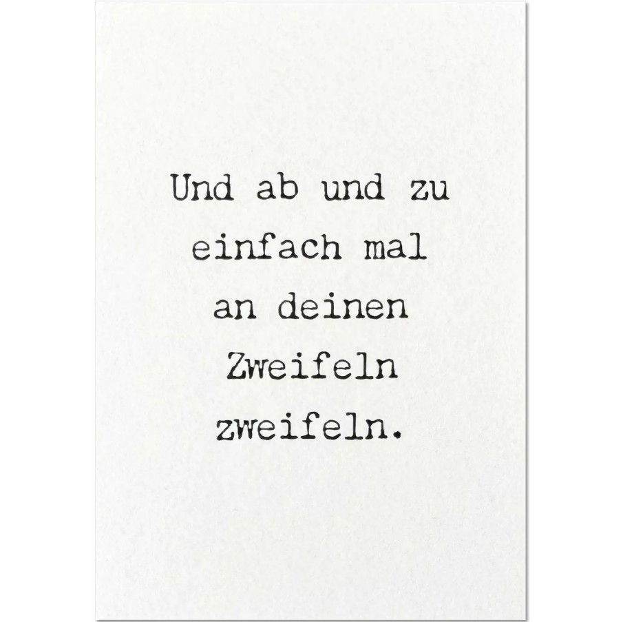 Versende eine originelle Botschaft mit der Postkarte von KEITCARDS. Die Aufschrift "Und ab und zu einfach mal an deinen Zweifeln zweifeln" macht die Karte zu einem echten Hingucker und lädt zum Schmunzeln und Nachdenken ein.