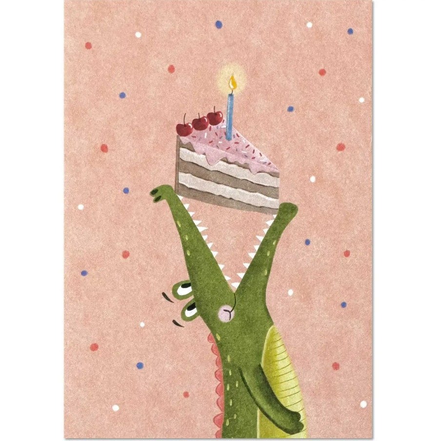 Versende Freude mit der Postkarte Krokodil von KEITCARDS. Das lustige Krokodil mit Kuchenstück im Maul macht die Karte zu einem echten Hingucker.