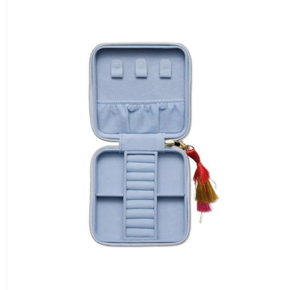 Das Schmuckkästchen besteht aus veganem Leder und ist mit einer goldfarbenen Folienprägung veredelt. Der stabile Reißverschluss mit goldfarbenem Zipper sorgt für sicheren Halt, während die abnehmbare, farbige Quaste einen verspielten Akzent setzt.
