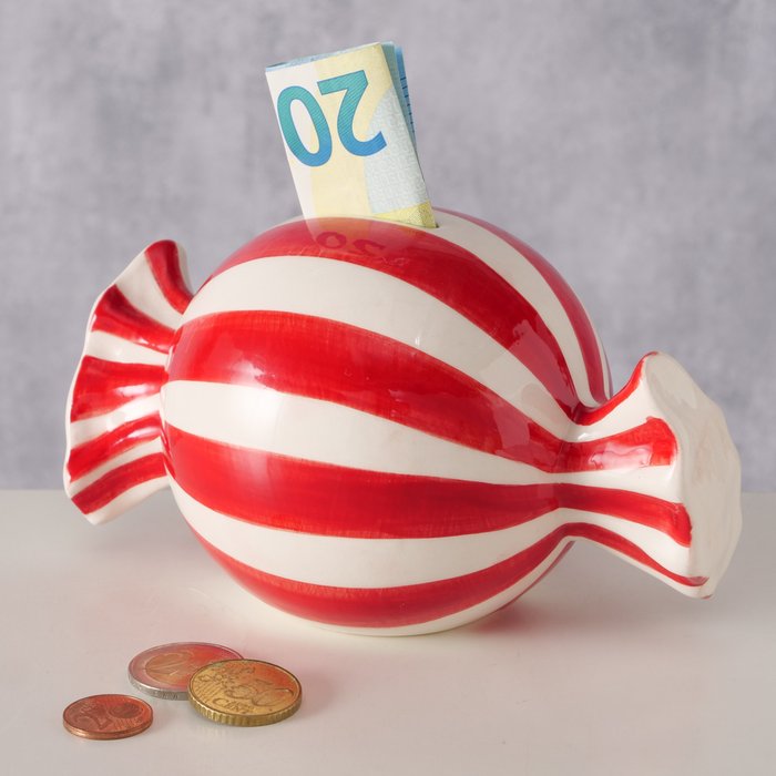 Du suchst eine Spardose, die sofort gute Laune macht? Dieses Bonbon im rot-weißen Streifenlook ist handgearbeitet aus Keramik und damit ein charmanter Blickfang auf Kommode, Regal oder Kinderzimmer-Fensterbank. Ob Urlaubskasse, Taschengeld oder Geldgeschenk – durch den Sparschlitz oben fütterst du Münzen und Scheine ganz leicht. Unten sorgt ein Gummistopfen dafür, dass du dein Erspartes bequem entnehmen kannst. Perfekt für Weihnachten (Zuckerstangen-Vibes), Geburtstage und alle, die Süßes lieben.