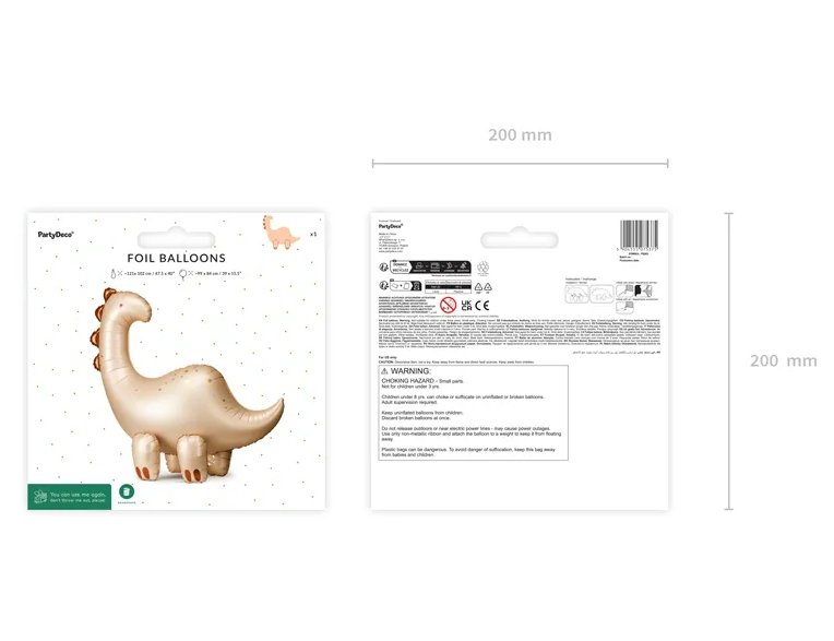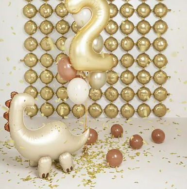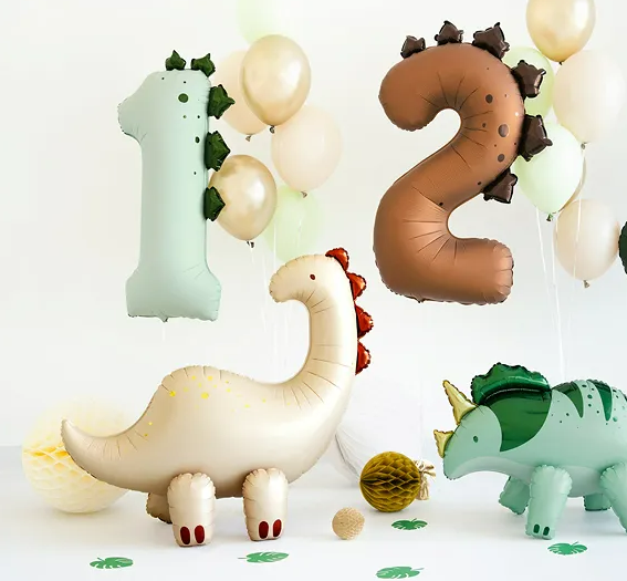 Der Ballon sorgt nicht nur für strahlende Kinderaugen, sondern macht sich auch super als Foto-Requisite oder als Teil einer Dino-Mottoparty zusammen mit anderen Ballons, Zahlenballons oder Deko-Elementen. Durch die beige Grundfarbe mit metallisch glänzenden Details wirkt der Dino modern und hochwertig.