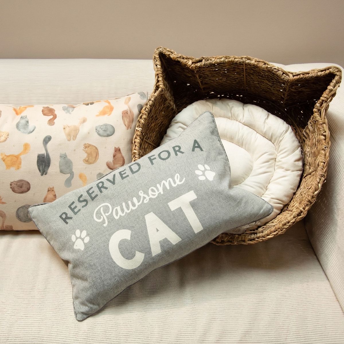 Diese graue Kissenhülle mit dem Schriftzug „Reserved for a Pawsome CAT“ ist das perfekte Statement für alle Katzenfans. Du bringst im Handumdrehen frischen Look aufs Sofa, ins Schlafzimmer oder in die Leseecke – einfach Bezug über dein Inlett ziehen und genießen.