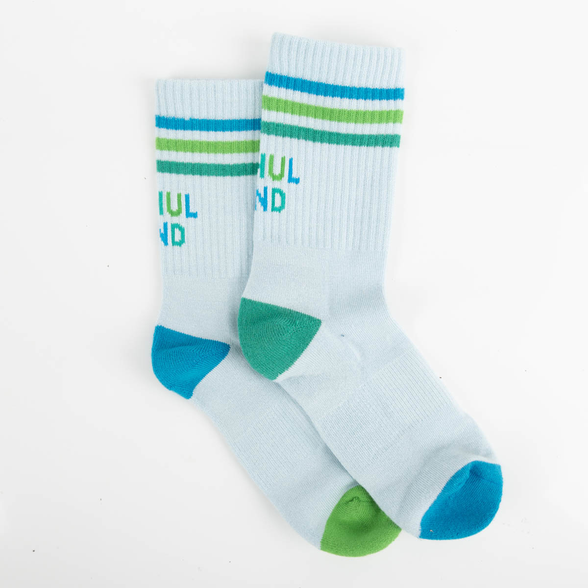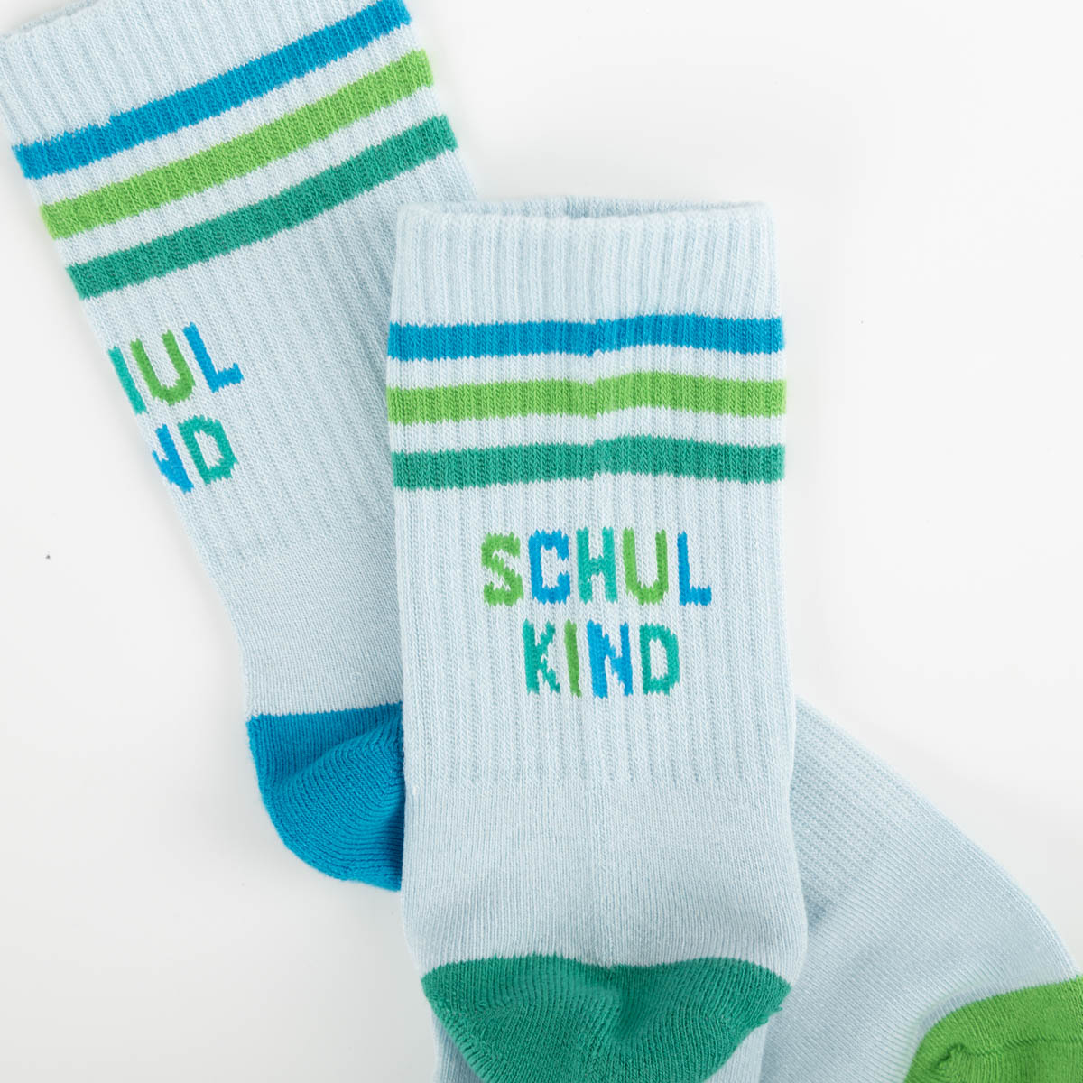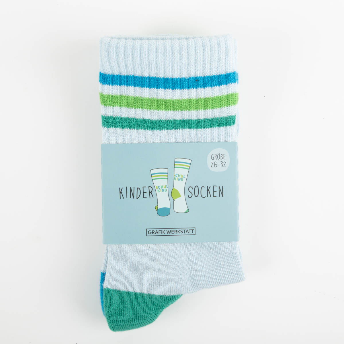 Die Kindersocken Schulkind von Grafik Werkstatt sind ein fröhlicher Begleiter für den Schulstart und machen jeden Schritt zu einem Abenteuer. Mit ihrem coolen Streifenmuster in Blau und Grün sowie dem eingestrickten Schriftzug „Schulkind“ sind sie perfekt für kleine Entdecker.