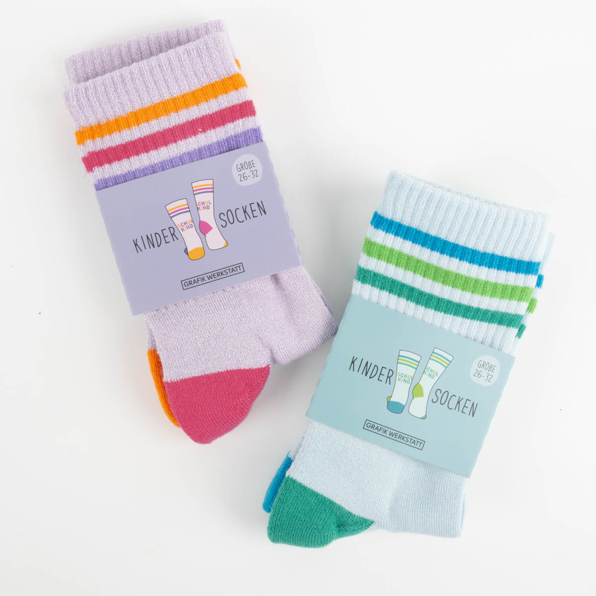 Die Kindersocken Schulkind von Grafik Werkstatt sind das perfekte Geschenk zum Schulstart! In fröhlichen Farben mit eingestricktem „Schulkind“-Schriftzug und funkelndem Glitzergarn sorgen sie für gute Laune bei jedem Schritt.