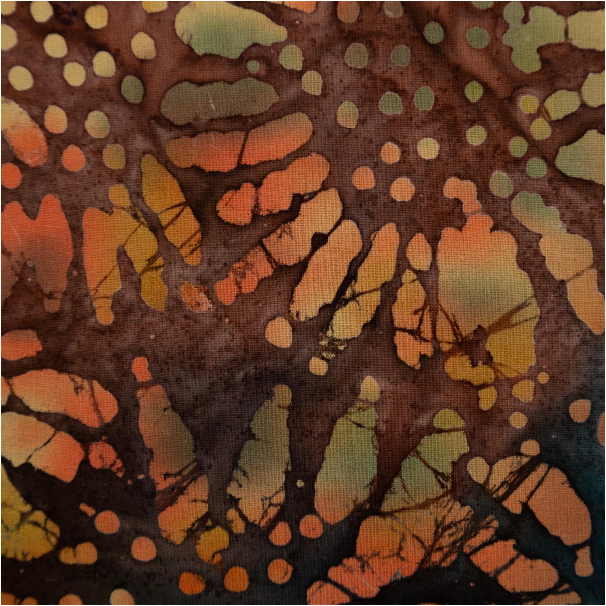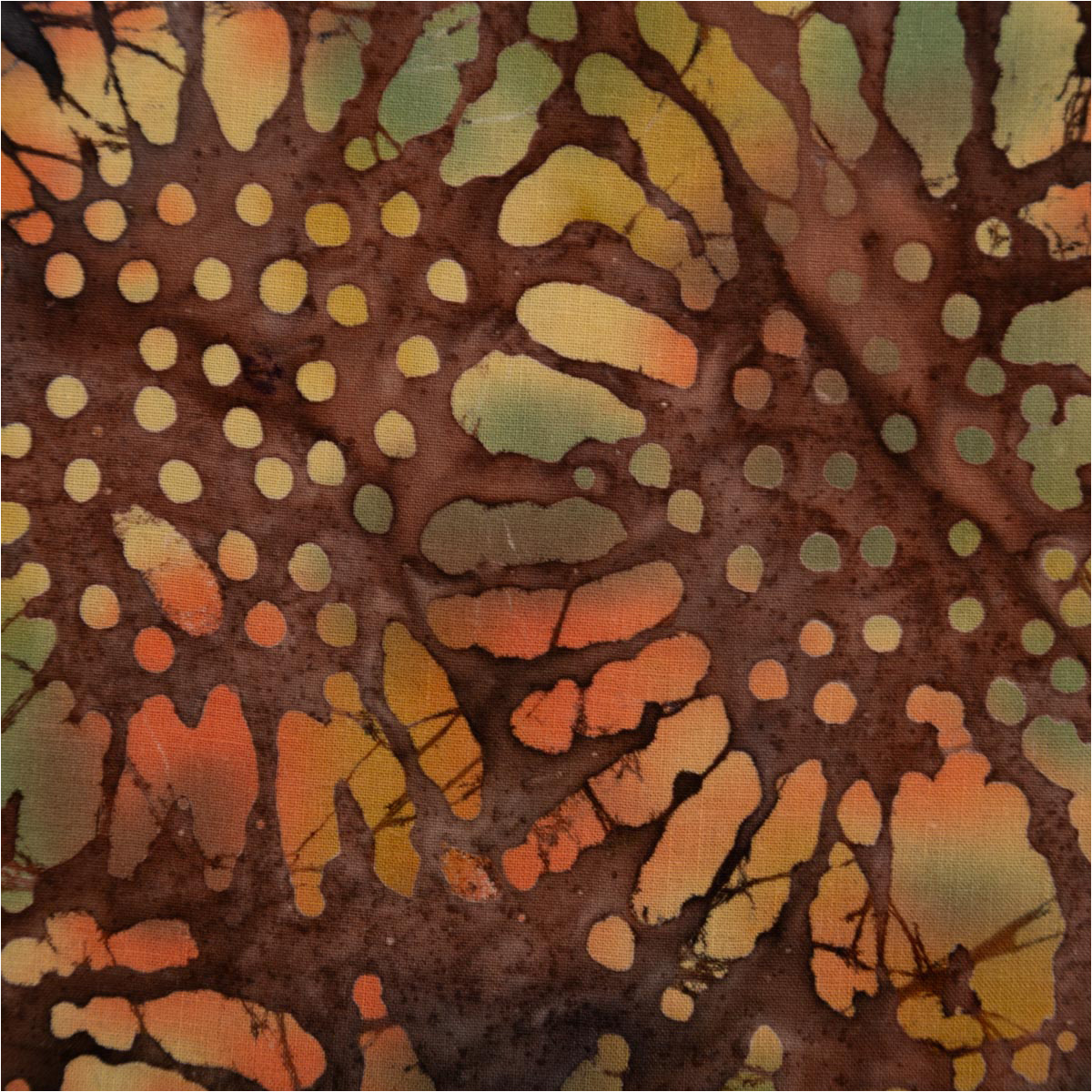 Jedes Stück ist ein kleines Unikat: Das Boho inspirierte Batik-Muster in Grün und Orange verleiht dem Stoff einen natürlichen, kreativen Look – ideal für individuelle Nähprojekte.