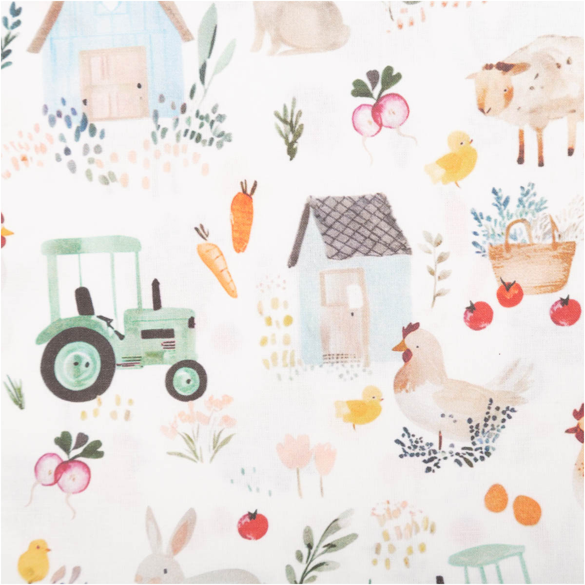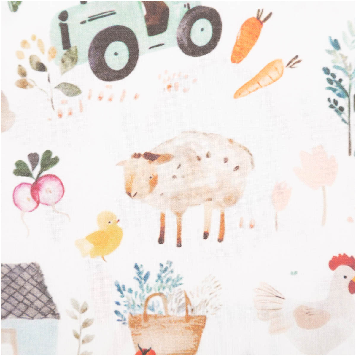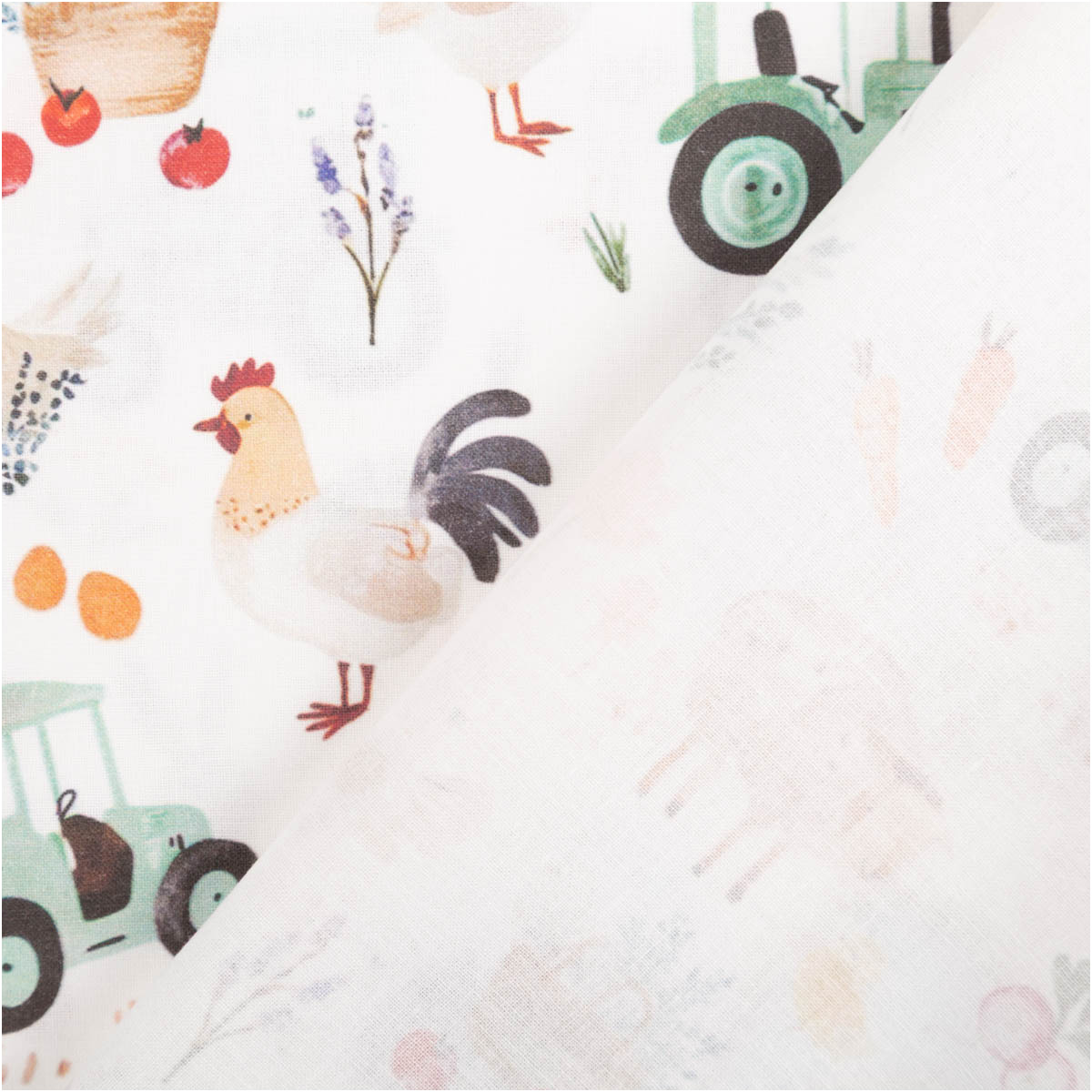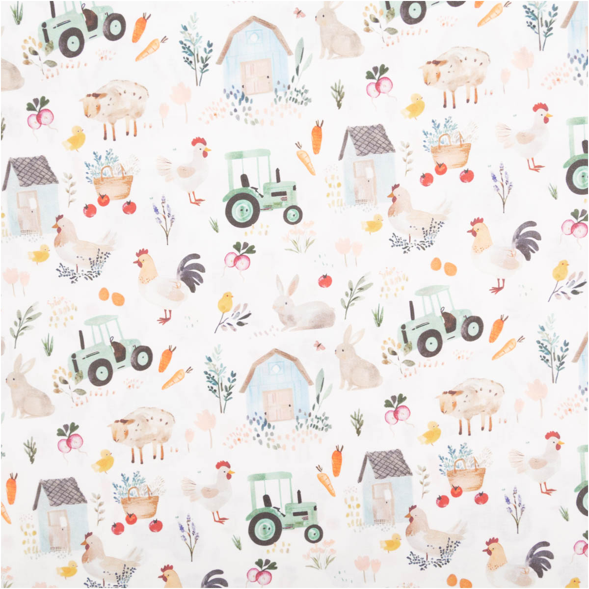 Dieser hochwertige Baumwollstoff Popeline mit liebevollem Bauernhof-Digitaldruck bringt ländliche Motive direkt in deine Nähprojekte. Traktoren, Hühner, Schafe, Hasen, Gemüse und kleine Bauernhäuser verteilen sich harmonisch auf weißem Grund in sanften Blau-, Grün- und Naturtönen. Das exklusive Dessin aus Frankreich wirkt ruhig, kindgerecht und detailverliebt zugleich.