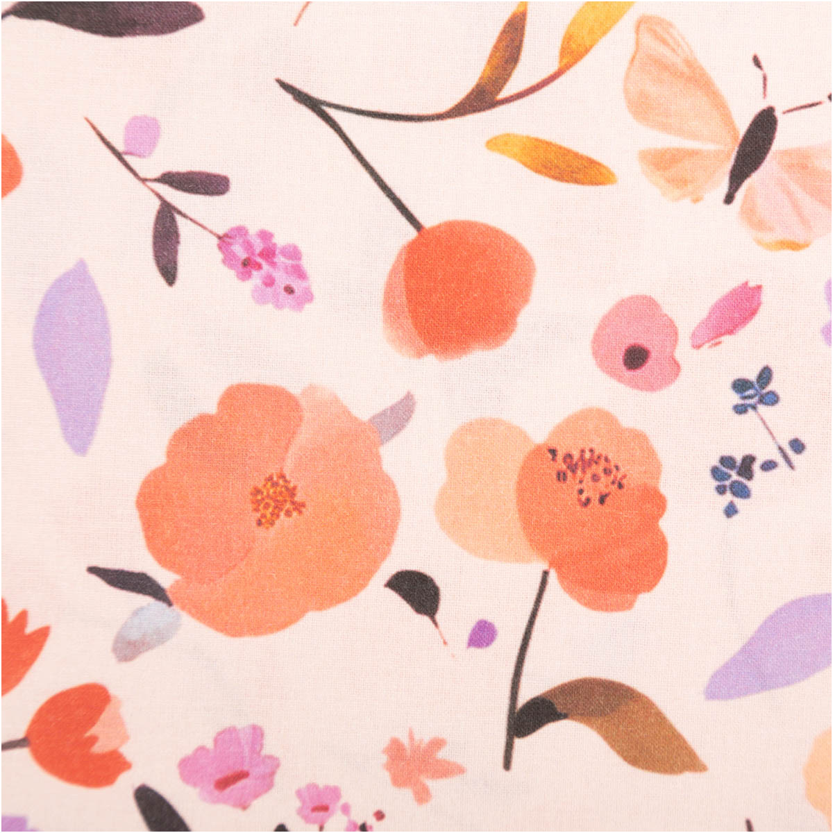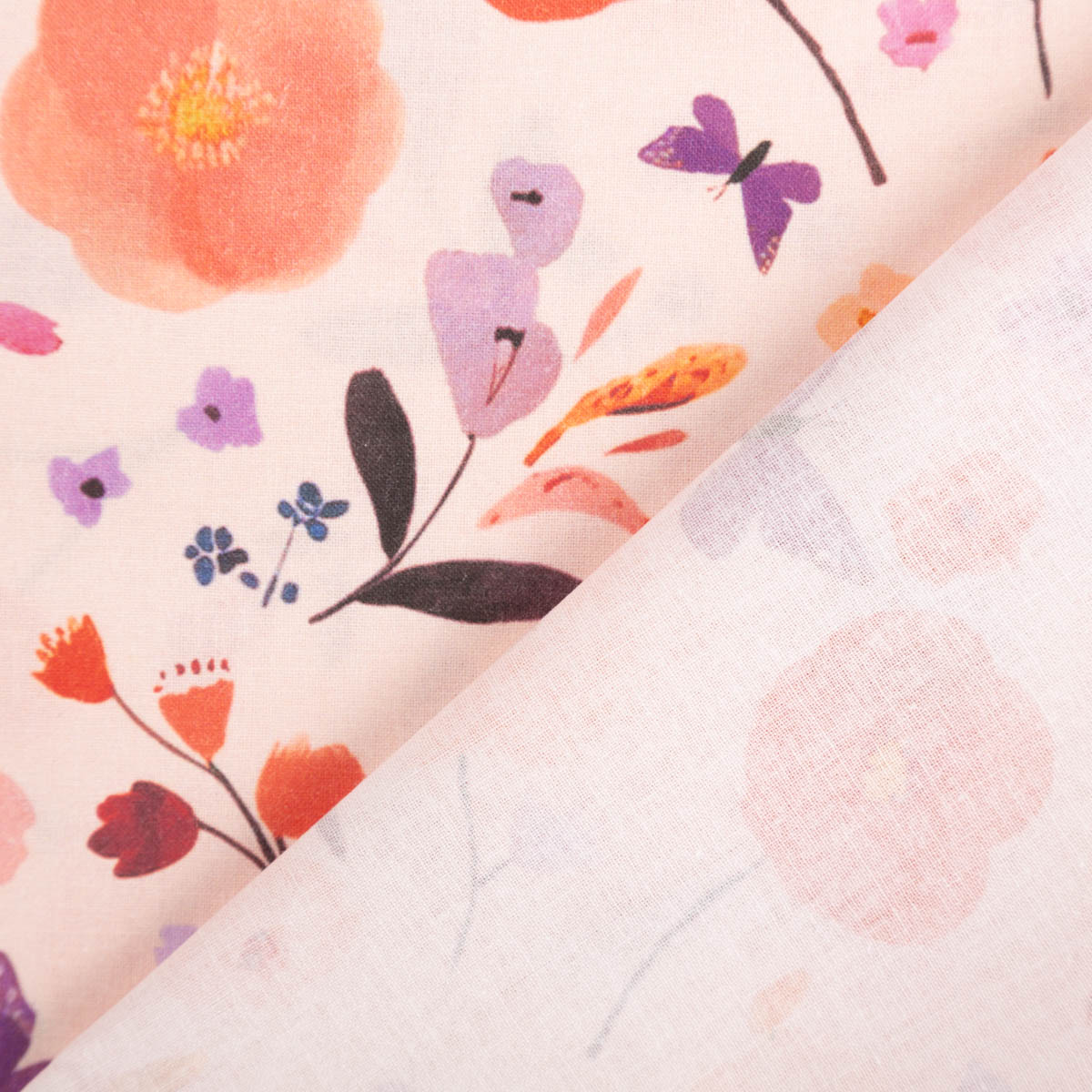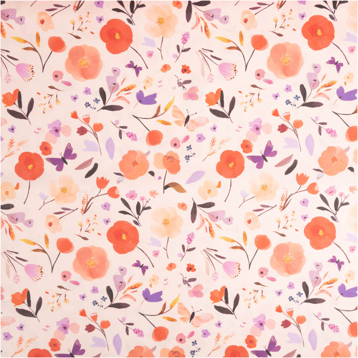 Baumwollstoff Popeline Digitaldruck Fisal – Blumen & Schmetterlinge in Pfirsich, Rot und Lila