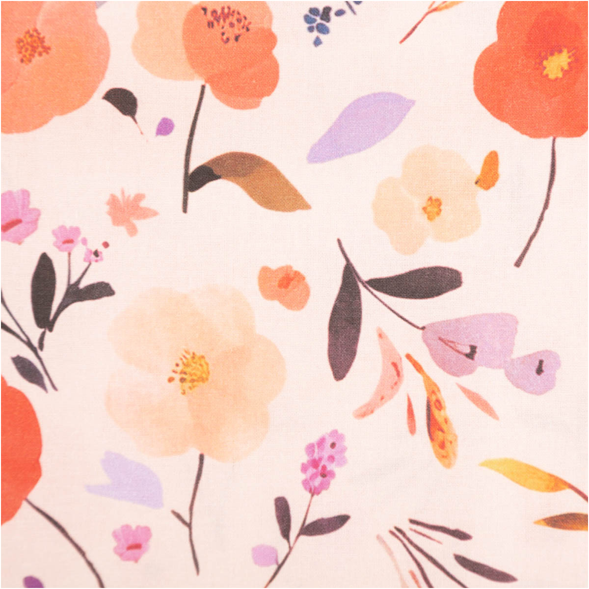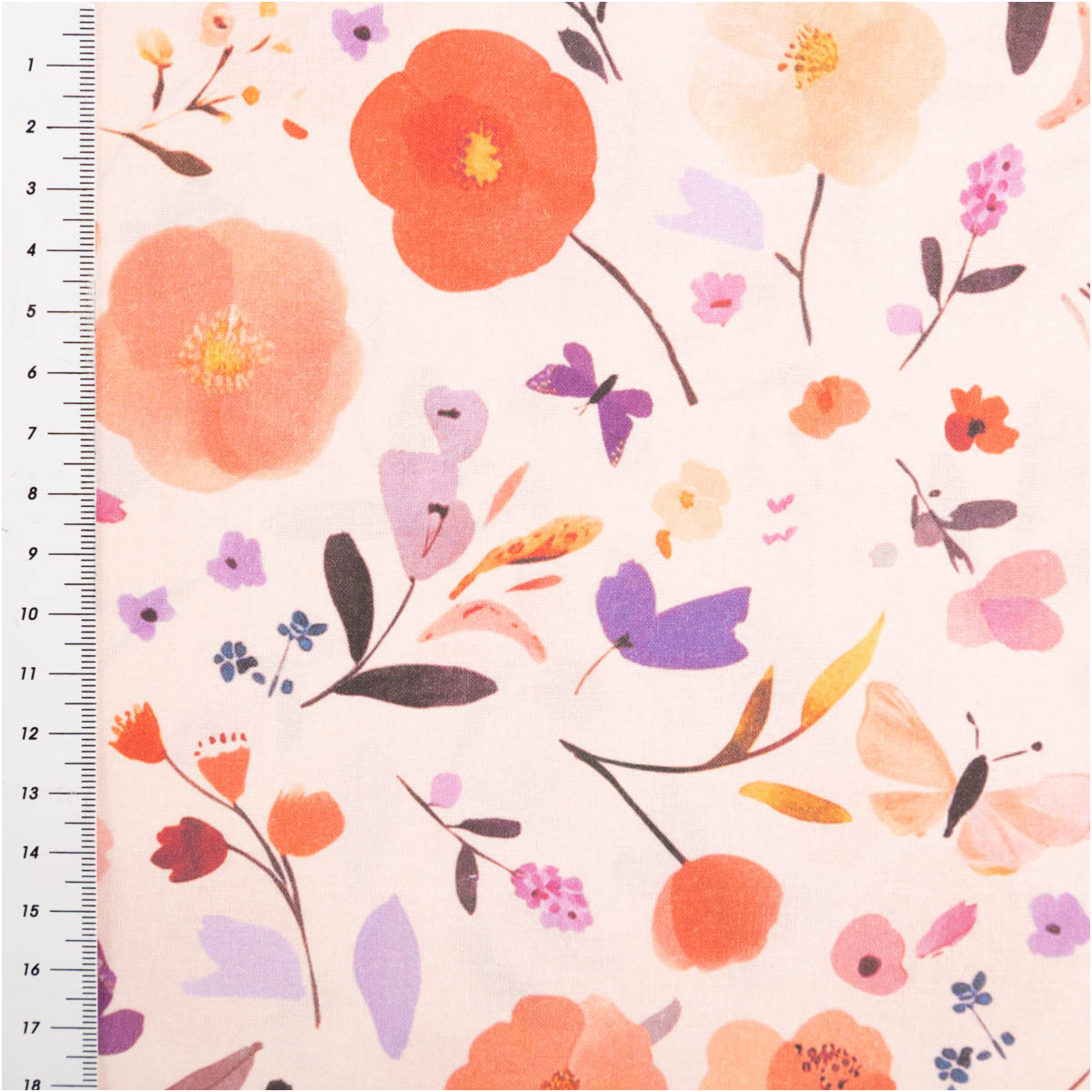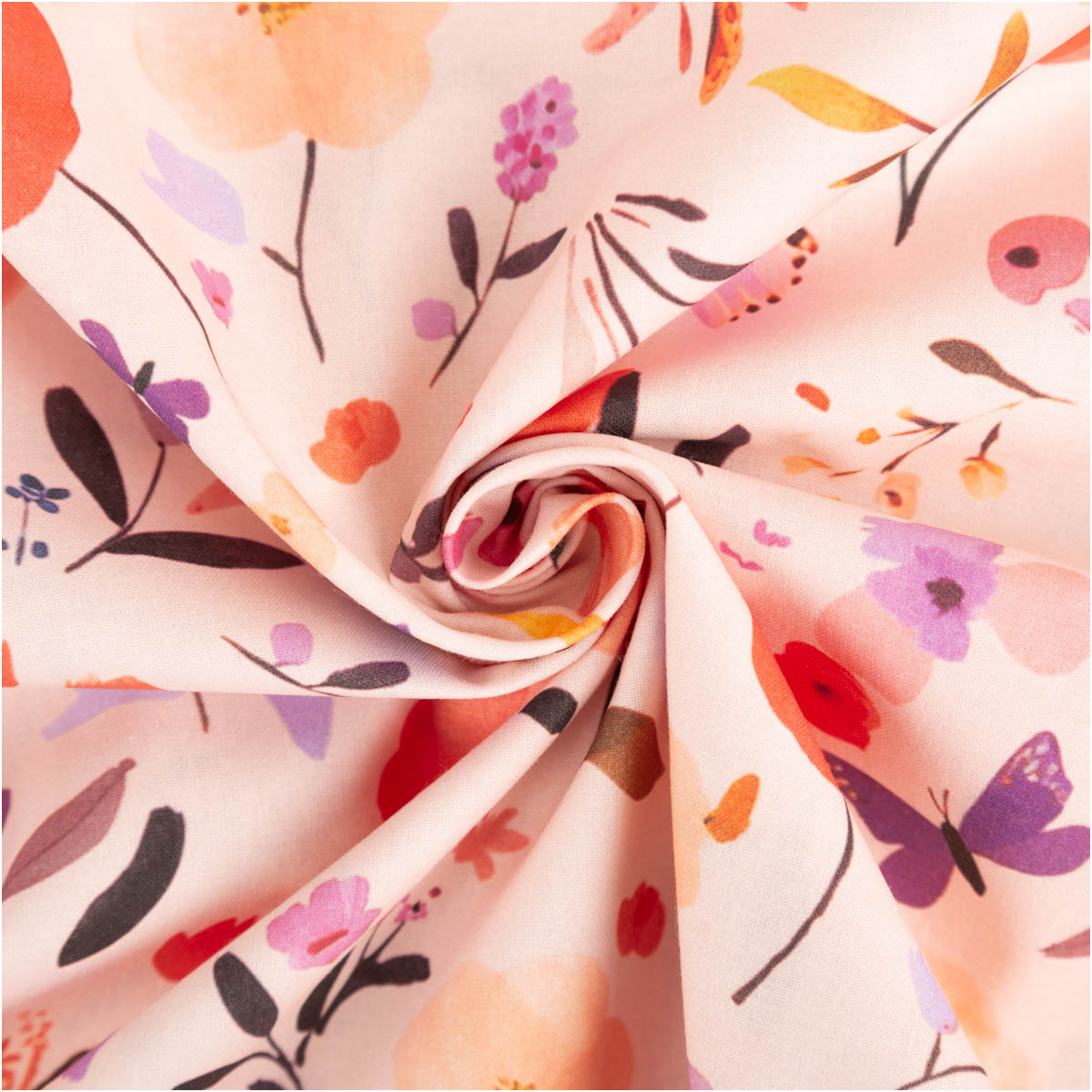 Baumwollstoff Popeline Digitaldruck Fisal – Blumen & Schmetterlinge in Pfirsich, Rot und Lila