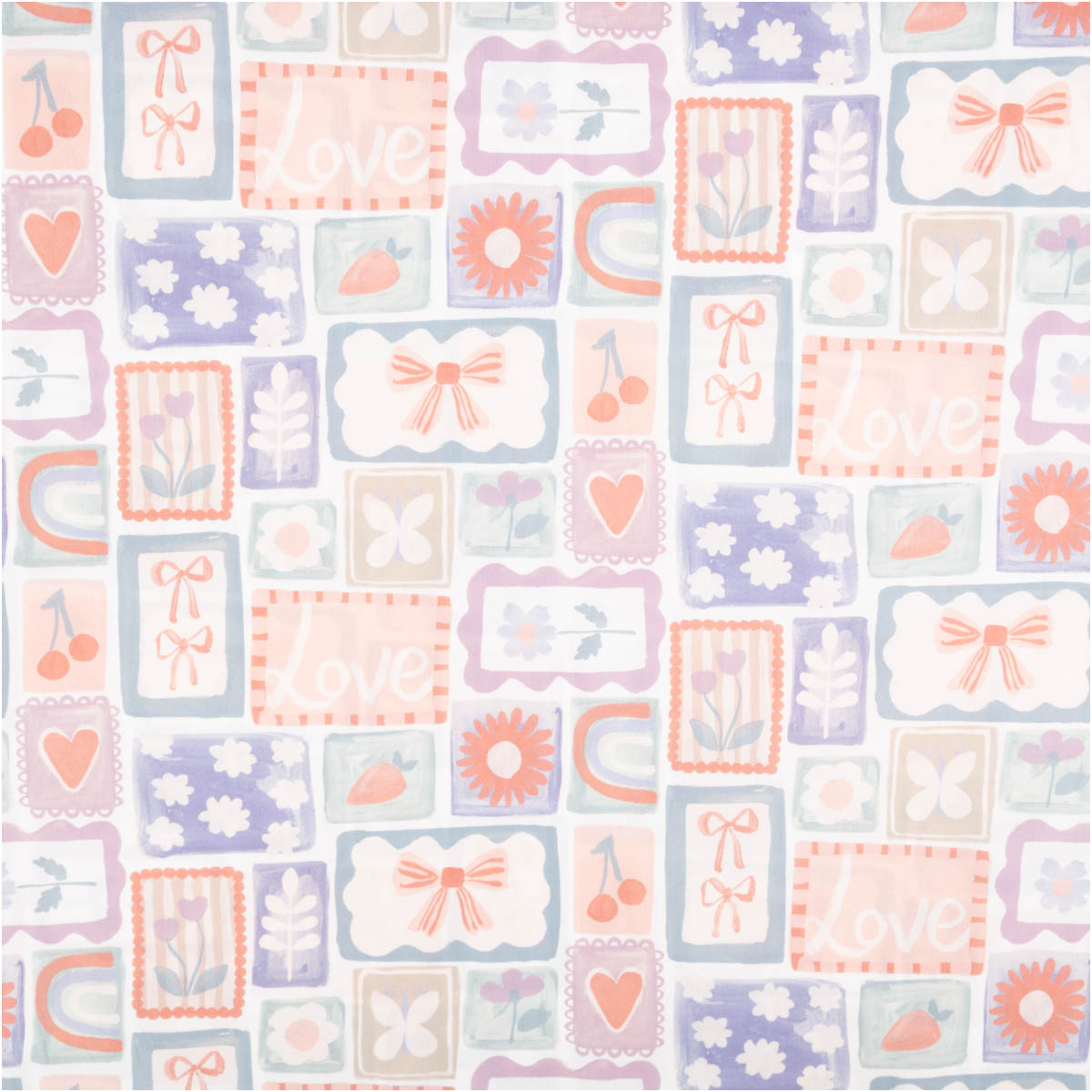 Zartes Patchwork-Design: kleine Kacheln mit Schleifen, Blumen und Kirschen in Pastelltönen auf weißem Grund, ideal für romantische Nähprojekte
