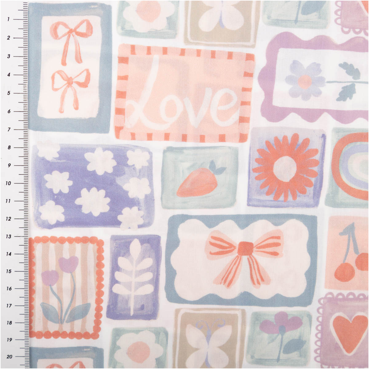 Baumwollstoff Popeline „Patchwork“ – Schleife, Blume & Kirsche, weiß/pastell, 1,48 m breit