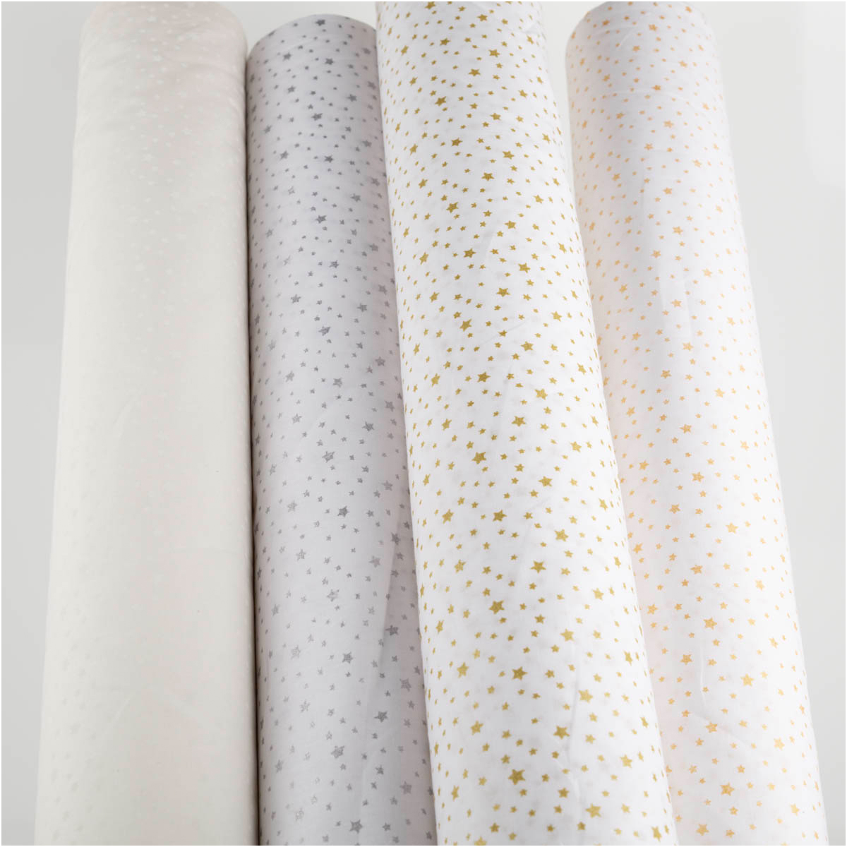 Baumwollstoff mit altgoldenen Sternchen auf weißem Grund