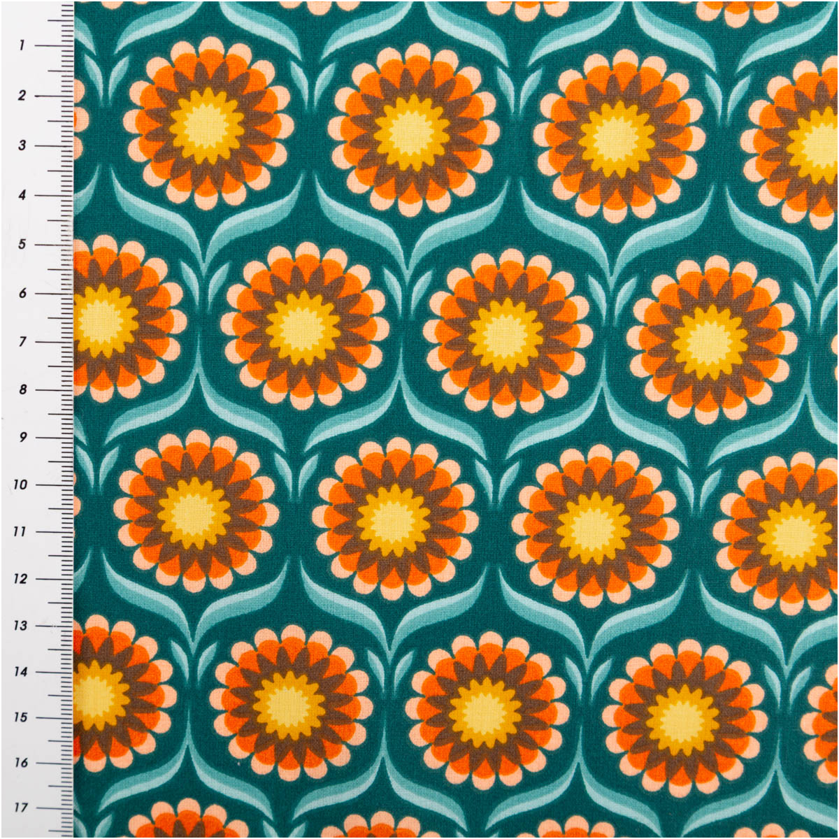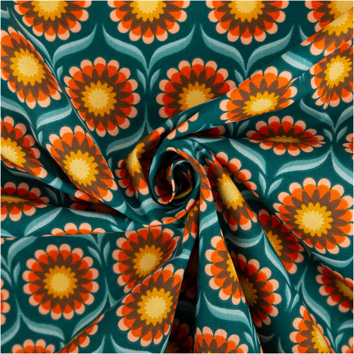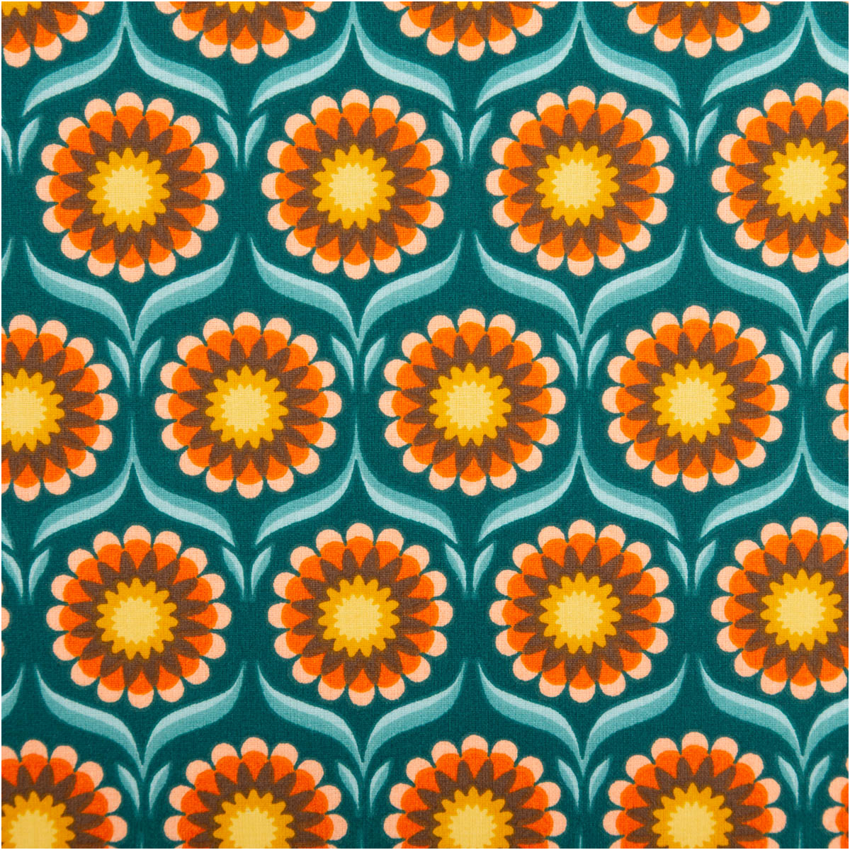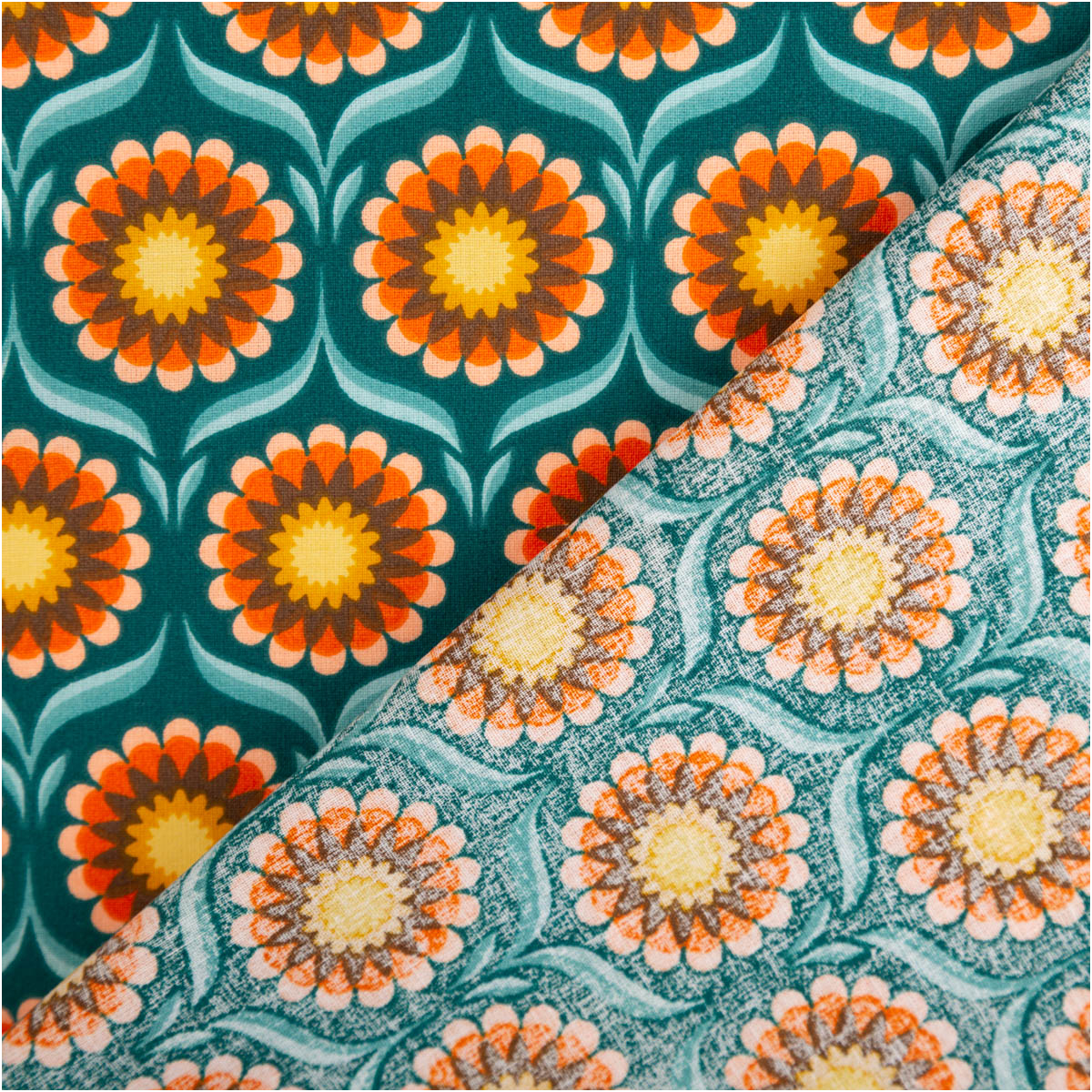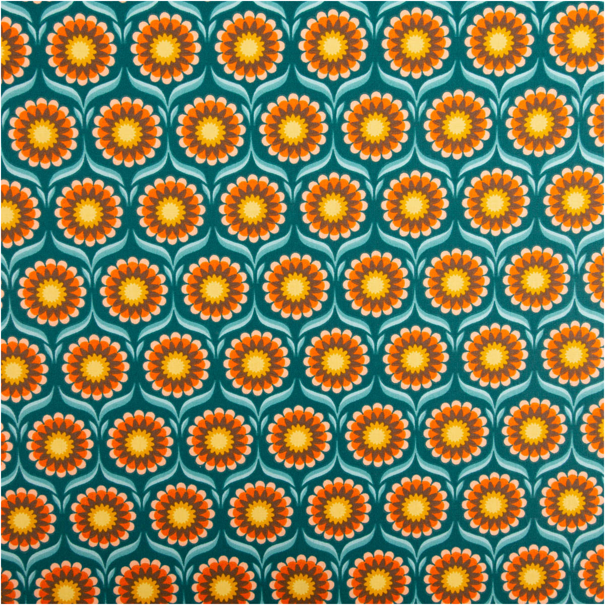 Baumwollstoff Meterware Perkal mit Retro Blumen in Türkis, Orange und Gelb