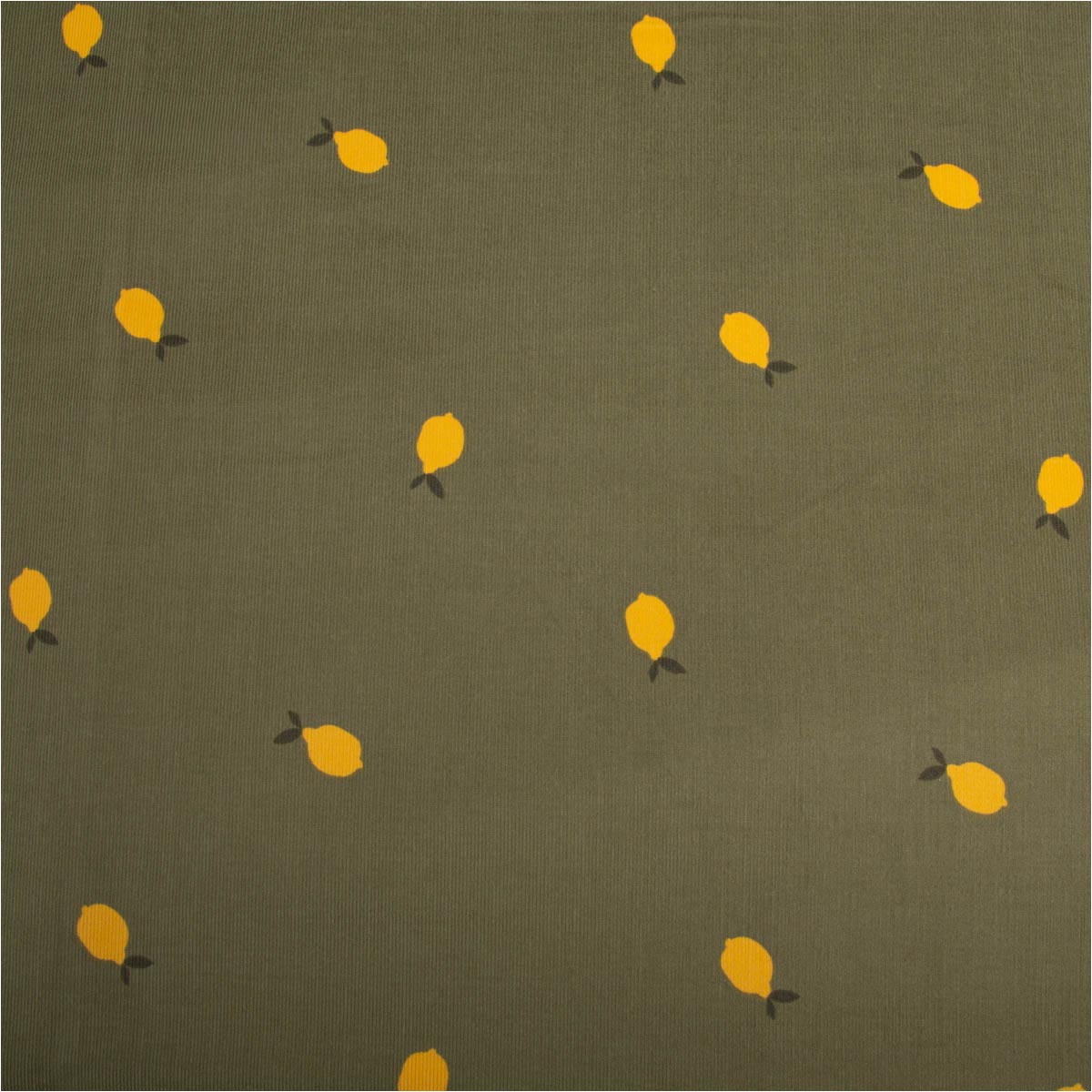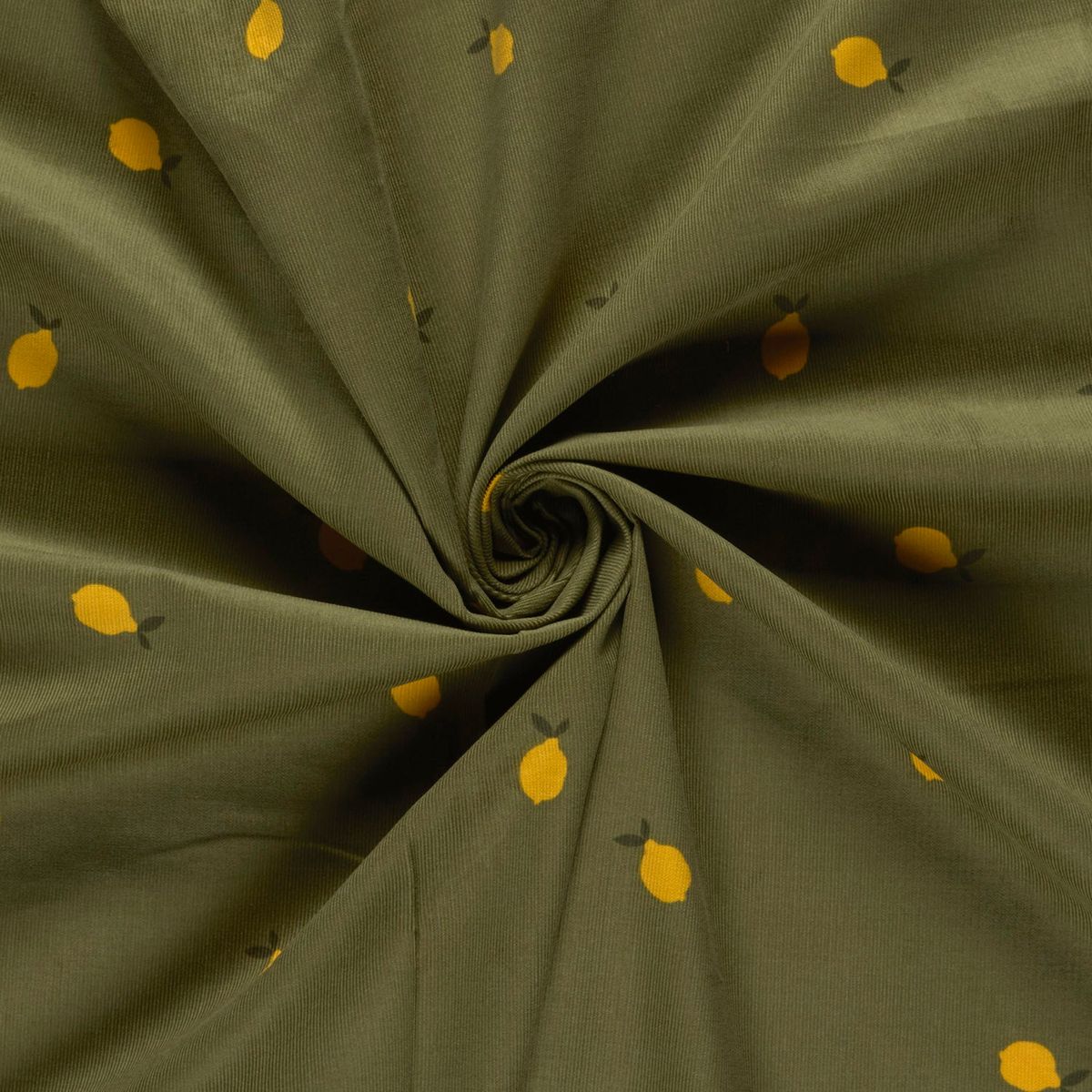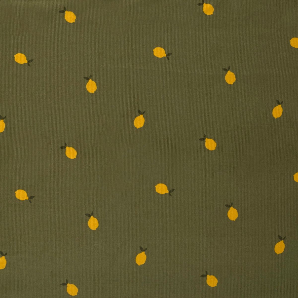 Dieser Feincord aus 100 % Baumwolle überzeugt mit feiner 21W-Rippenstruktur und samtigem Griff. Das fruchtige Zitronen-Motiv auf olivgrünem Grund wirkt modern und sorgt bei Kleidung, Accessoires und Deko für gute Laune – ideal für Projekte für Groß und Klein.