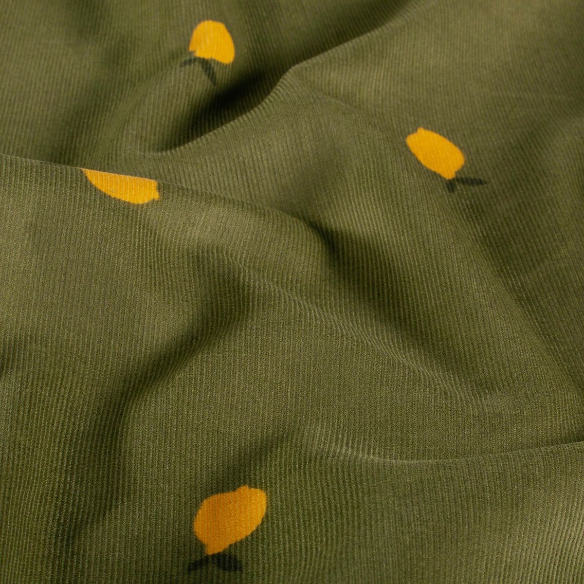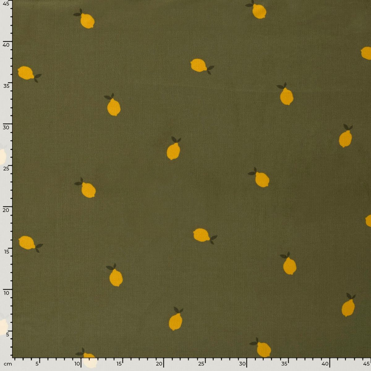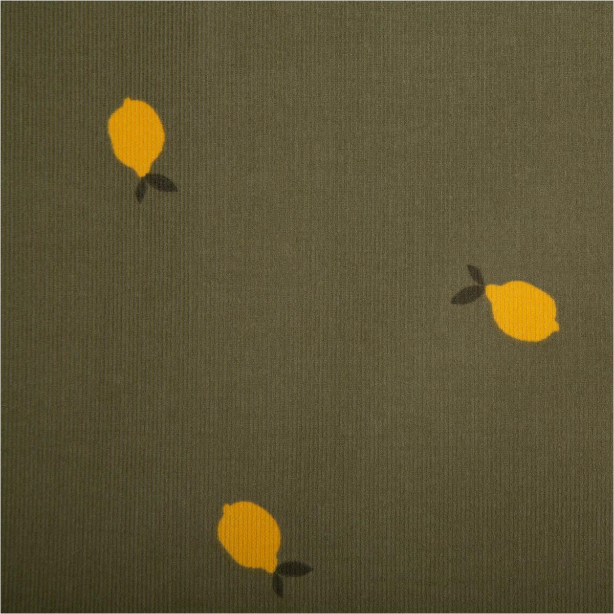 Dieser Feincord aus 100 % Baumwolle überzeugt mit feiner 21W-Rippenstruktur und samtigem Griff. Das fruchtige Zitronen-Motiv auf olivgrünem Grund wirkt modern und sorgt bei Kleidung, Accessoires und Deko für gute Laune – ideal für Projekte für Groß und Klein.
