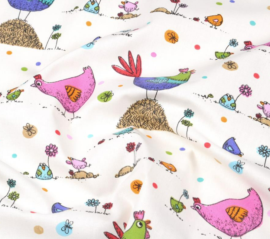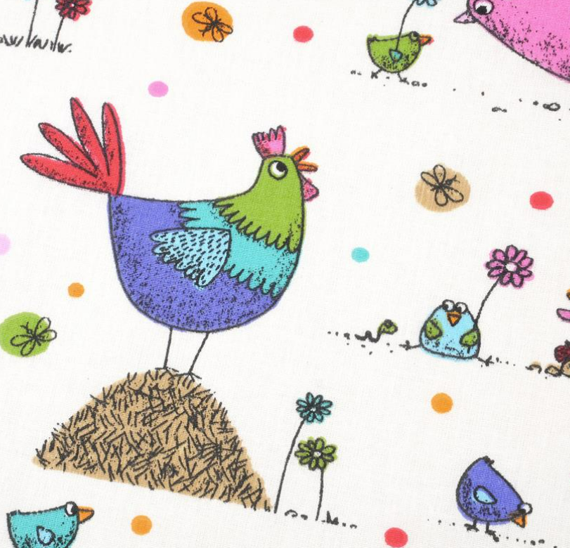 Farbenfroher Baumwollstoff in Cretonne-Qualität mit bunten Hühnern, kleinen Küken, Blumen und Punkten auf weißem Hintergrund