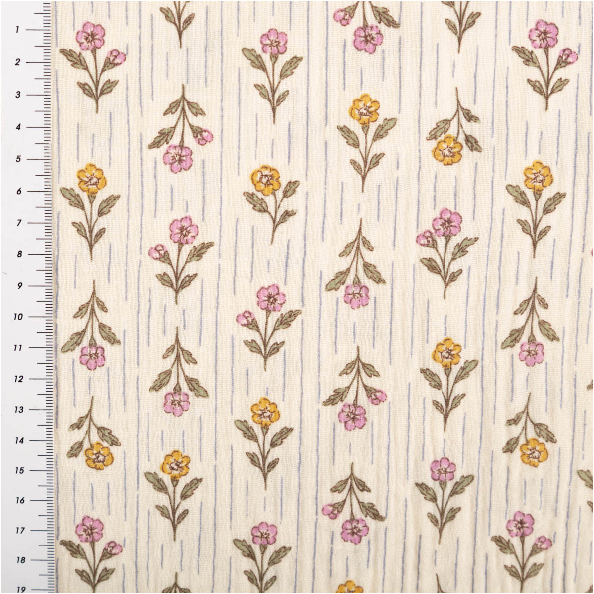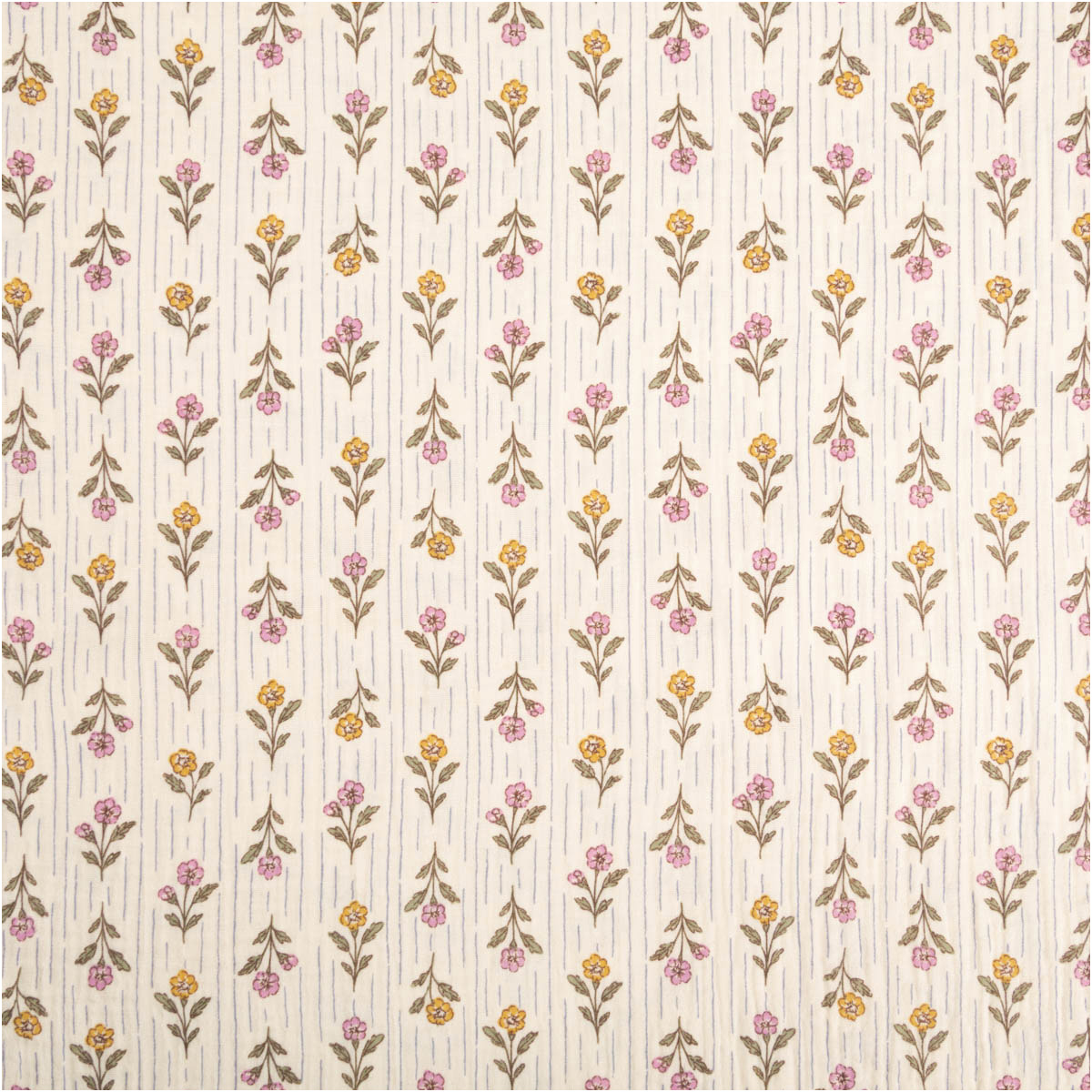 Musselin Stoff aus Baumwolle mit Blümchen- und Streifen-Dessin in Ecru, Rosa, Gelb und Grün