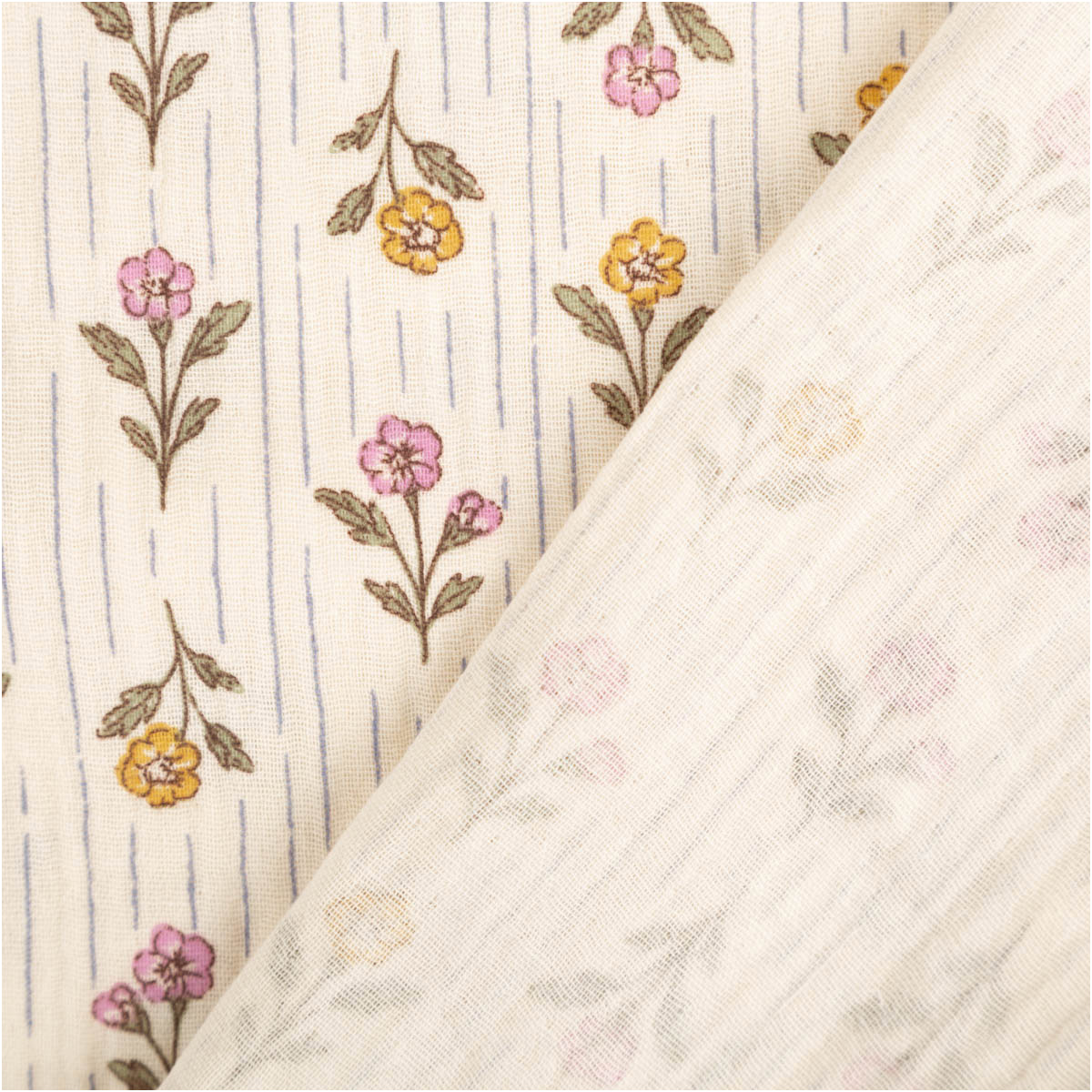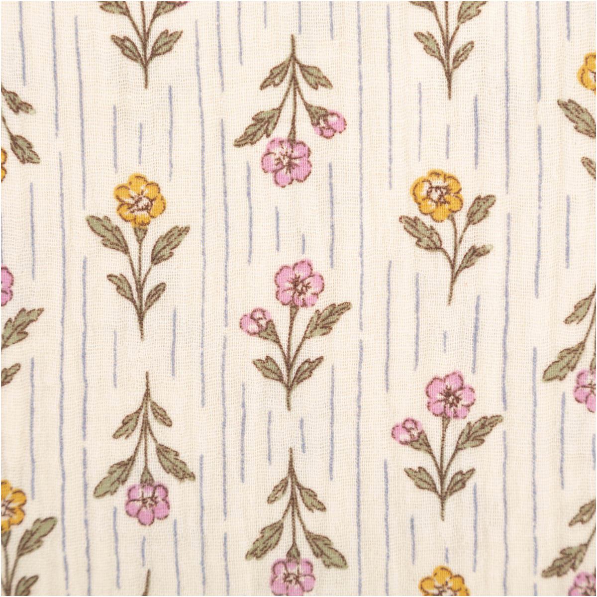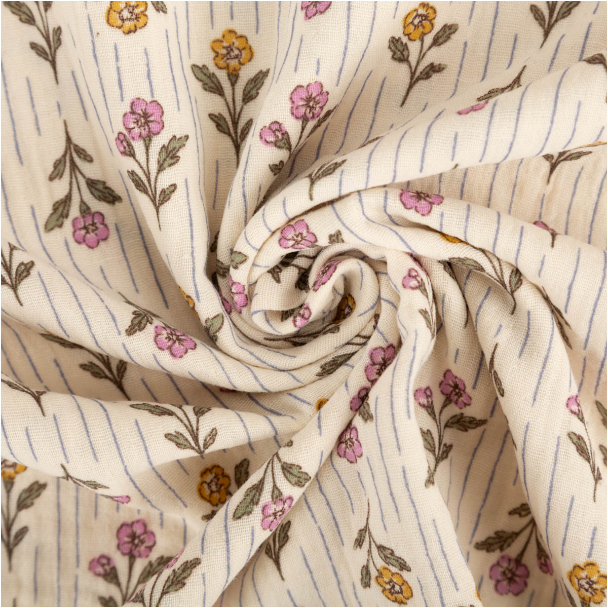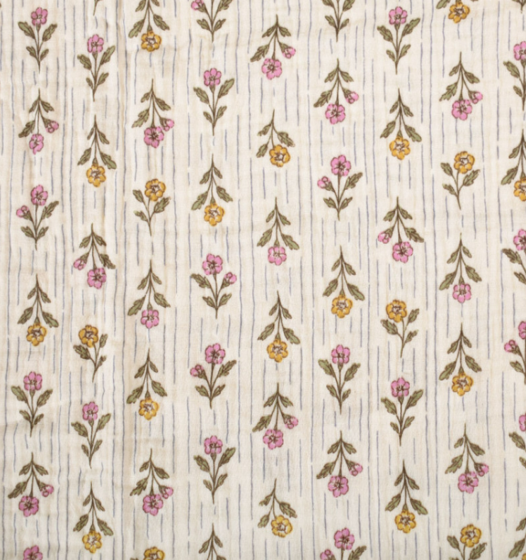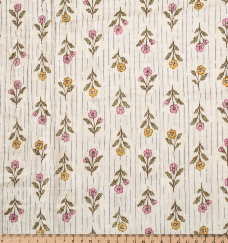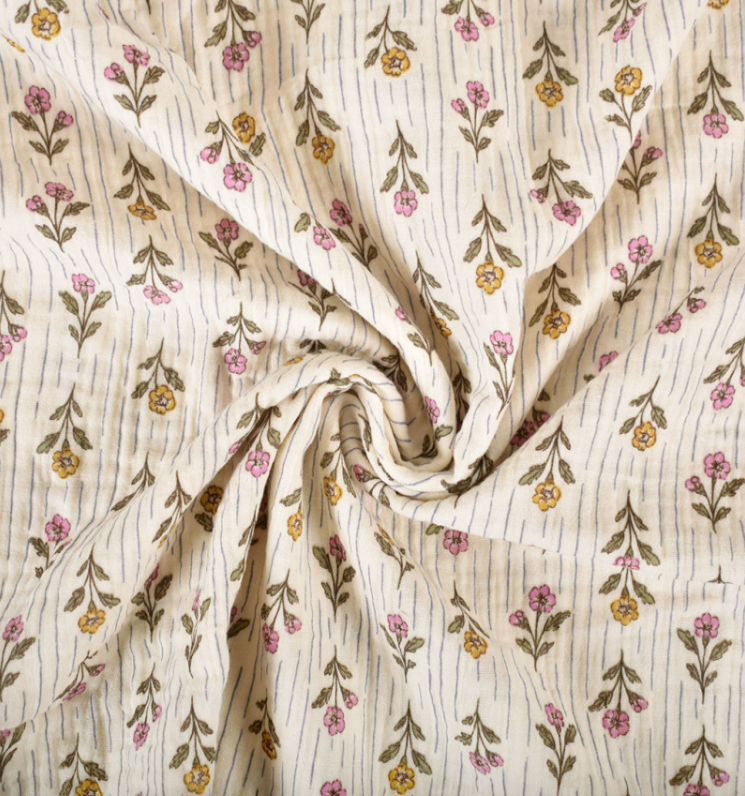 Dieser hochwertige Musselin Stoff aus 100 % Baumwolle überzeugt mit dem exklusiven französischen Dessin „Aesa“. Zarte Blümchen in Rosa und Gelb wechseln sich harmonisch mit feinen, senkrechten Streifen ab und verleihen dem Stoff eine ruhige, nostalgische Ausstrahlung. Die natürliche Farbpalette auf ecrufarbenem Grund wirkt zeitlos, freundlich und liebevoll – ideal für Baby-, Kinder- und Wohlfühlprojekte.