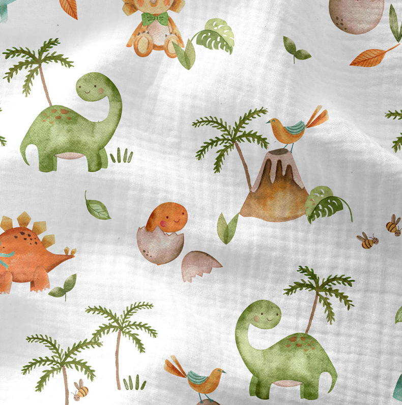 Dieser hochwertige Musselin Stoff aus 100 % Baumwolle begeistert mit dem exklusiven französischen Dessin „Dinus“. Niedliche Dinosaurier, Palmen, kleine Vögel und liebevolle Details verteilen sich harmonisch auf weißem Grund. Das Design wirkt freundlich, verspielt und kindgerecht – perfekt für kleine Dino-Fans und kreative Nähprojekte rund um Baby und Kind.