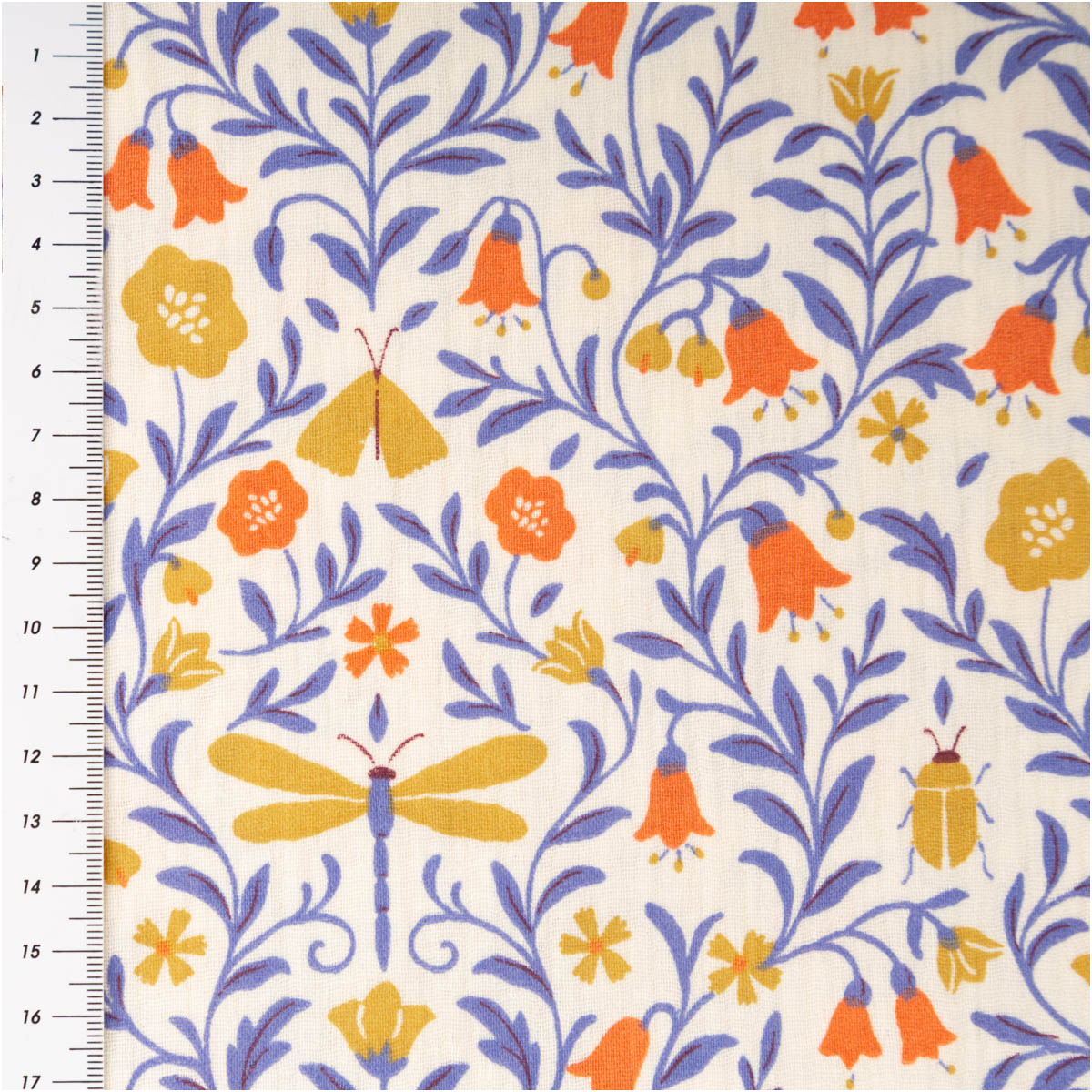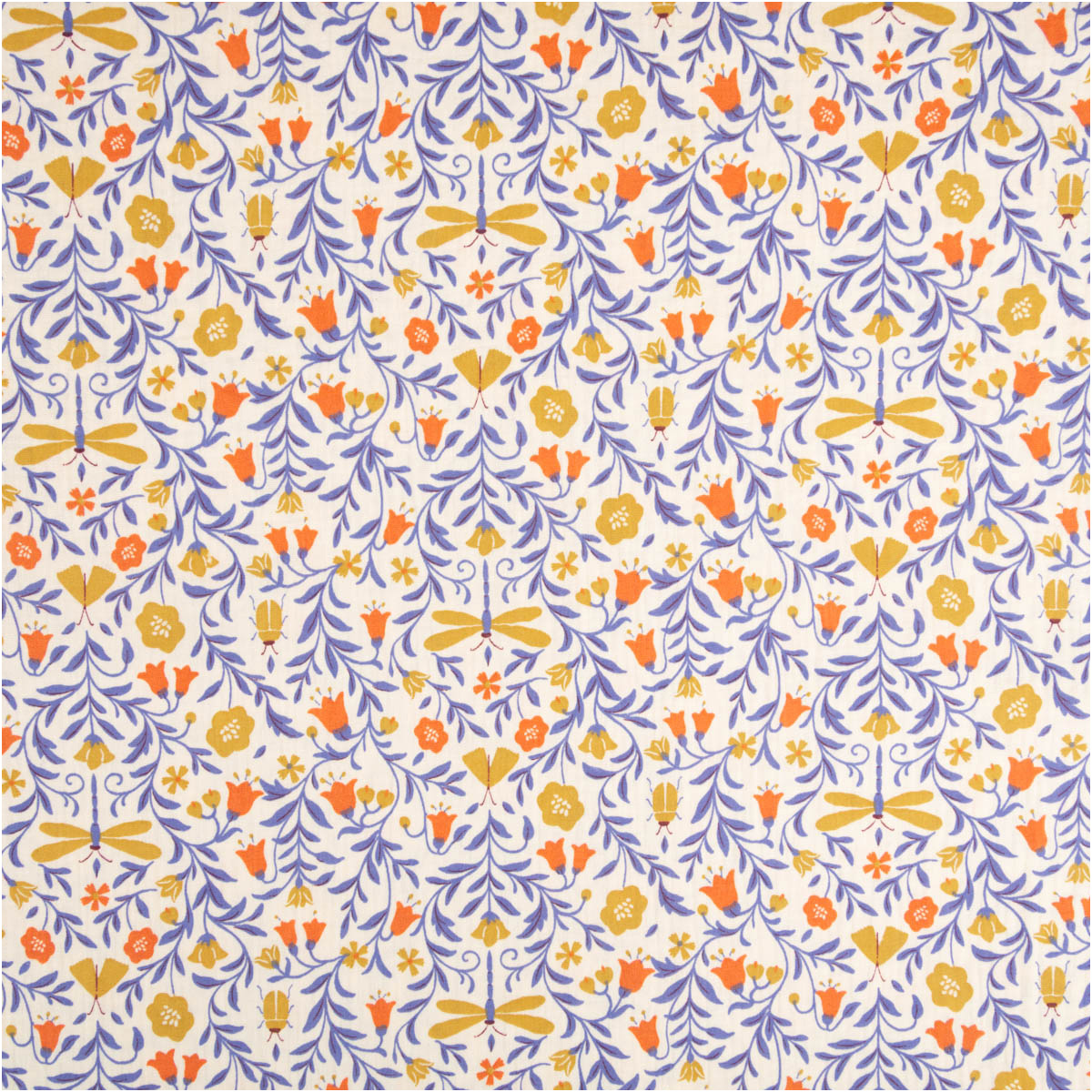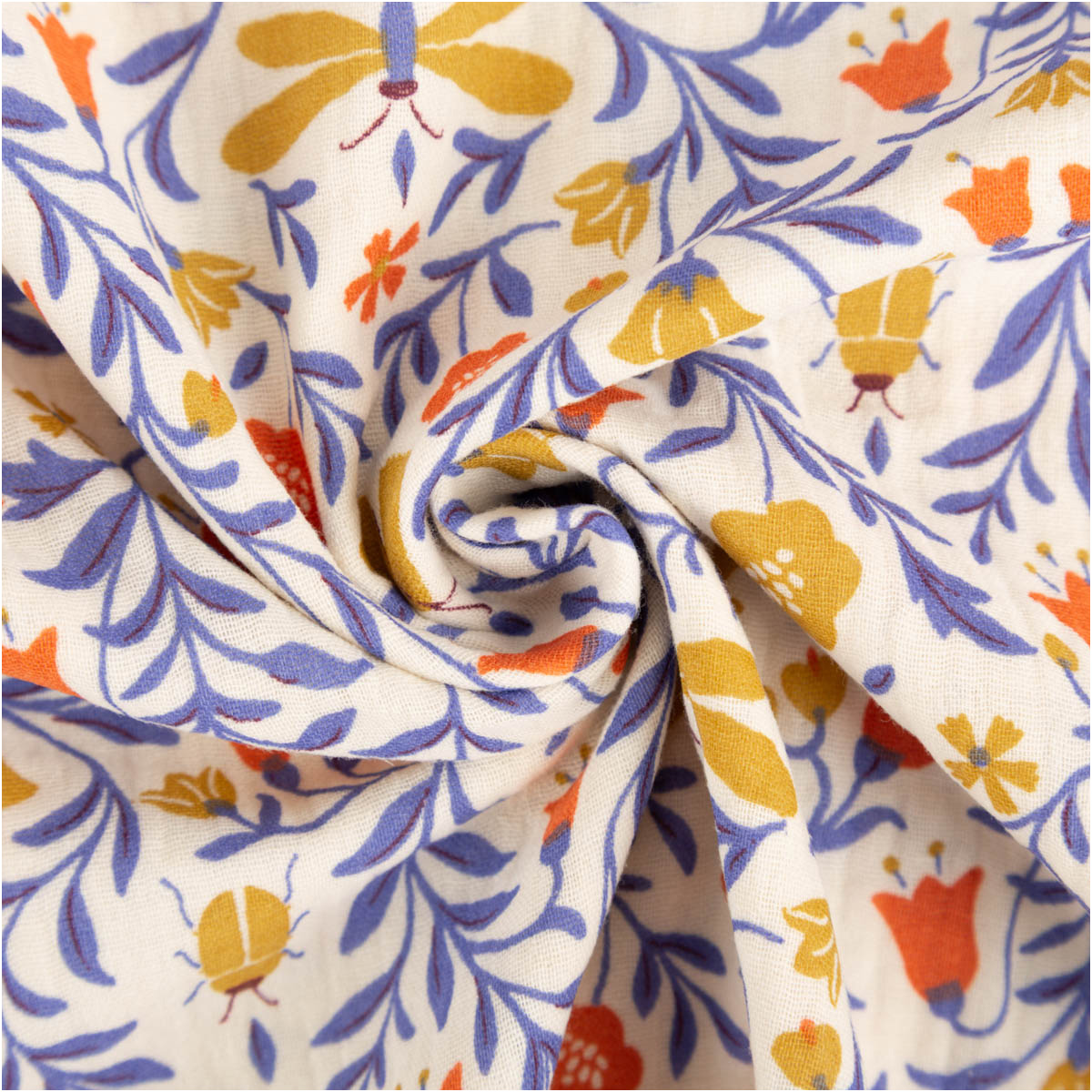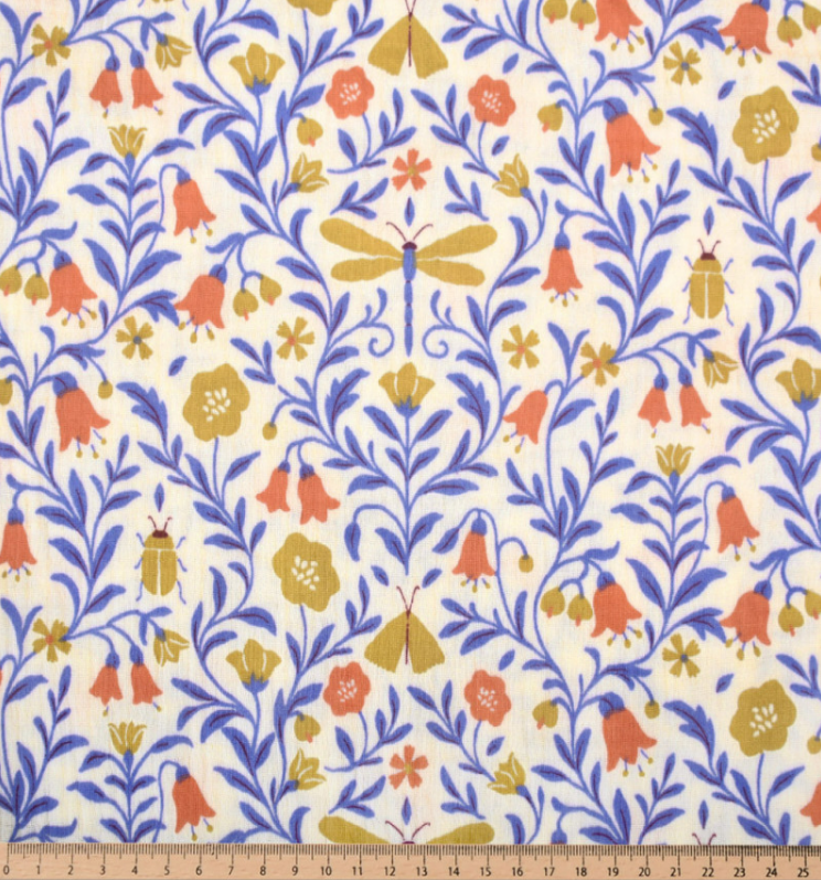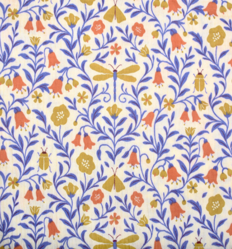 Musselin Stoff aus Baumwolle mit Blumenranken, Schmetterlingen und Käfern in Ecru, Blau und Gelb