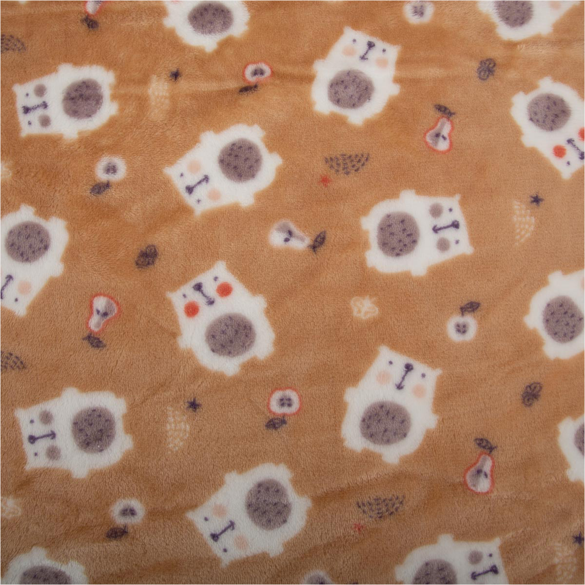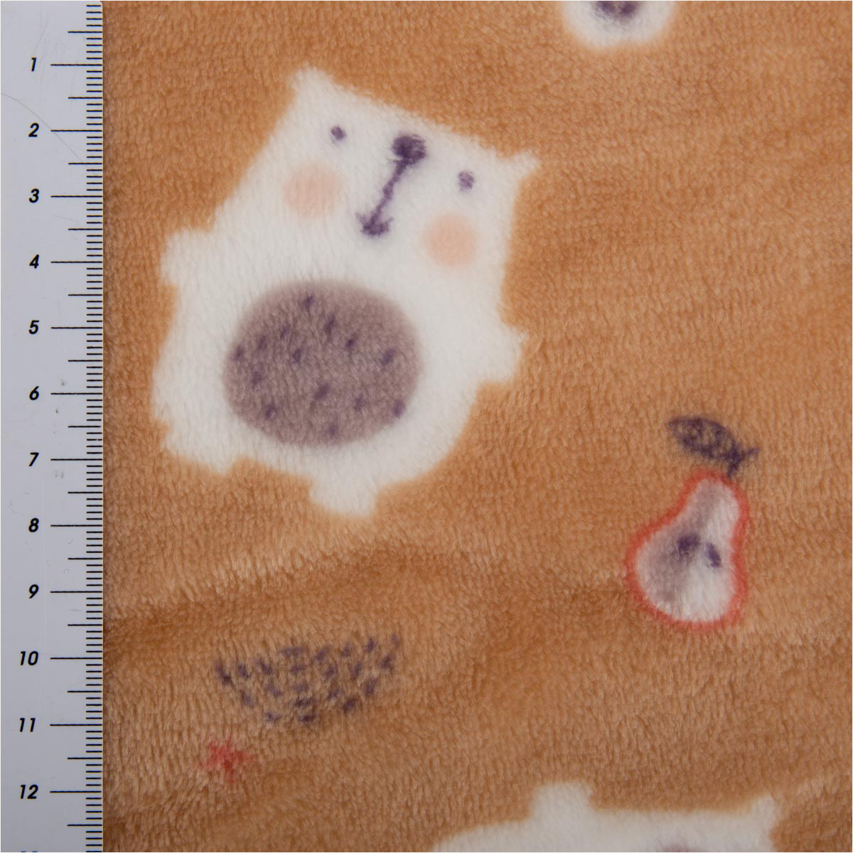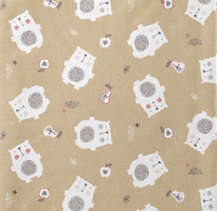 Kuschelweicher Fleecestoff in Beige mit Bärchen, Birnen und Äpfeln, Breite ca. 1,45 m