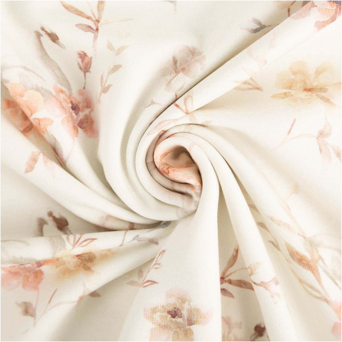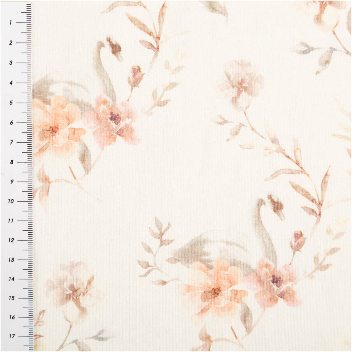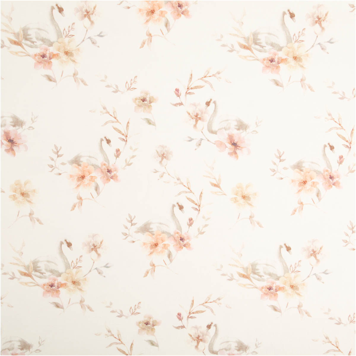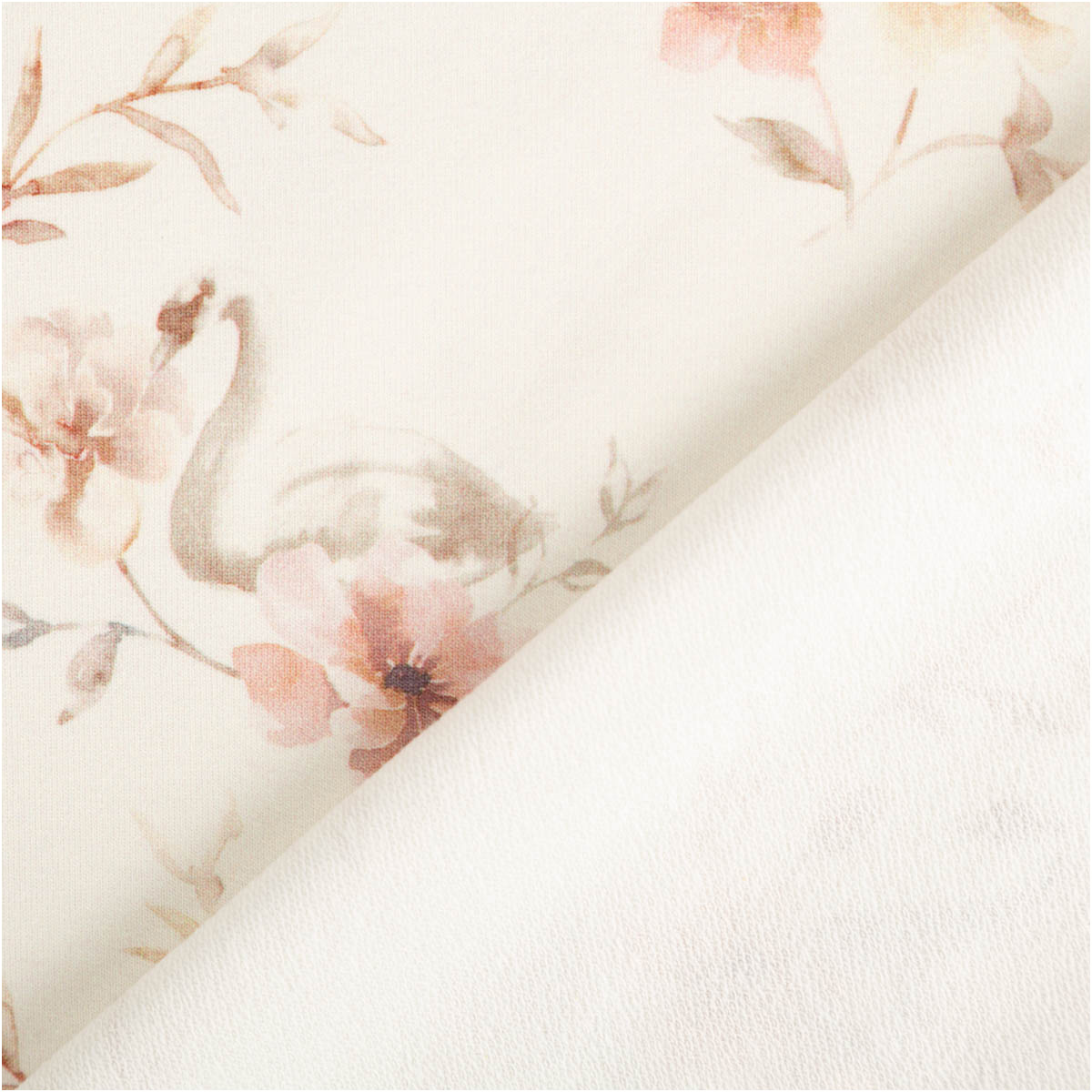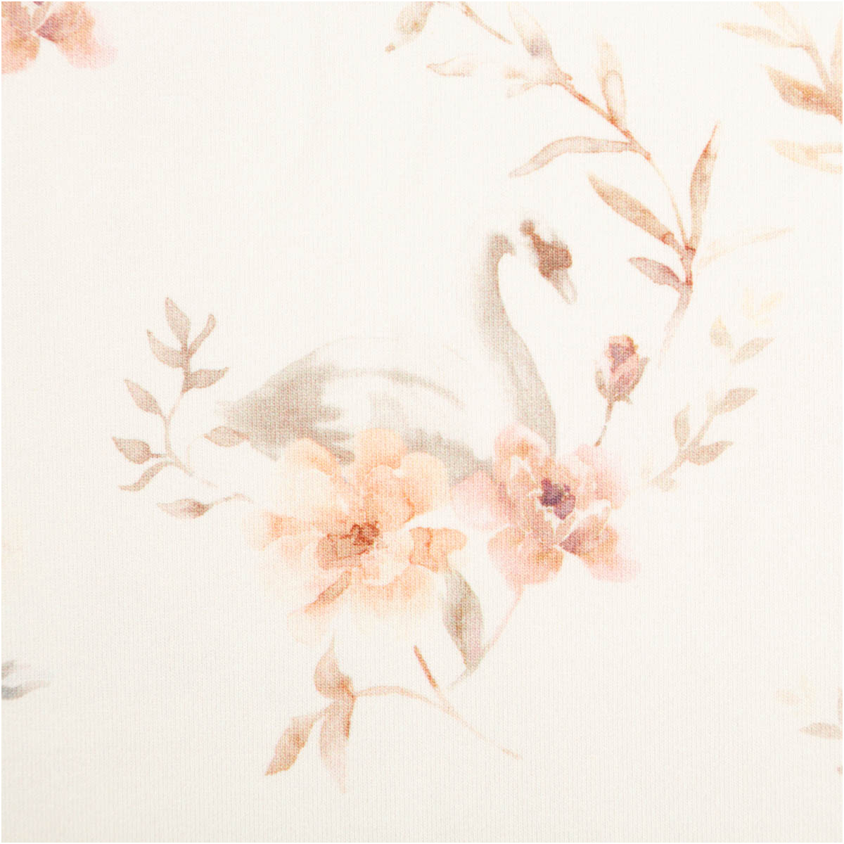 Dieser Bio French Terry Baumwollstoff vereint zarten Charme mit hohem Tragekomfort. Das romantische Dessin mit Schwänen und Blumen in sanften Rosa-, Blush- und Grautönen wirkt wie ein feiner Aquarelldruck auf wollweißem Grund. Der hochwertige Digitaldruck bringt die Motive detailreich und weich zur Geltung.