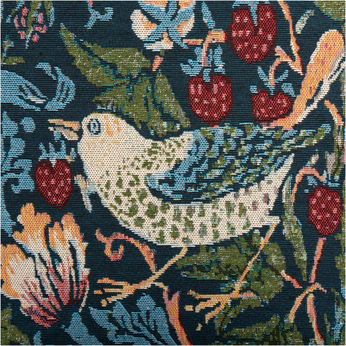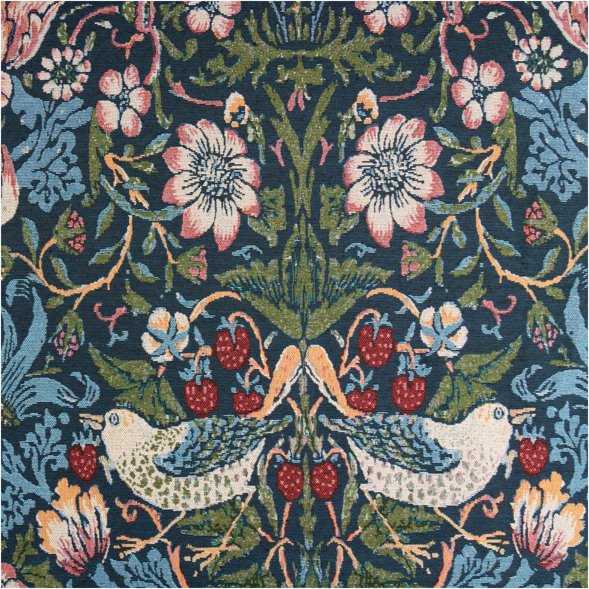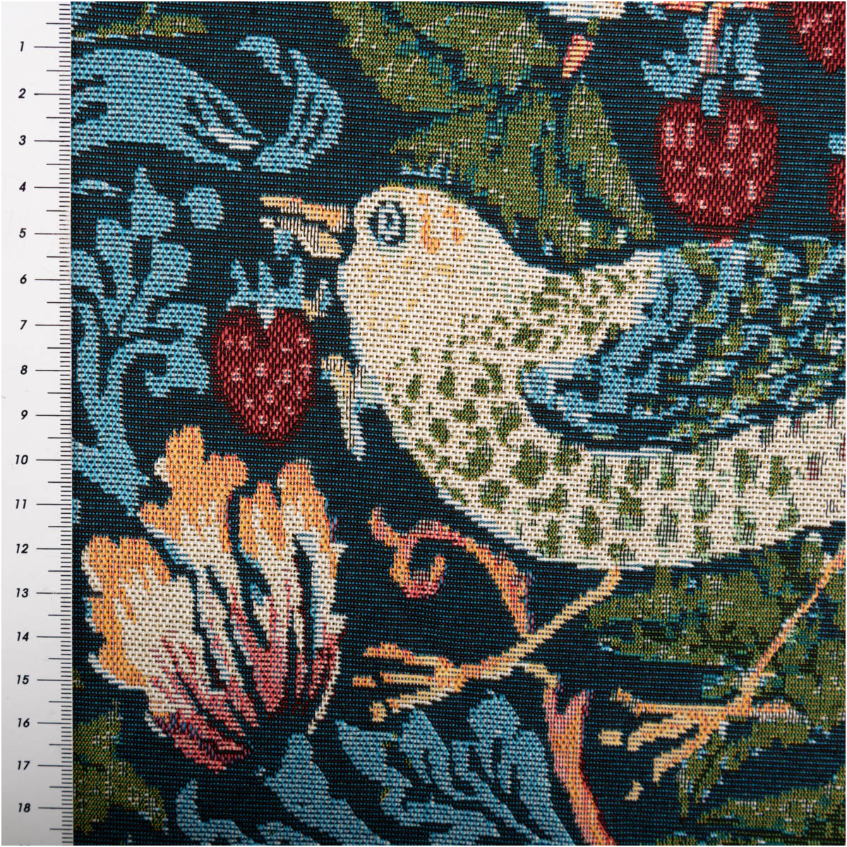 Das Design zeigt filigrane Blumen, Blätter, Erdbeeren und stilisierte Vögel, die sich harmonisch über den Stoff verteilen. Die Kombination aus Dunkelblau, Grün, Rot, Creme und zarten Rosétönen sorgt für Tiefe und Lebendigkeit. Durch die symmetrische Anordnung wirkt das Muster besonders hochwertig und dekorativ.