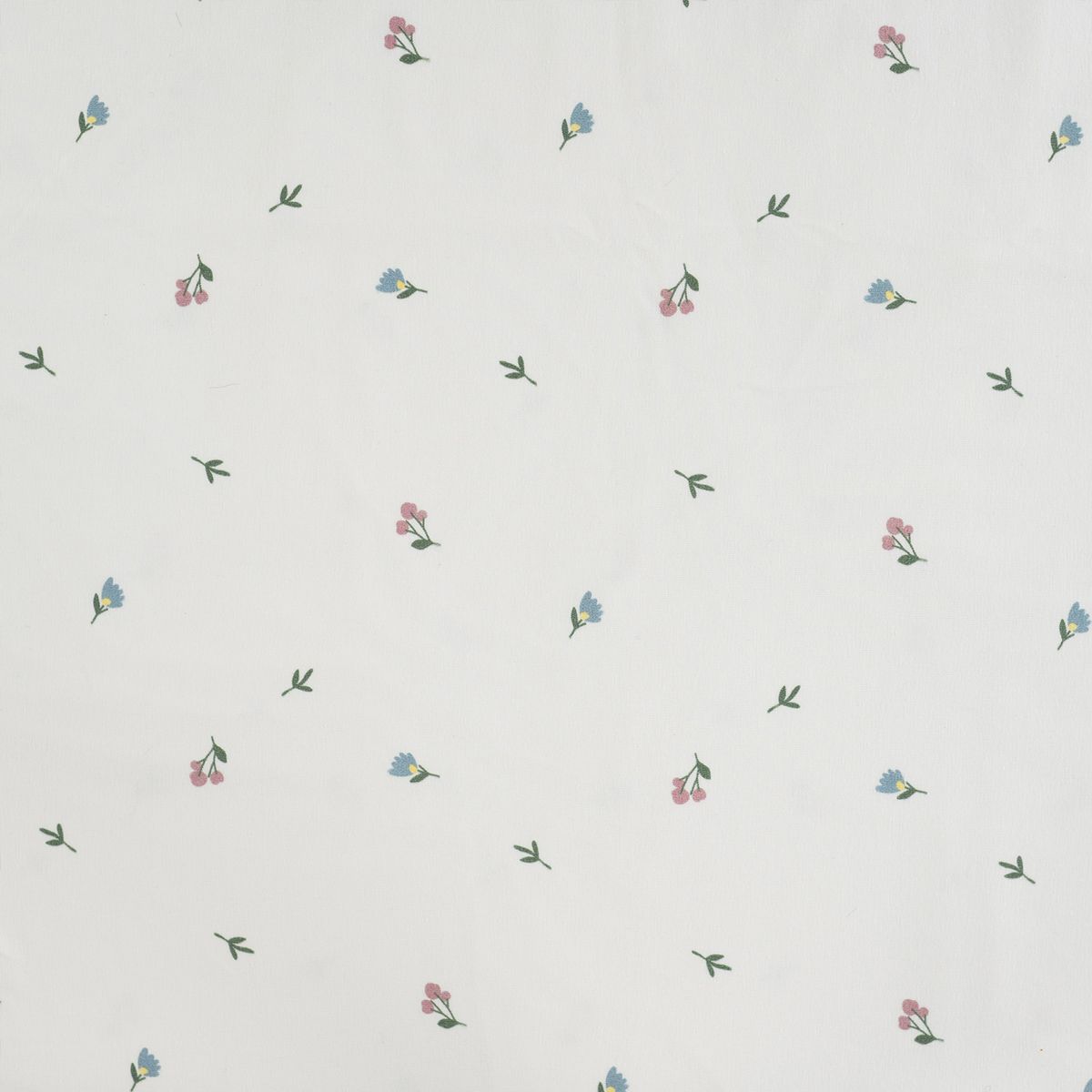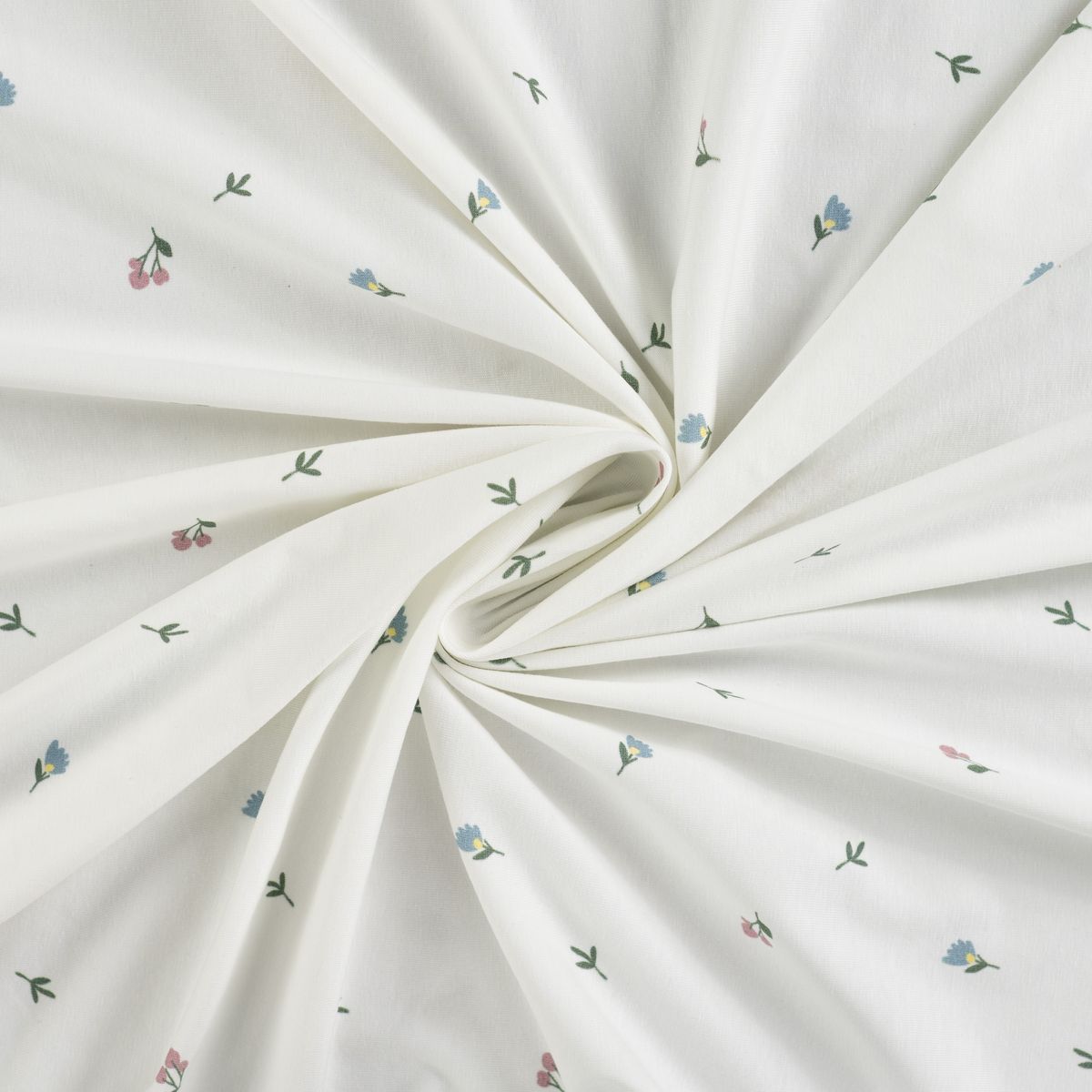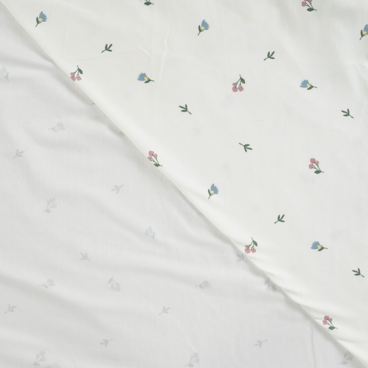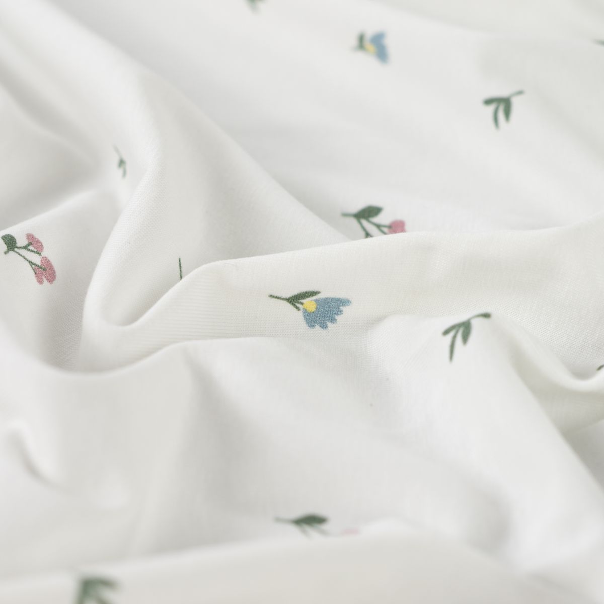 Weicher Baumwolljersey in Ecru mit kleinen Blümchen in Blau und Rosa sowie feinen grünen Blättern für freundliche und leichte Nähprojekte