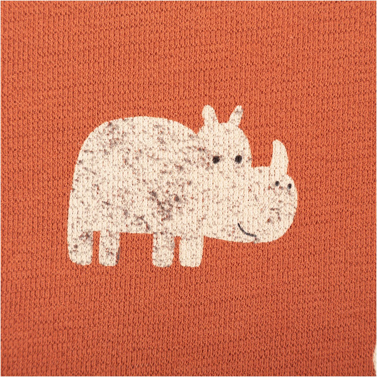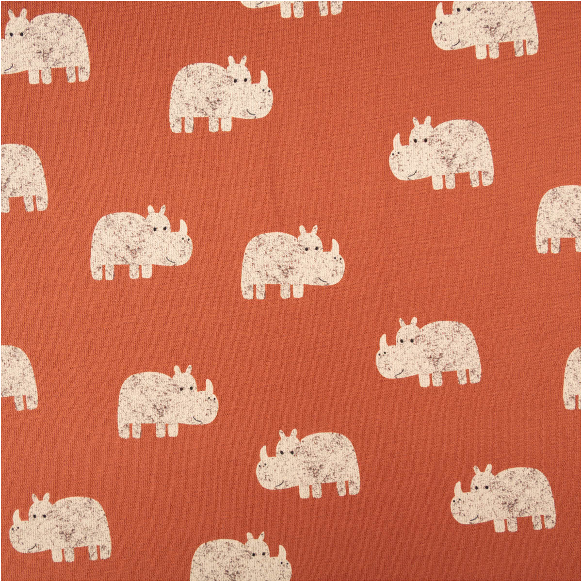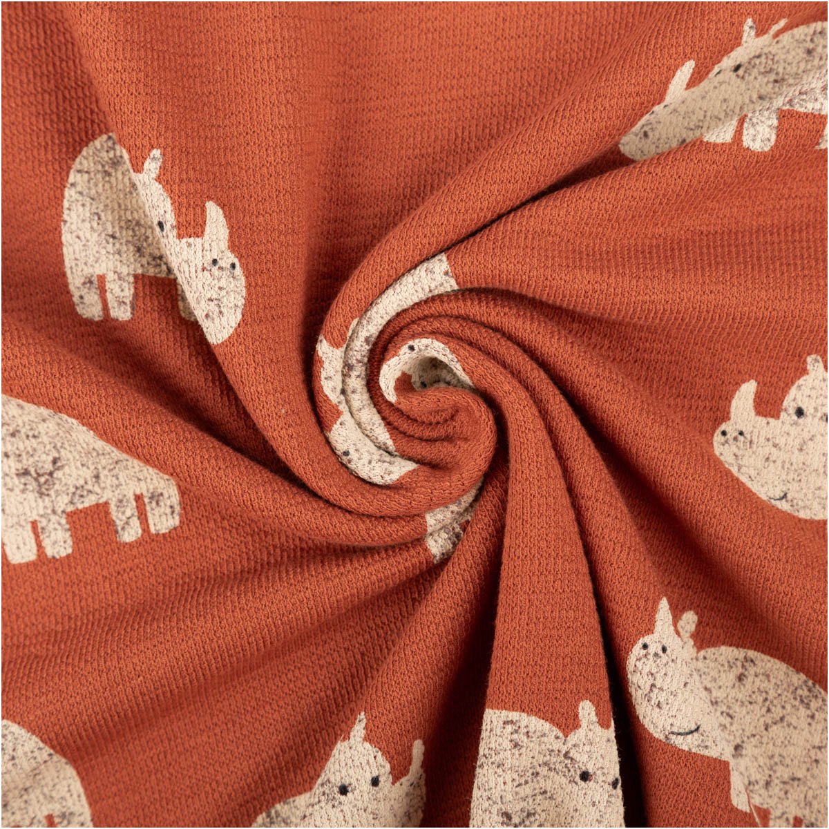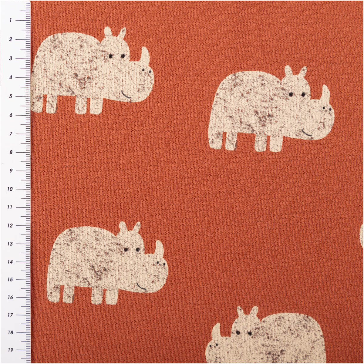 Elastischer Terry Krepp Jersey mit Nashorn-Dessin auf Terracotta, ca. 145 cm