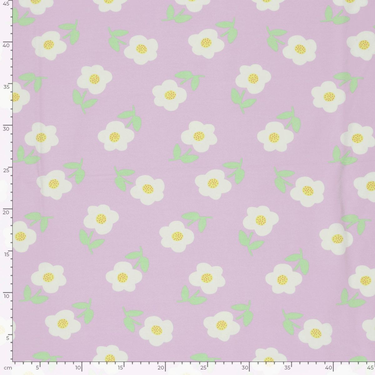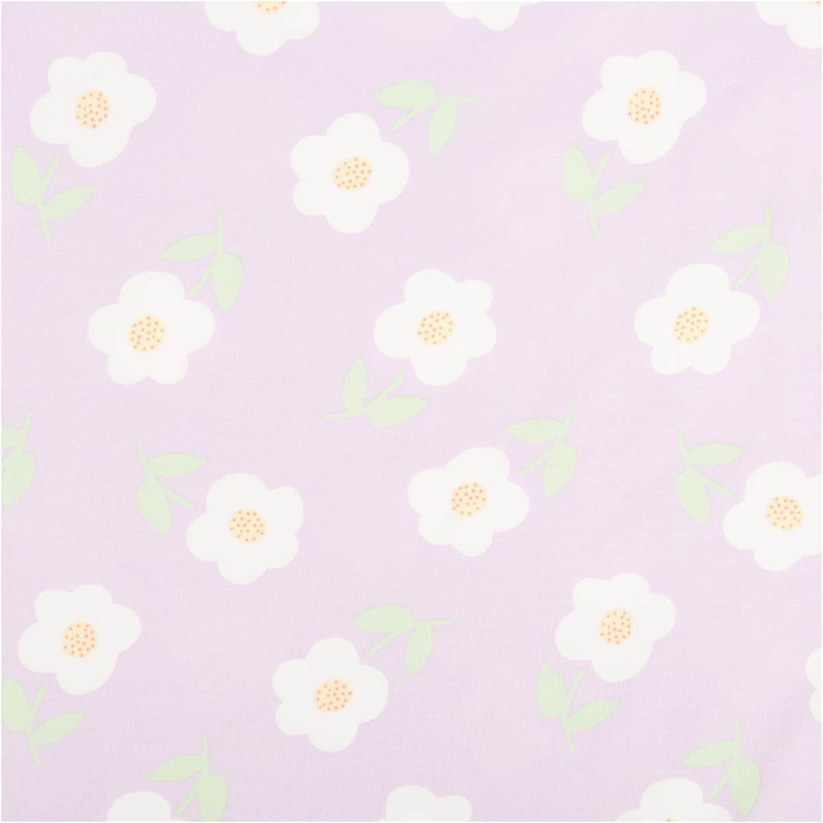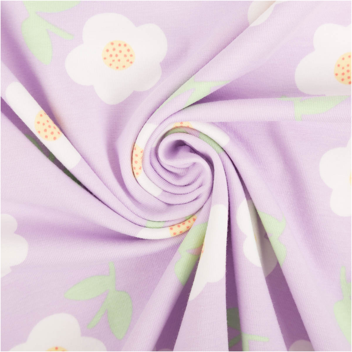 Dieser Jersey Stoff aus Baumwolljersey ist eine tolle Wahl, wenn du einen weichen, elastischen und alltagstauglichen Stoff für viele Nähideen suchst. Das freundliche Blumenmuster auf helllila Grund wirkt modern, leicht und harmonisch. Weiße Blüten mit gelber Mitte und frische grüne Blätter verleihen dem Stoff einen sanften, verspielten Charakter, der gleichzeitig klar und zeitlos wirkt.