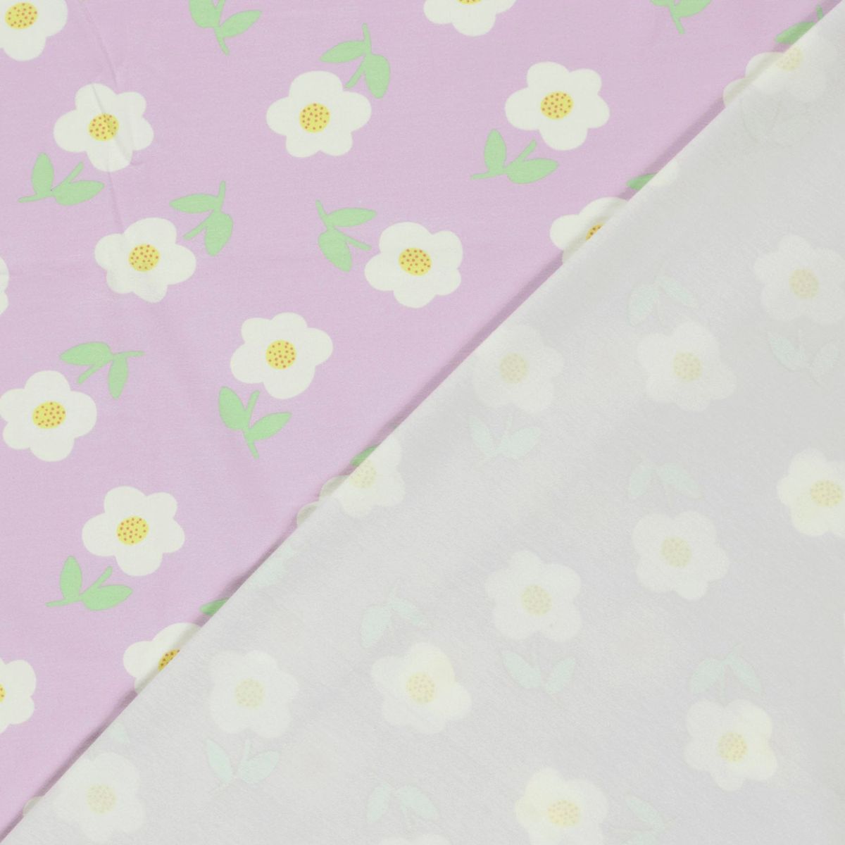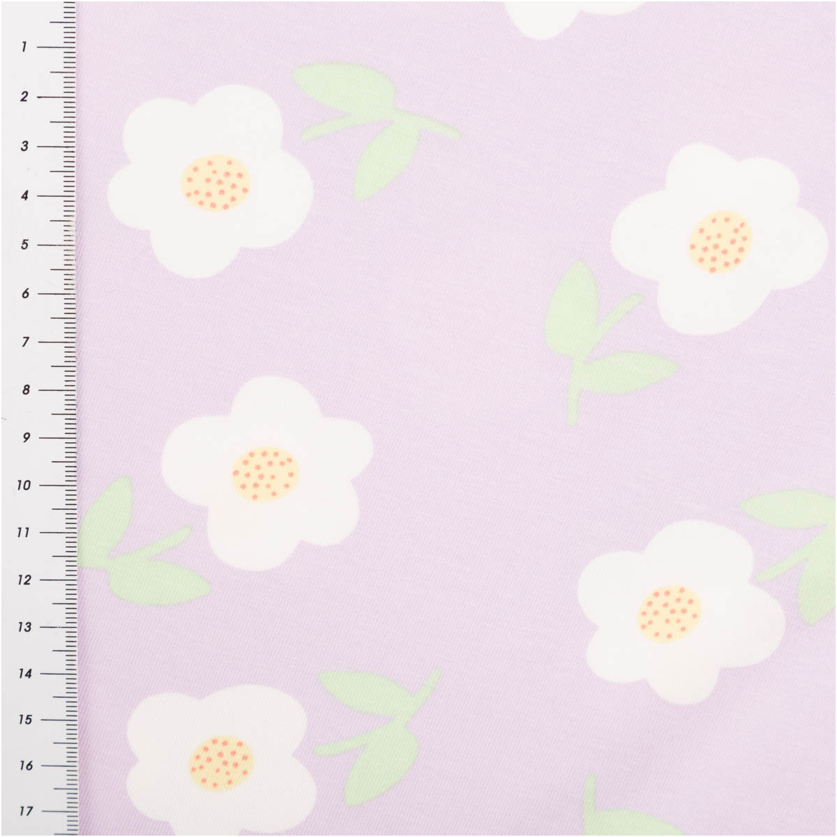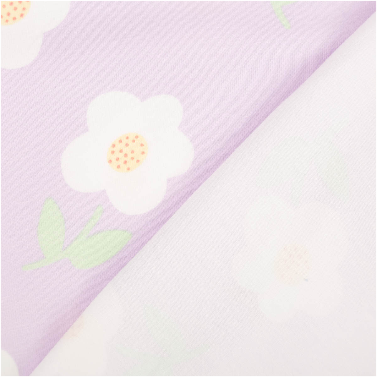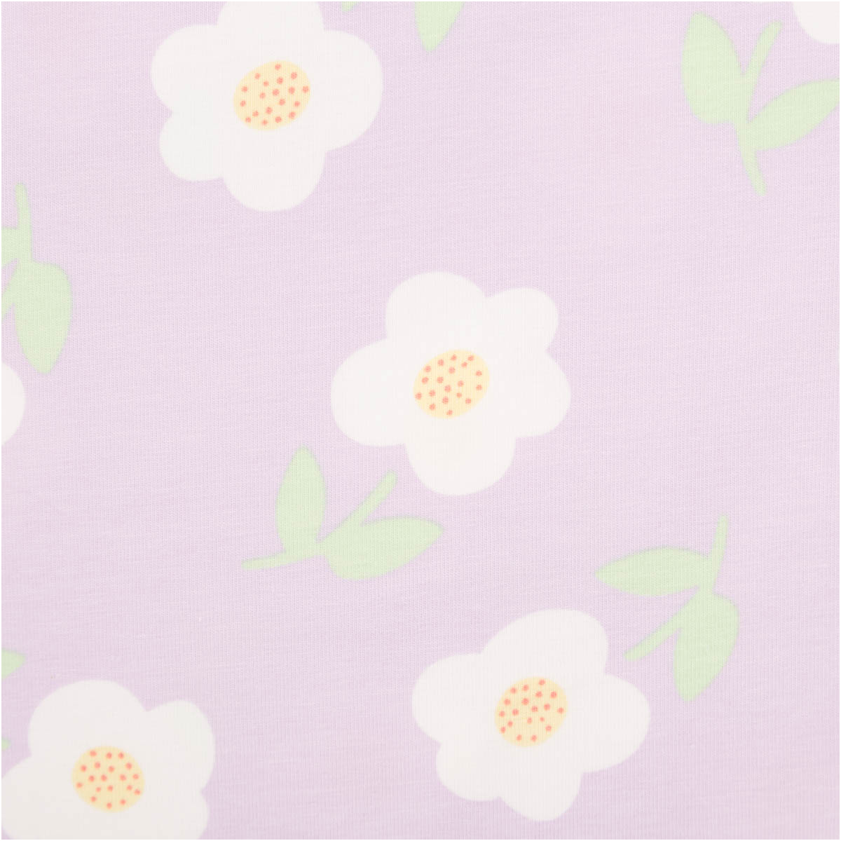 Dieser Jersey Stoff aus Baumwolljersey ist eine tolle Wahl, wenn du einen weichen, elastischen und alltagstauglichen Stoff für viele Nähideen suchst. Das freundliche Blumenmuster auf helllila Grund wirkt modern, leicht und harmonisch. Weiße Blüten mit gelber Mitte und frische grüne Blätter verleihen dem Stoff einen sanften, verspielten Charakter, der gleichzeitig klar und zeitlos wirkt.