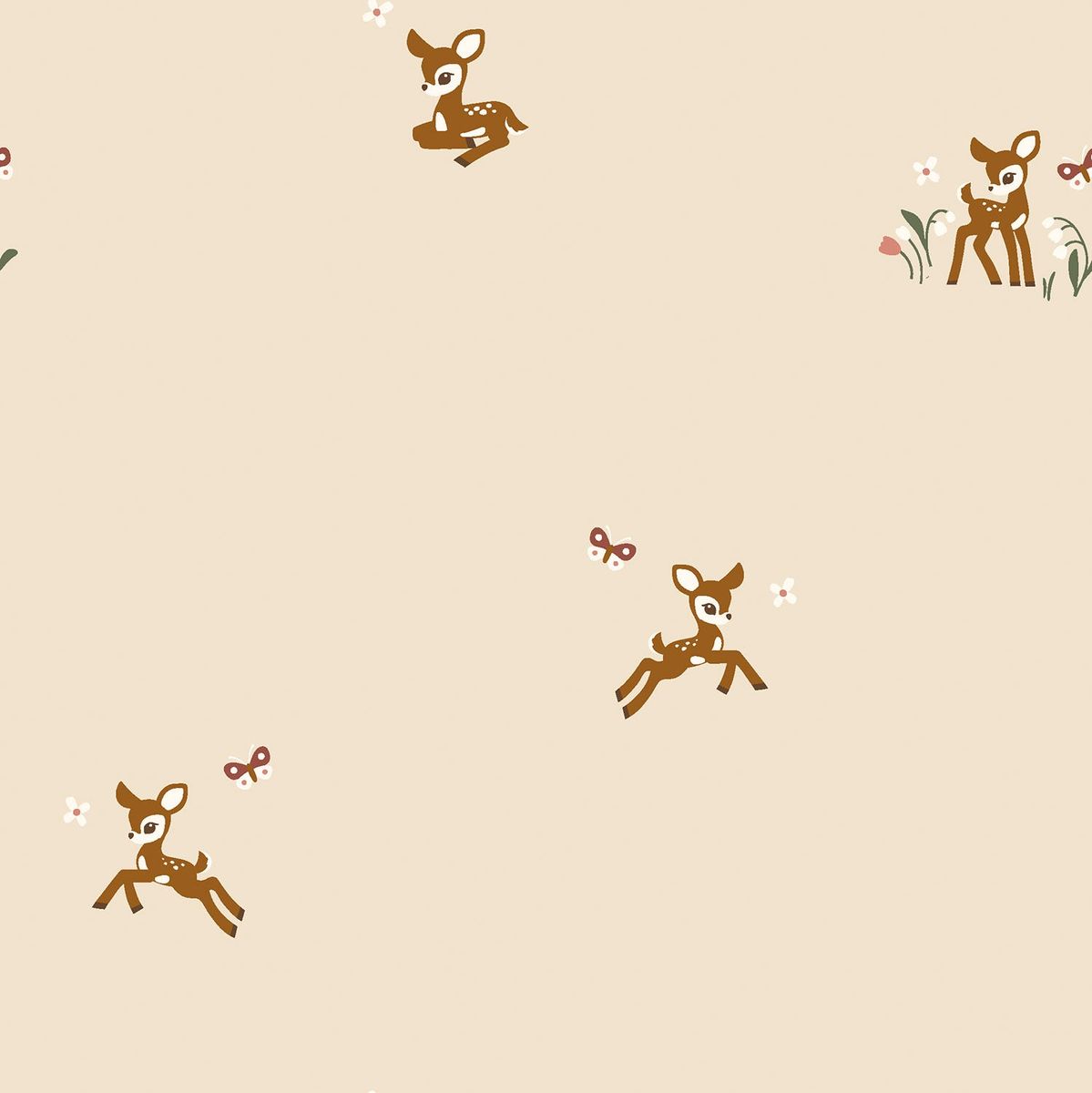 Dieser Baumwolljersey begeistert dich mit einem niedlichen Rehkitz-Design auf warmem, beigem Hintergrund. Die kleinen Rehe, kombiniert mit zarten Blumen und Schmetterlingen, sorgen für eine ruhige und natürliche Optik und sind ideal für Baby- und Kinderprojekte.
