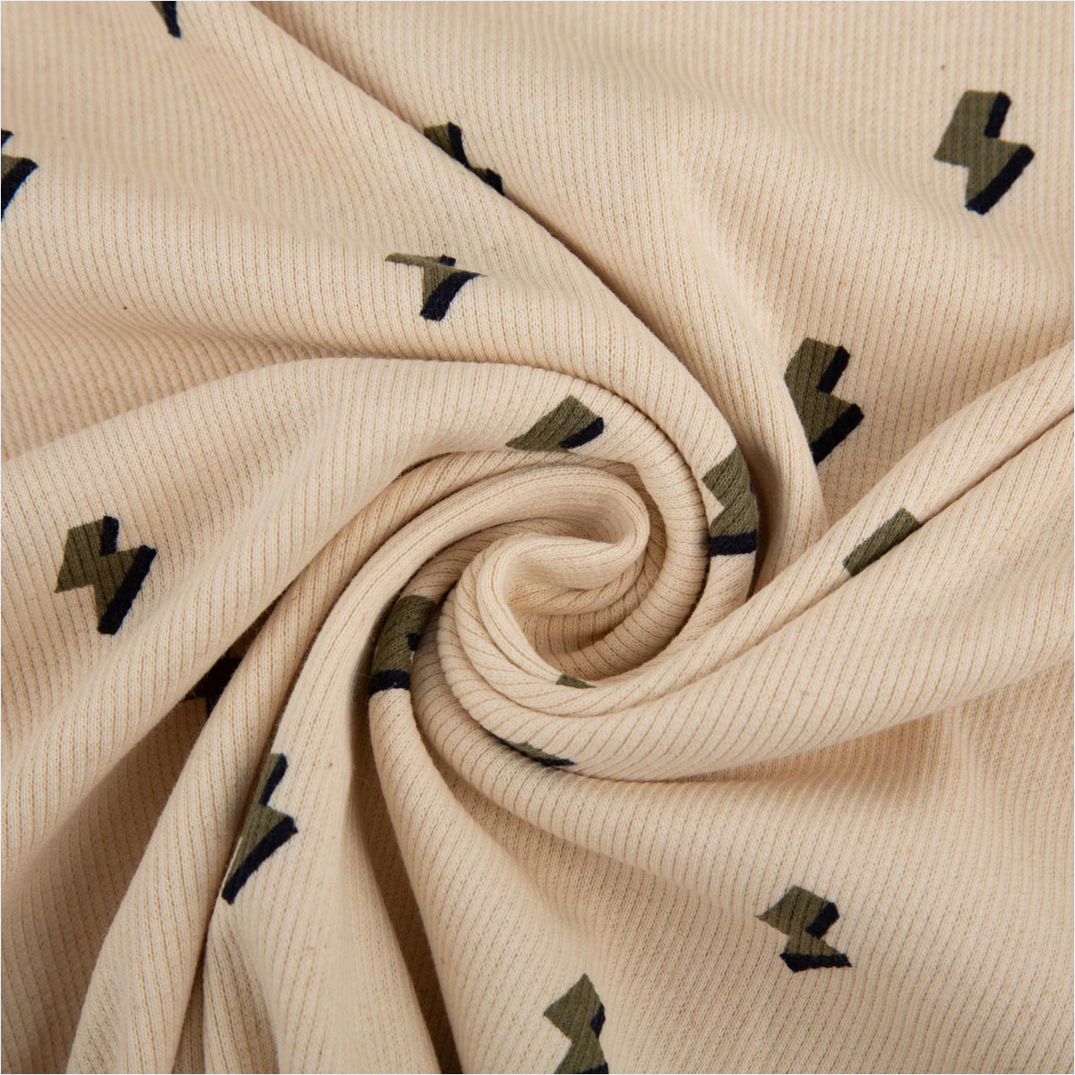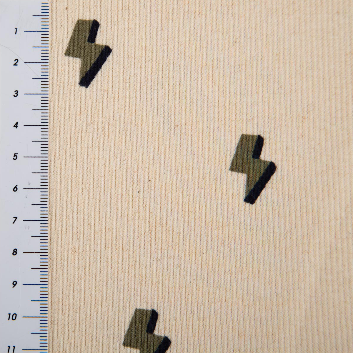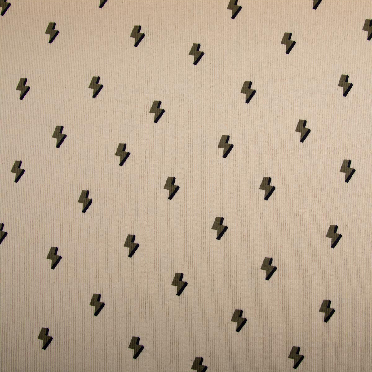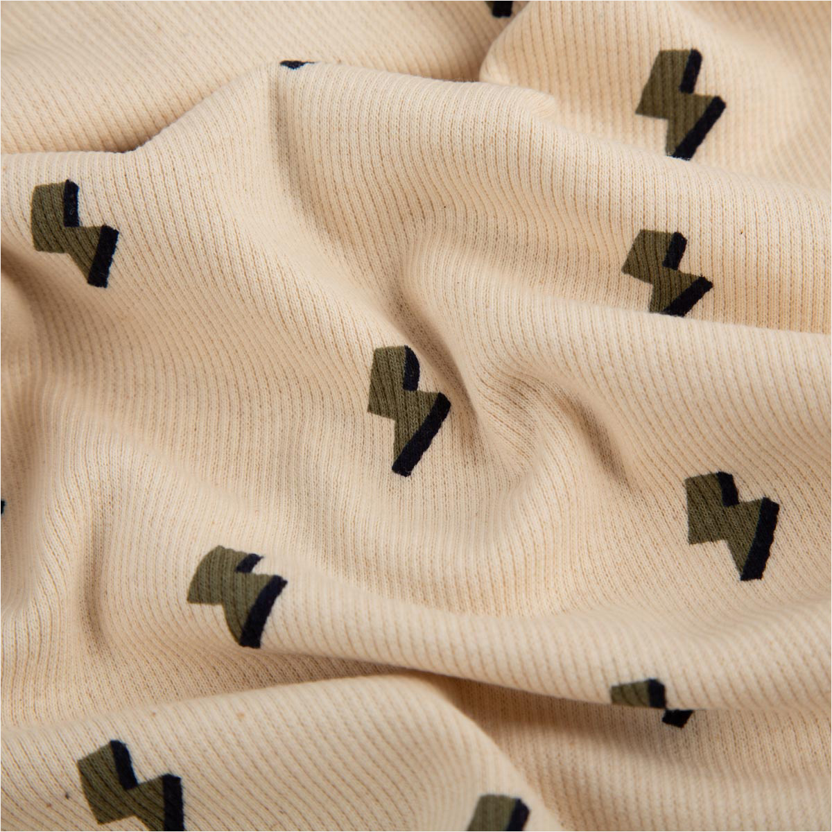 Dieser hochwertige Rippjersey aus Bio-Baumwolle mit modernem Blitze-Dessin in grün auf naturfarbenem Grund ist ein echter Allrounder für bequeme und langlebige Nähprojekte. Die charakteristische Rillenstruktur verleiht dem Stoff eine moderne Optik und sorgt gleichzeitig für eine besonders angenehme, weiche Haptik.