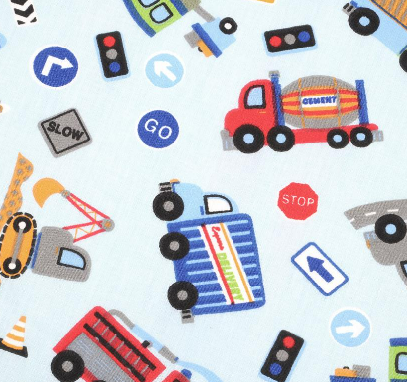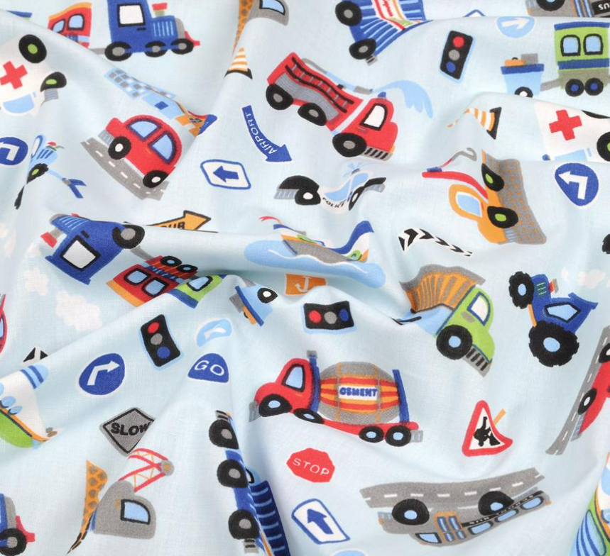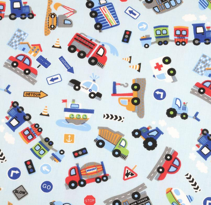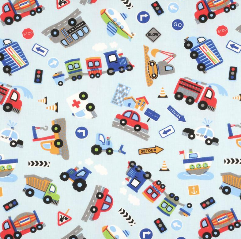 Dieser fröhliche Baumwollstoff bringt Bewegung, Farbe und jede Menge Abenteuer in deine Nähprojekte. Auf hellblauem Hintergrund tummeln sich viele unterschiedliche Fahrzeuge und Verkehrsmotive: Bagger, Betonmischer, Feuerwehr, Polizei, Krankenwagen, Traktoren, Lastwagen, Züge, Schiffe, Flugzeuge, Straßen und Verkehrsschilder. Das bunte Allover-Muster wirkt verspielt, lebendig und gleichzeitig übersichtlich gestaltet.