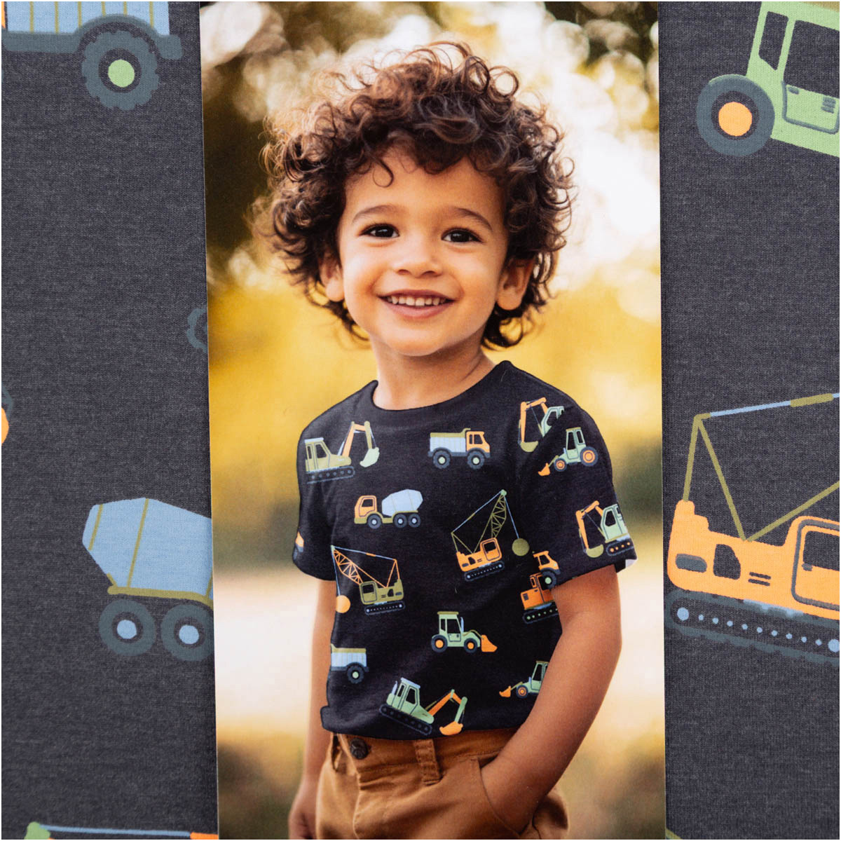 Wenn bei dir kleine Baustellen-Fans durchs Haus flitzen, ist dieser Jersey ein Volltreffer: Auf einem melierten marineblauen Untergrund fahren neon-bunte Baufahrzeuge wie Bagger, Laster und Kräne – modern, klar und richtig auffällig. Die Jersey-Qualität ist angenehm weich, elastisch und macht jede Bewegung mit. Perfekt für Kinderkleidung, die im Alltag funktionieren soll und dabei richtig cool aussieht.