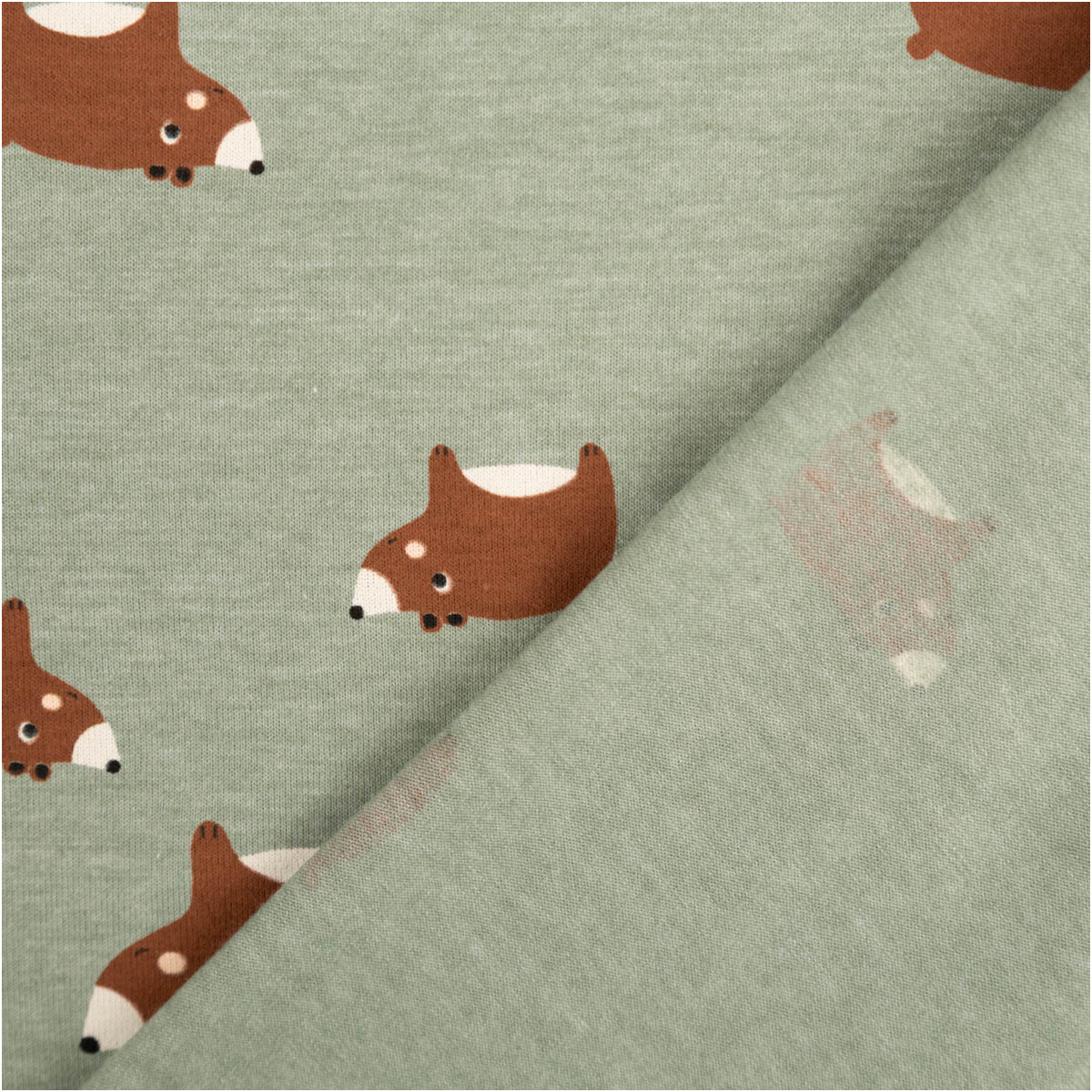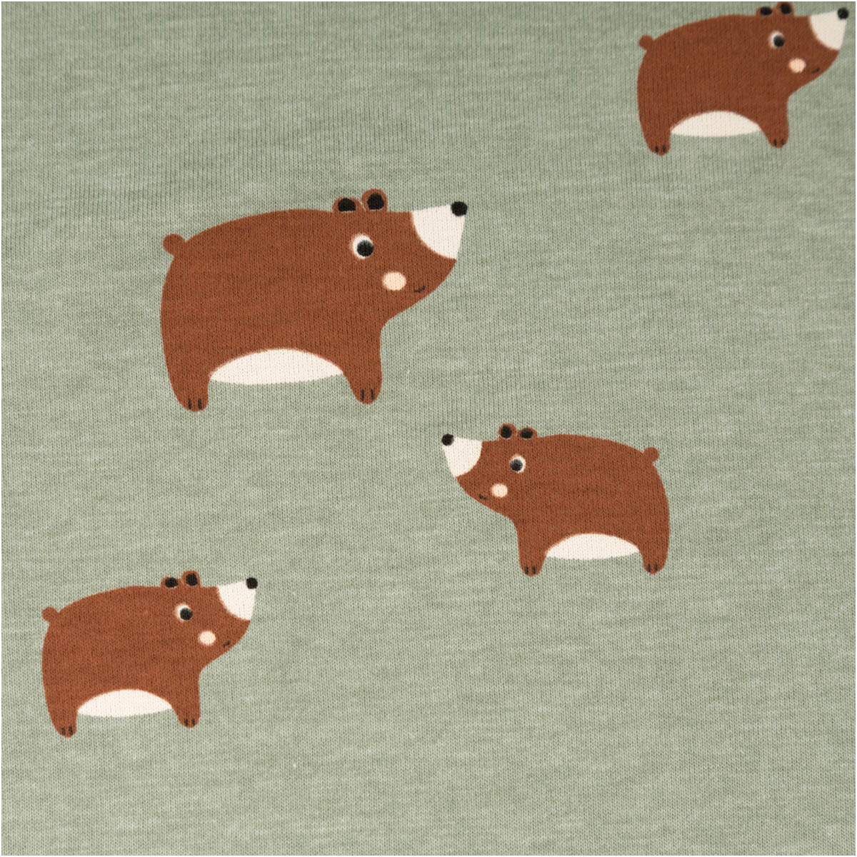 Die kleinen Bärenmotive sorgen für einen süßen Look, ohne zu aufdringlich zu wirken. Die Kombination aus mintgrün meliertem Hintergrund und warmem Braun wirkt modern, freundlich und lässt sich vielseitig kombinieren. Dadurch entstehen zeitlose Lieblingsstücke für den Alltag.