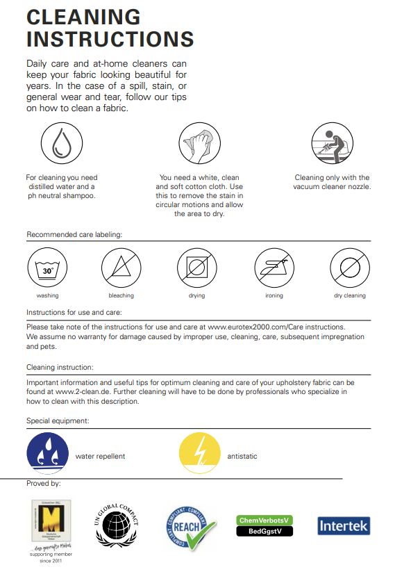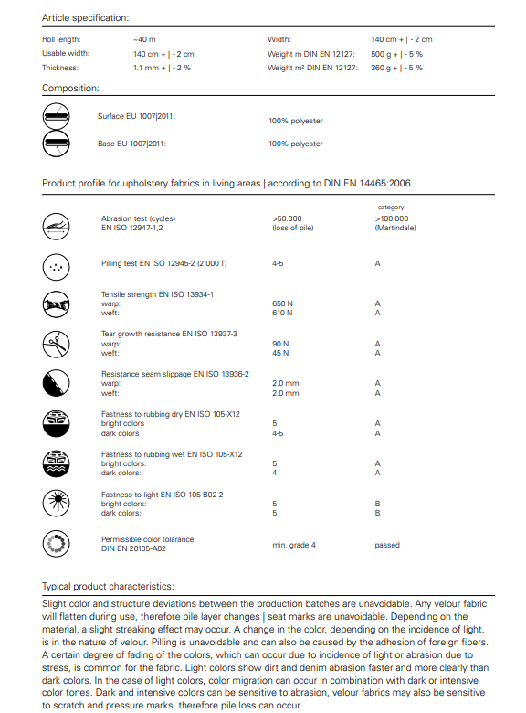 Details: Material: 100% Polyester, Breite: ca. 1,40 m +/- 2cm, , Gewicht: ca. 398g/m² das entspricht 577g/lfm, Scheuertouren: 100.000 Martindale, 30°C waschbar, wasserabweisende Ausrüstung, Dicke: ca. 2,0 mm +/- 2%, Lichtechtheit: 5, Zugfestigkeit: Längs 380N, Quer 280N, Trockenreibechtheit: 4, Nassreibechtheit: 4. Pilling: 5, schadstoffgeprüft