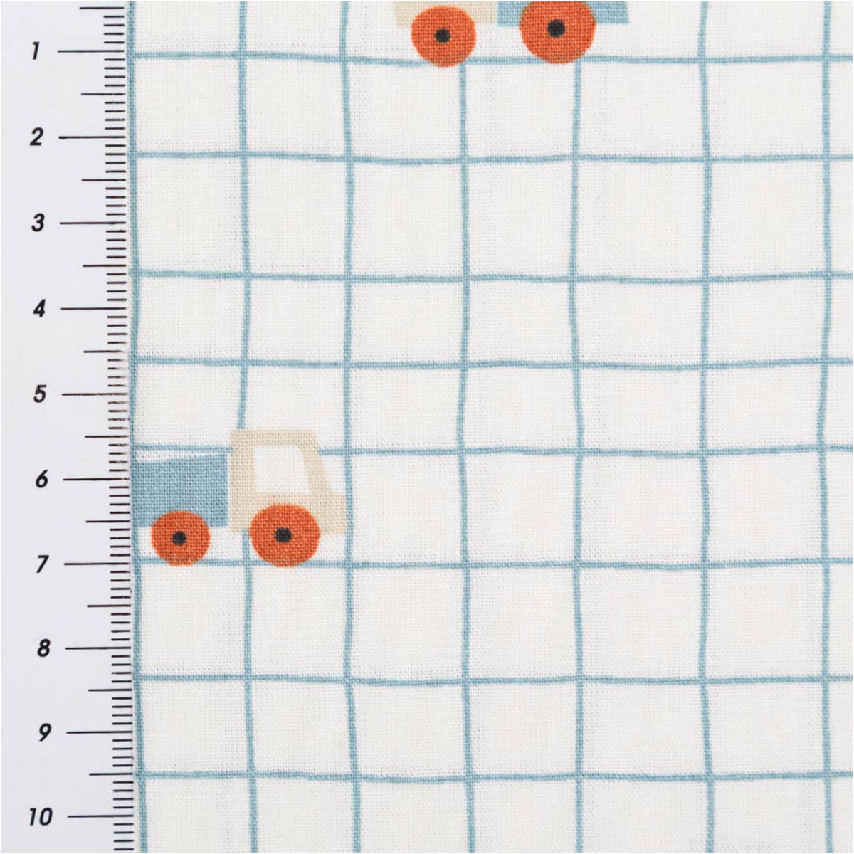 Baumwollstoff Popeline mit kleinen Lkws und blauem Karogitter – Zauberhafter Baumwollstoff für kreative Nähprojekte