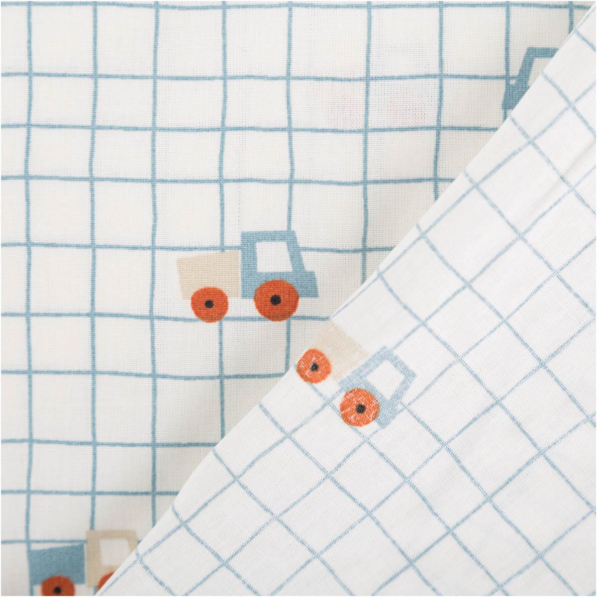Kinder-Muster: Kinderfreundlicher Baumwollstoff mit niedlichen kleinen Lkws und blauem Karogitter – perfekt für Baby- und Kinderausstattung.