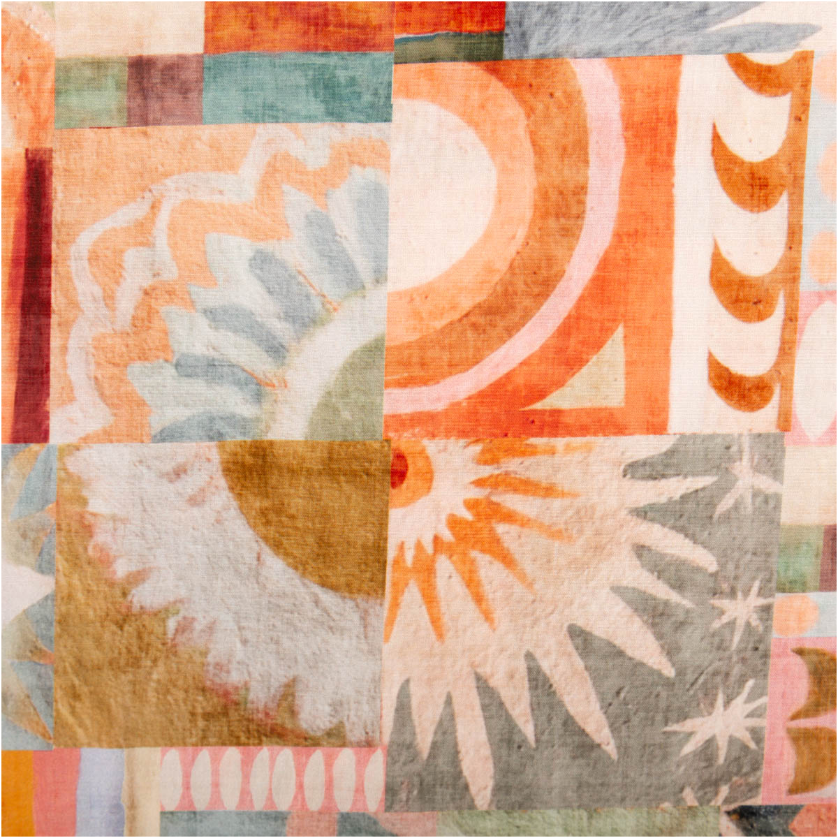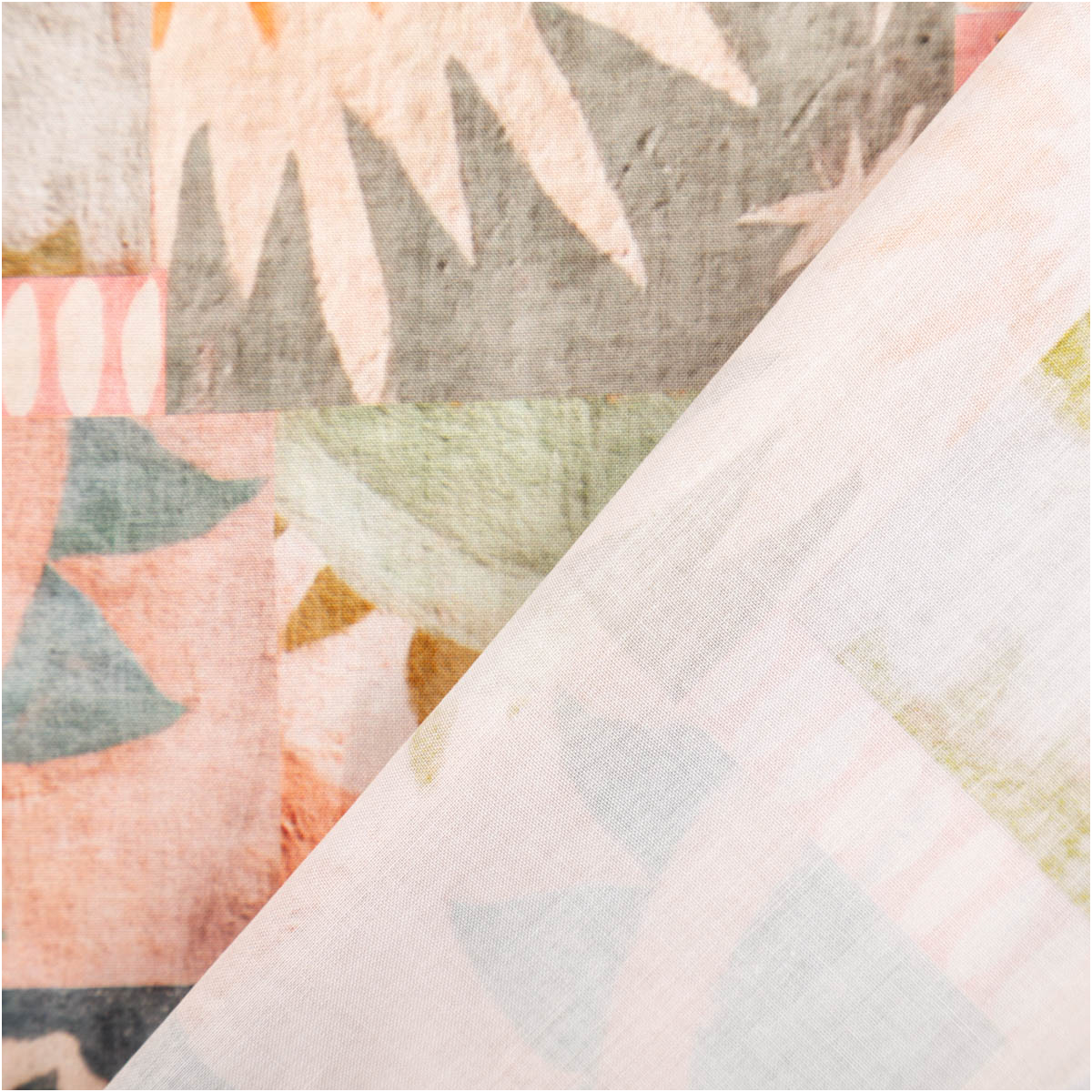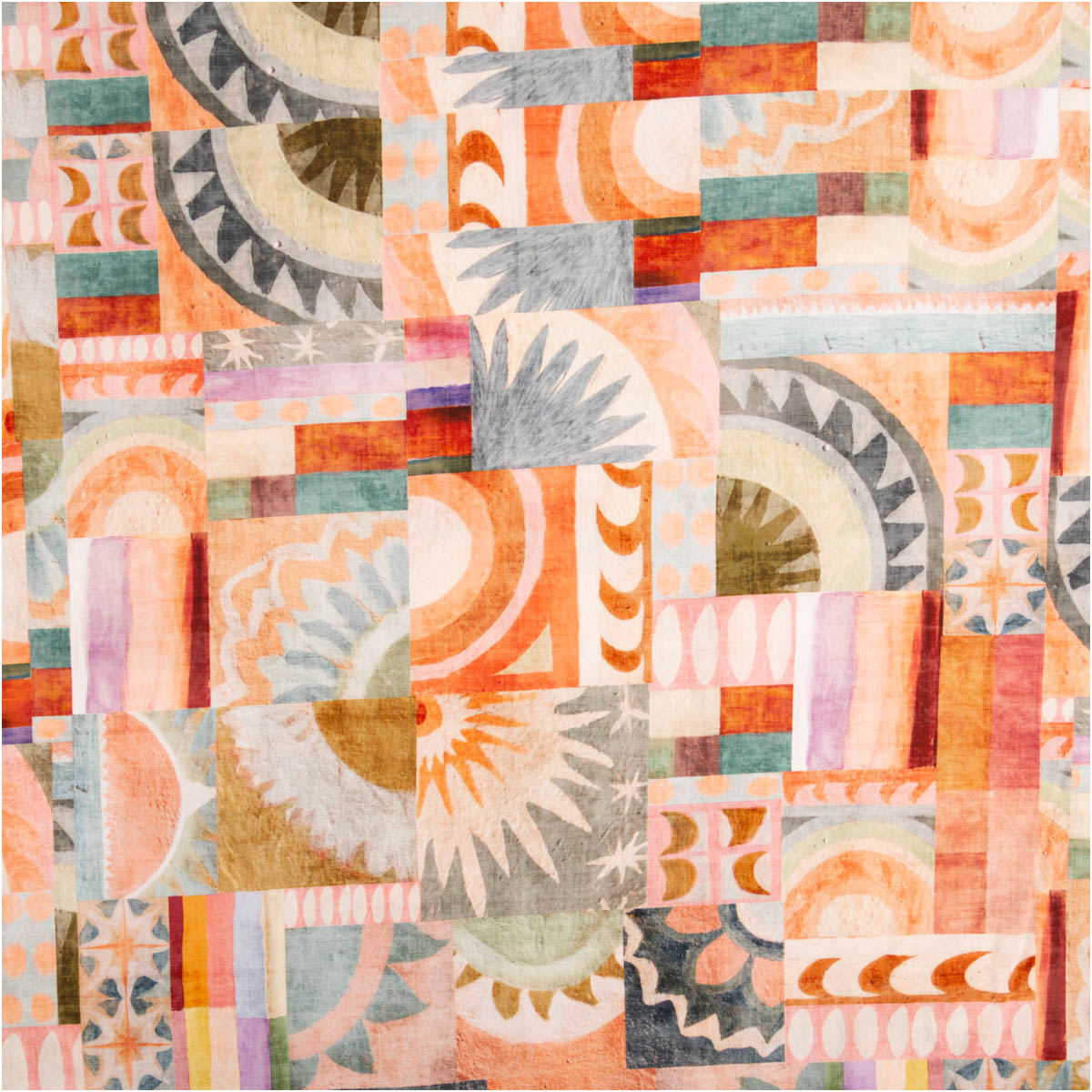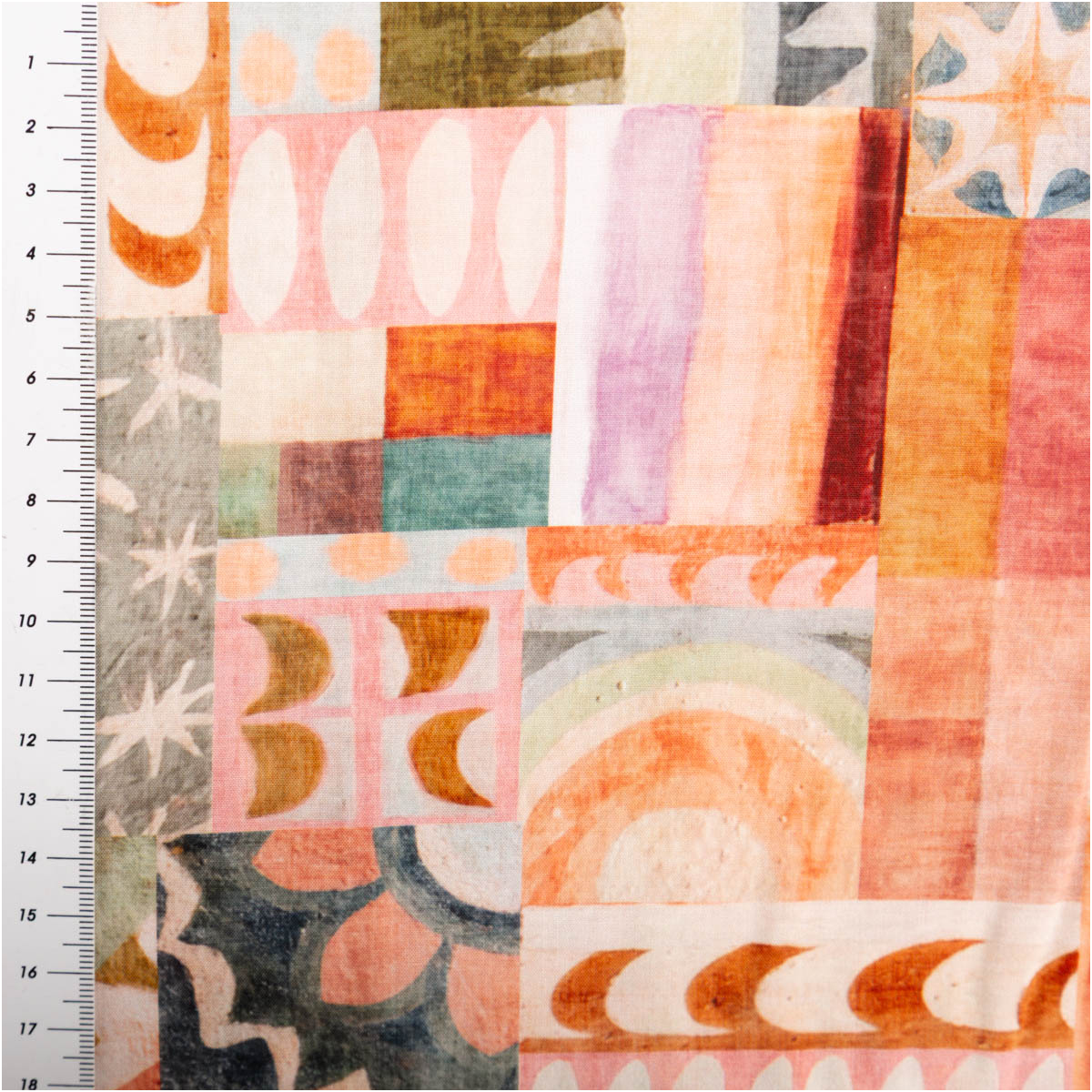 Das grafisch-abstrakte Design verbindet Bögen, Formen und Farbfelder zu einem spannenden Gesamtbild. Orange, Grün, Rosé, Creme und gedeckte Naturtöne ergeben zusammen einen modernen Look mit künstlerischem Charakter. Dadurch eignet sich der Stoff für stilbewusste Nähideen mit individueller Note.