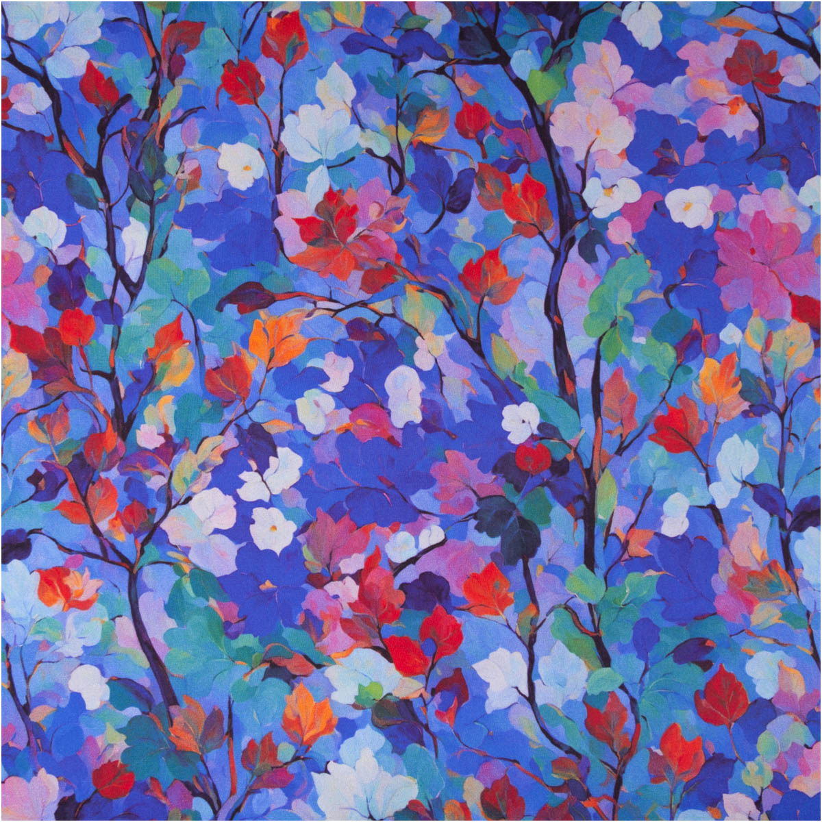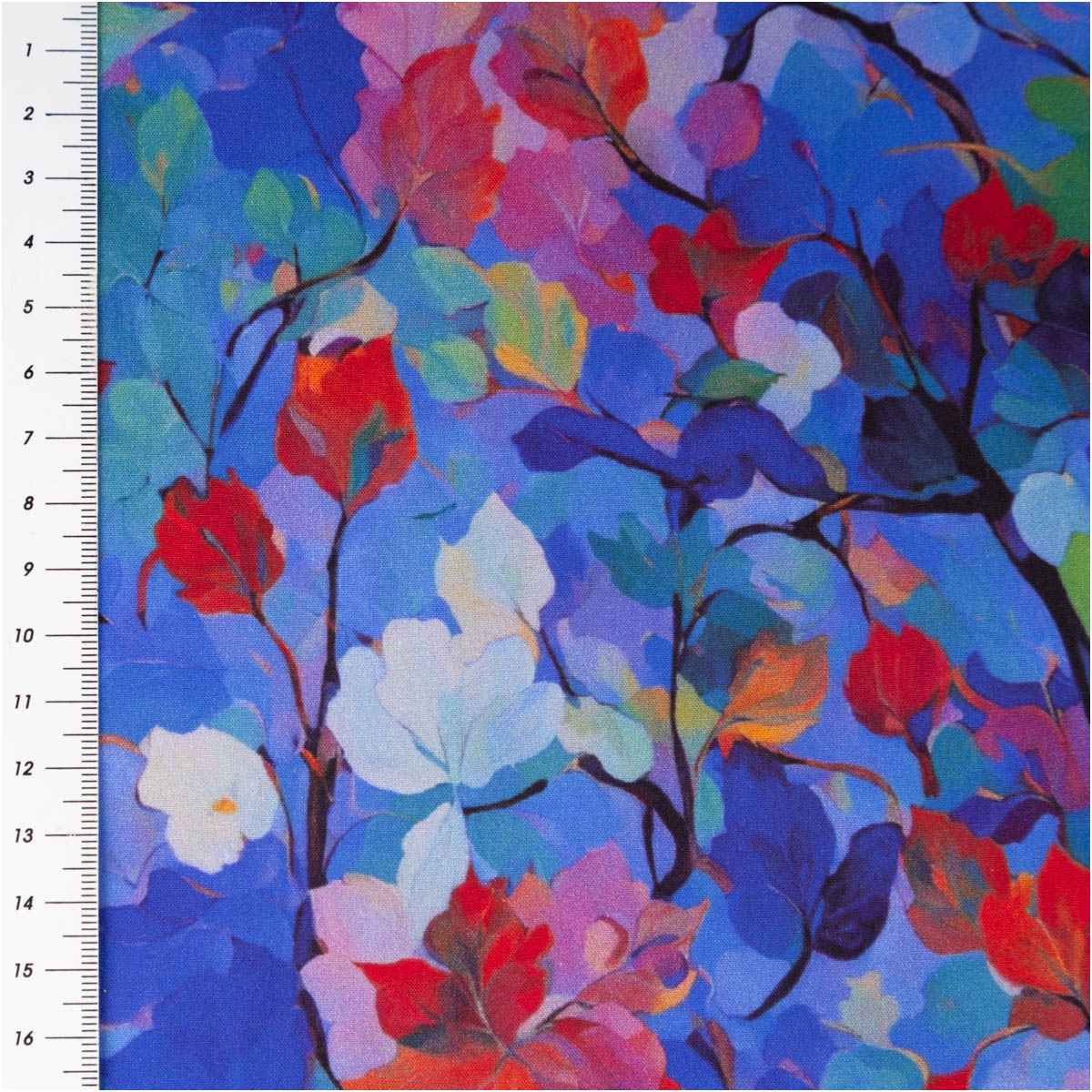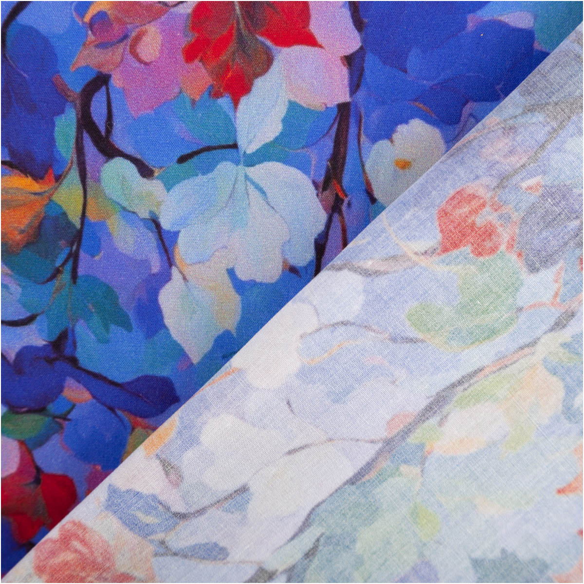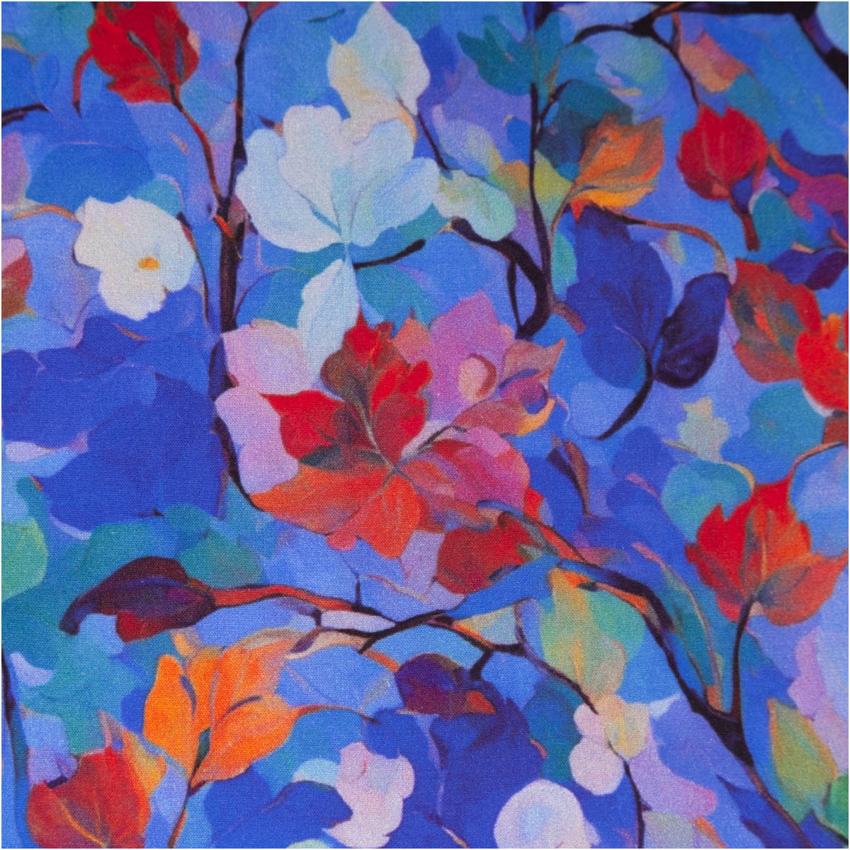Das Design verbindet kobaltblaue Farbflächen mit Blumen und Blättern in Rot und Rosa. Dadurch entsteht ein ausdrucksstarker Look, der kreativ, hochwertig und gleichzeitig alltagstauglich wirkt. Der Stoff passt zu femininen Schnitten, modernen Silhouetten und individuellen Nähideen.