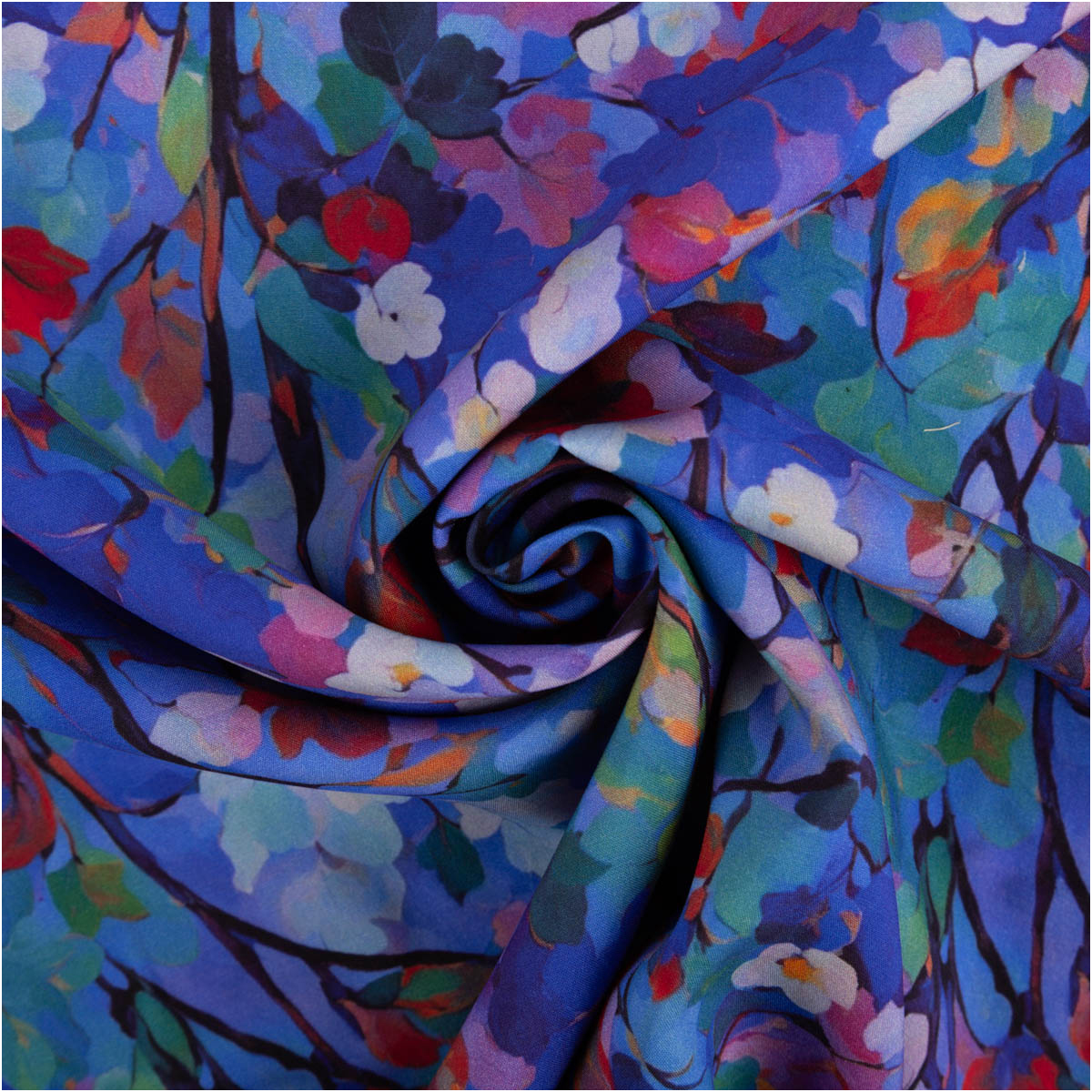 Viskose Stoff Radiance Aquarell Blumen und Blätter blau rot rosa 1,40m Breite