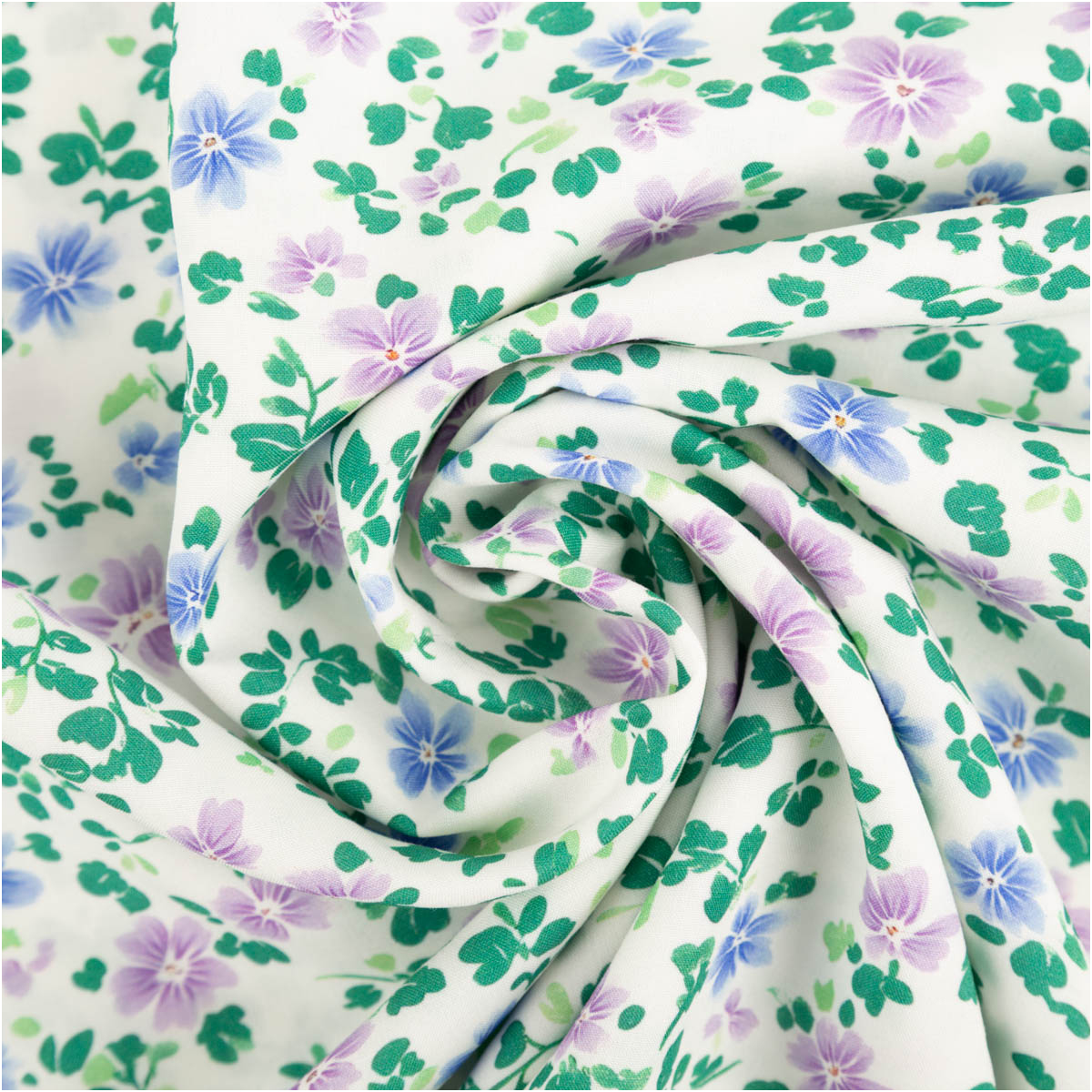 Leichter Viskose Stoff als Meterware mit feinem Blümchen Digitaldruck in Weiß, Grün, Blau und Lila für feminine, frische und vielseitige Nähideen
