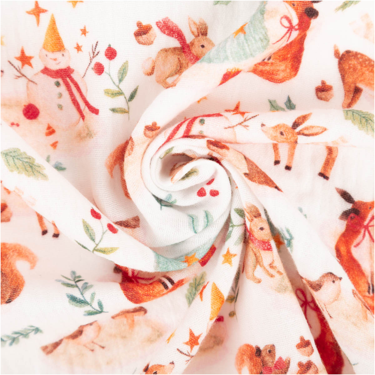 Du willst Weihnachtsflausch zum Anziehen und Dekorieren? Dieser hochwertige Musselin aus 100% Baumwolle bringt mit weihnachtlichen Motiven wie Fuchs mit Mütze, Kränzen, Geschenken, Tannen, Zuckerstangen und Tassen sofort festliche Stimmung in deine Nähprojekte. Double Gauze macht den Stoff extra weich, atmungsaktiv und saugfähig – ideal für alles, was direkt auf der Haut liegt.