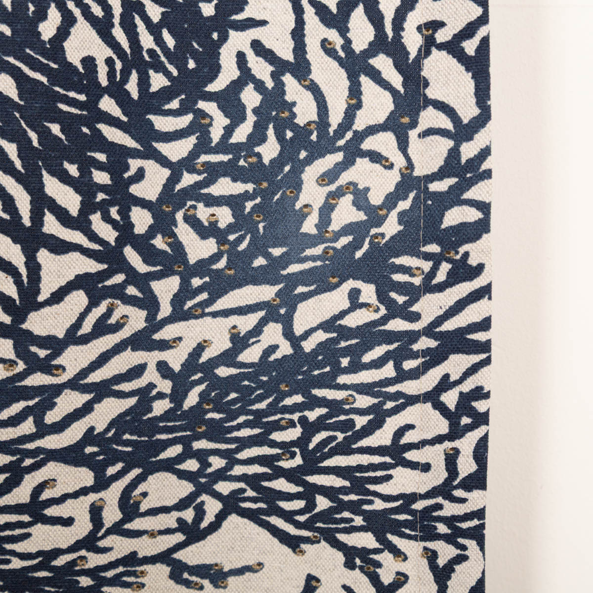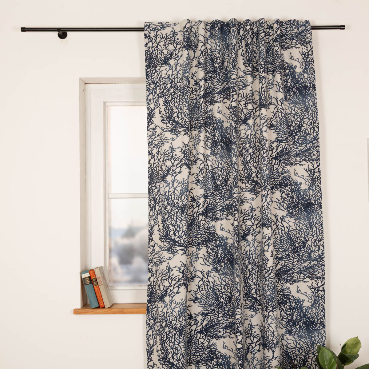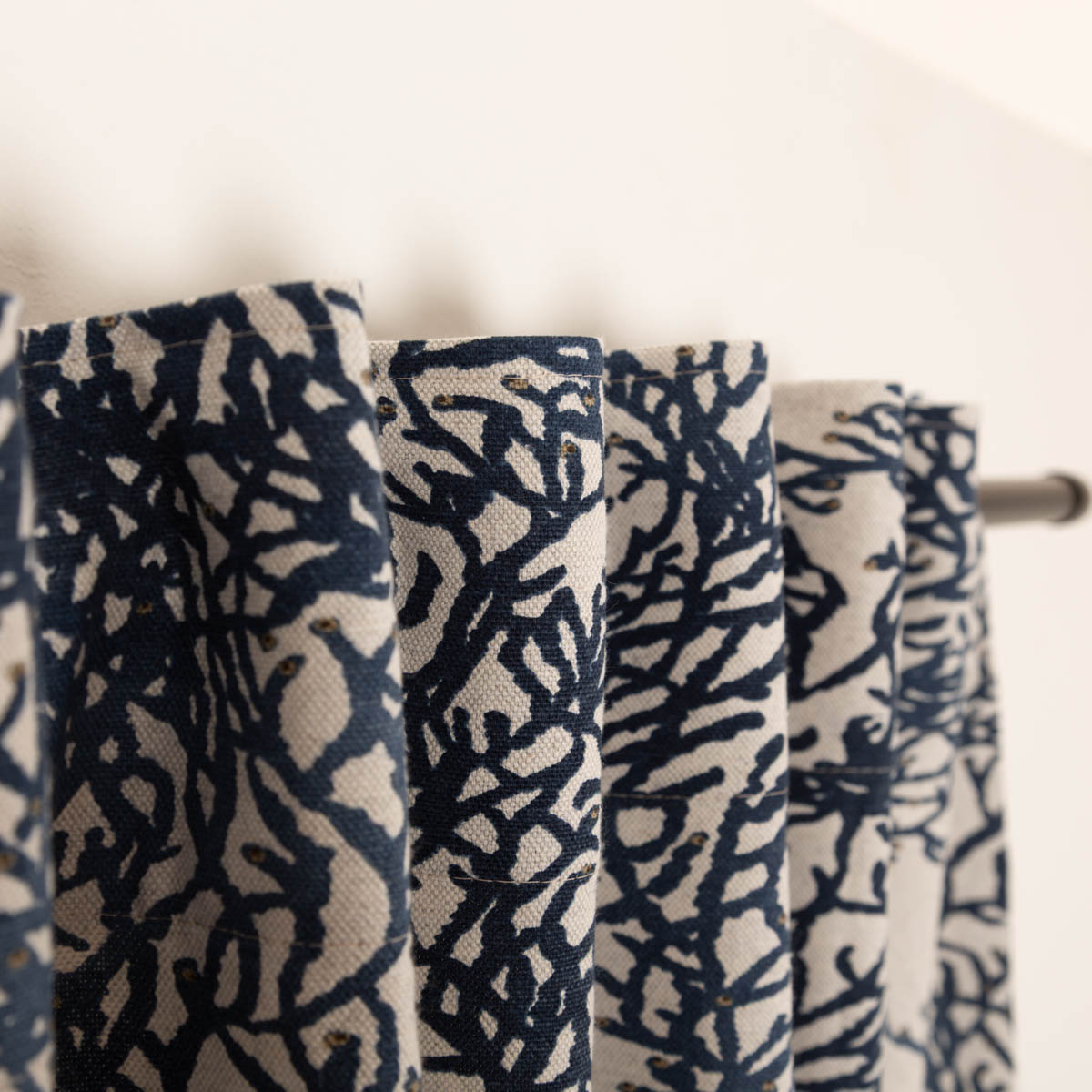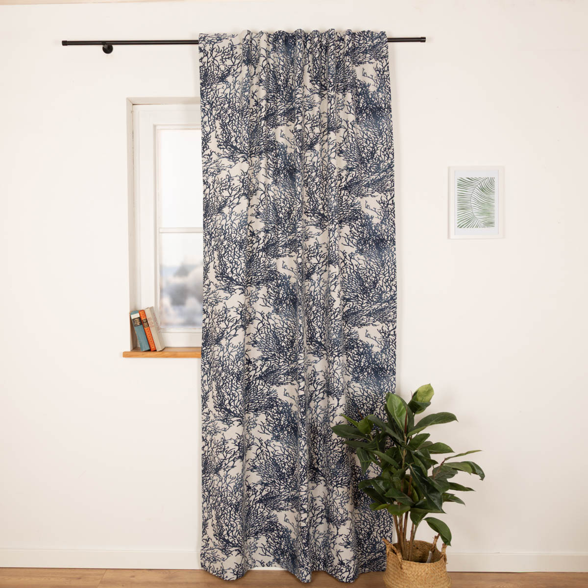 Dieser Vorhang aus der SCHÖNER LEBEN. Kollektion bringt Ruhe und Eleganz in deine Wohnräume. Das exklusive französische Dessin zeigt filigrane Korallenstrukturen in Blau auf naturfarbenem Grund. Die grafische Anmutung wirkt maritim, klar und zeitlos – ideal für eine entspannte, stilvolle Atmosphäre.