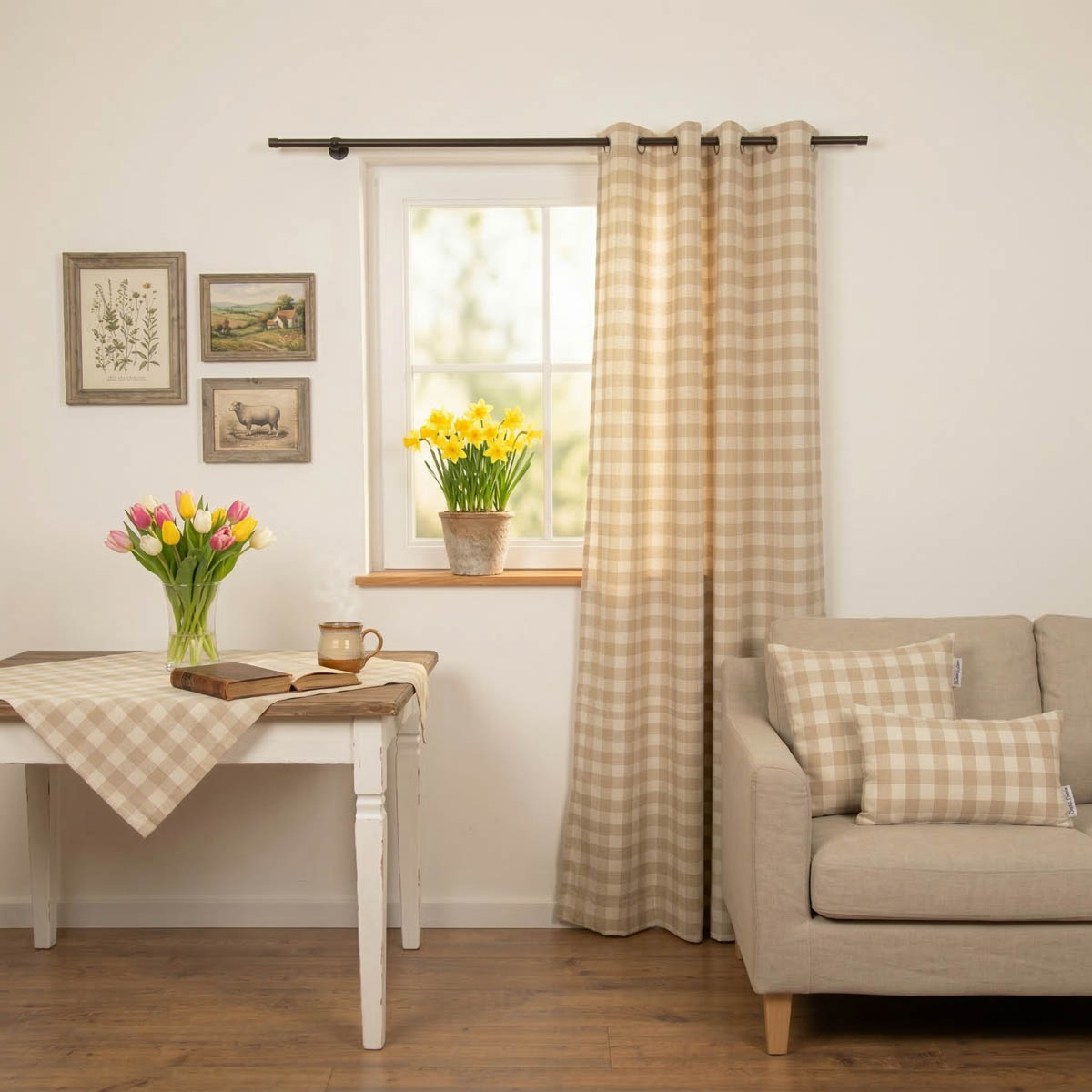 Dazu passt der Vorhang mit Karos in Beige und Weiß