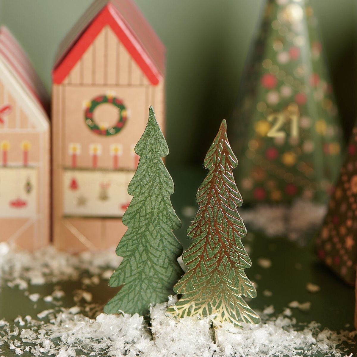 24 Papphäuser mit Zahlen 1–24, Tannen & Figuren inklusive