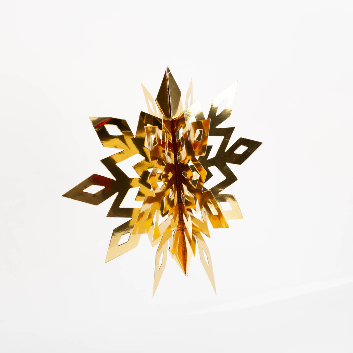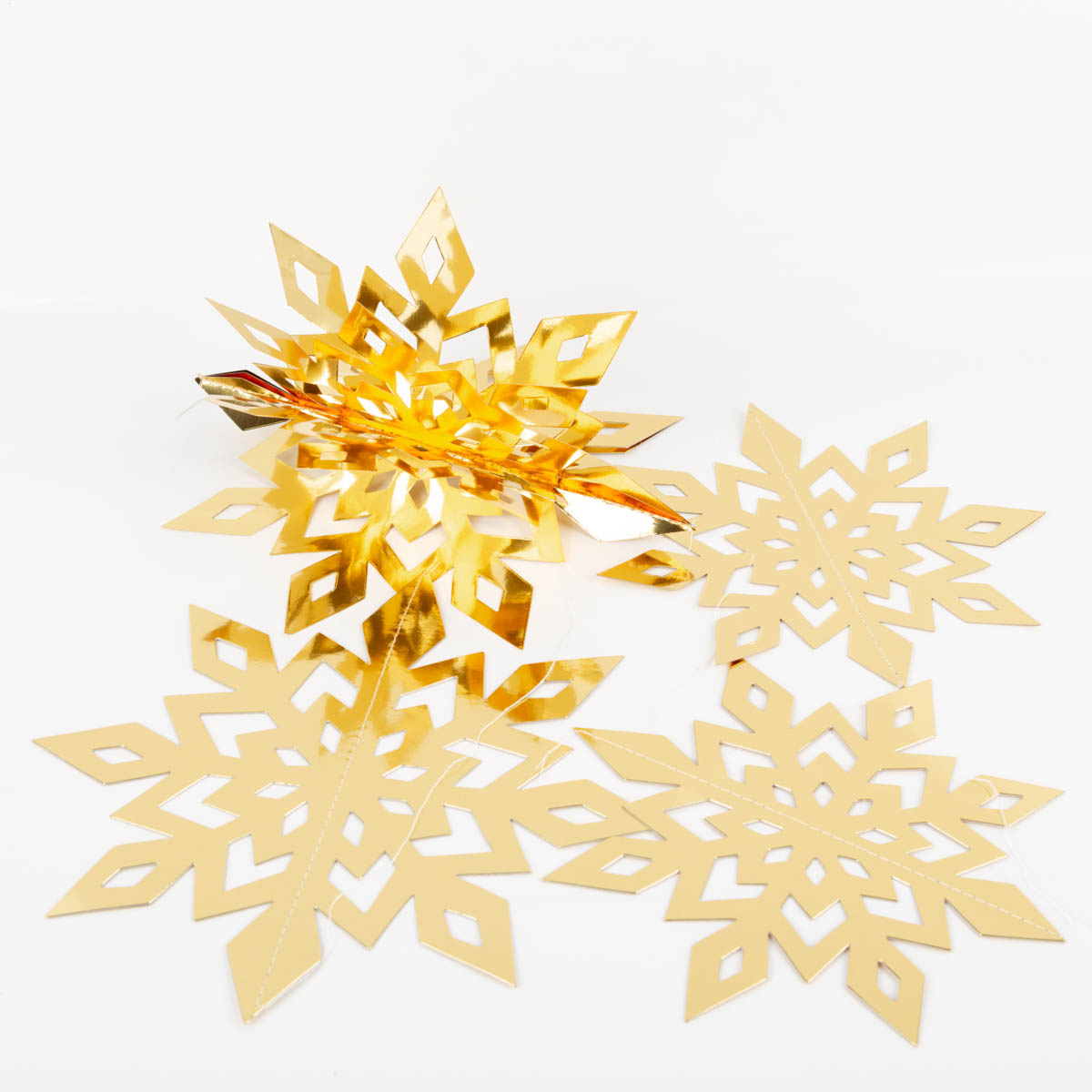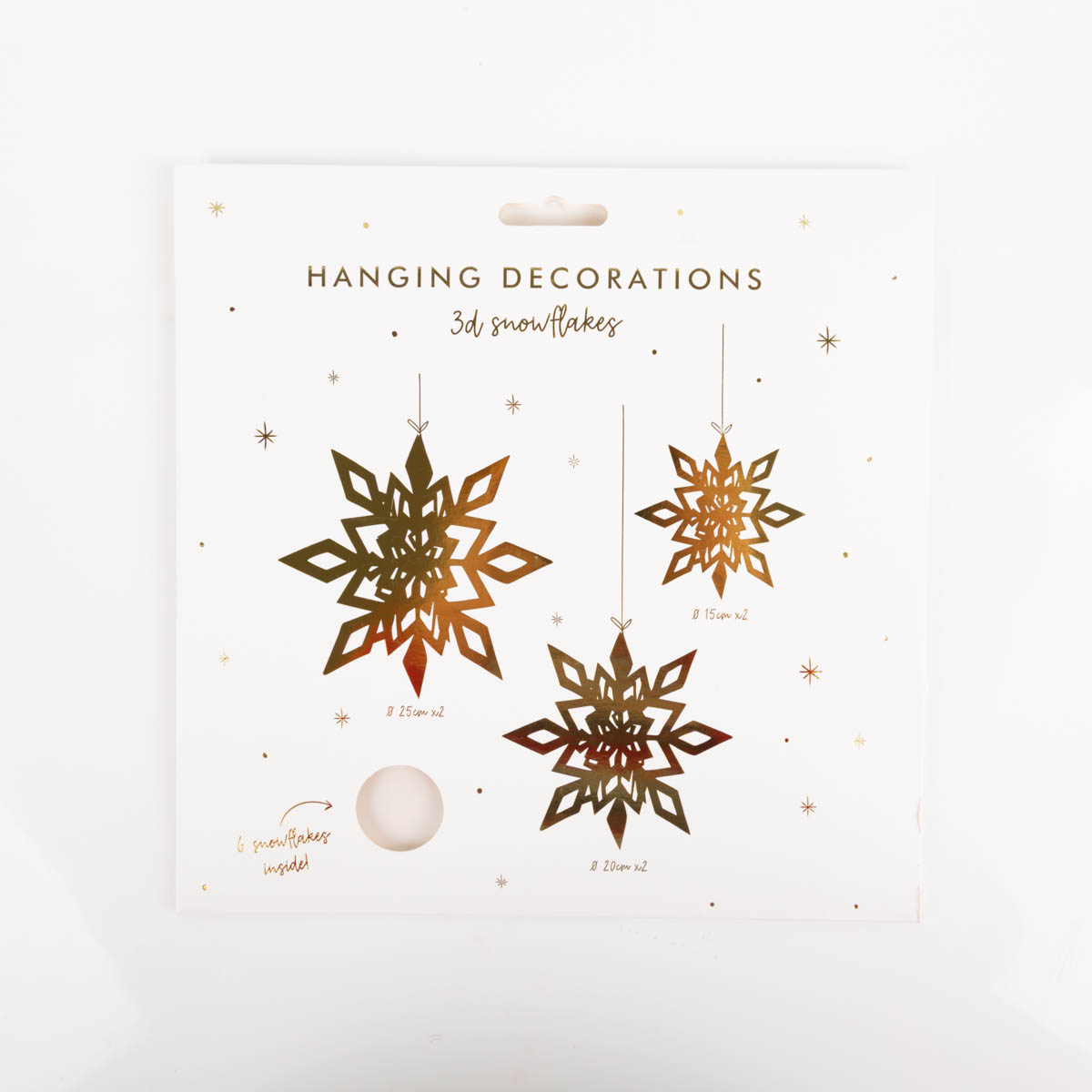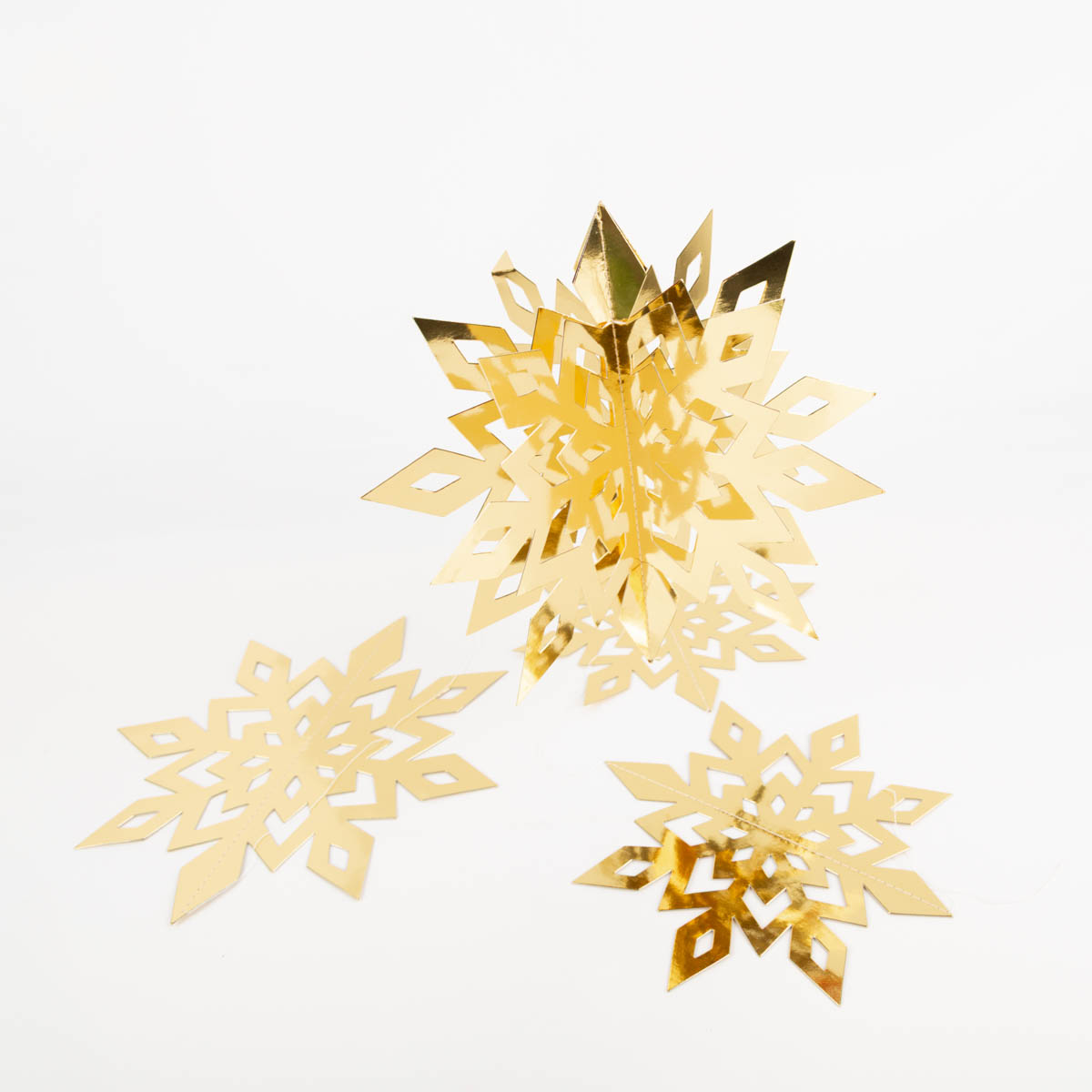 Mit diesem 3D Schneeflocken Anhänger Set in Gold bringst du festlichen Glanz in deine Weihnachtsdeko. Die Schneeflocken bestehen aus stabilem Papier, kommen flach verpackt und lassen sich im Handumdrehen auffalten. Danach erstrahlen sie in ihrer vollen 3D-Form mit sechs aufgefächerten Seiten.