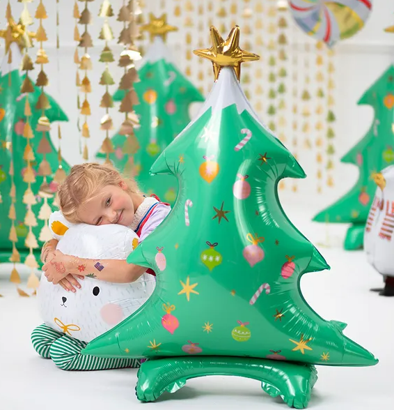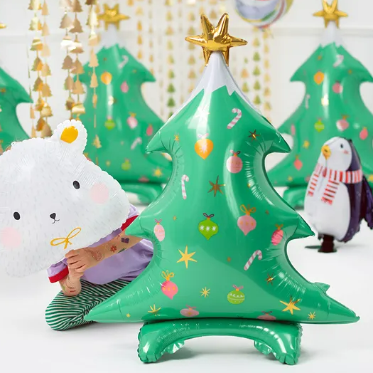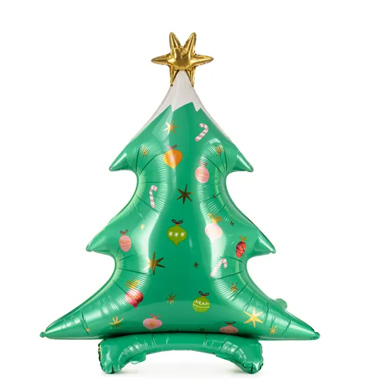 Der Weihnachtsbaum-Ballon ist in sattem Grün gehalten und mit farbigen Kugeln, Sternen und Zuckerstangen bedruckt. Die goldene Sternspitze sorgt für einen festlichen Akzent. Durch das leichte und zugleich stabile Material kannst du den Ballon ganz einfach mit Luft aufblasen – ganz ohne Helium.