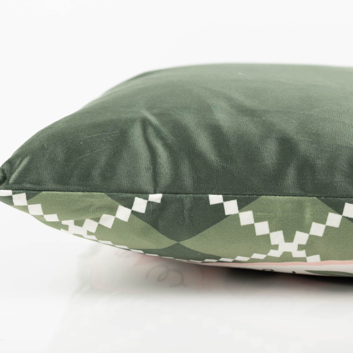 Bezug: Vorderseite bedrucktes Velour, Rückseite uni grün
